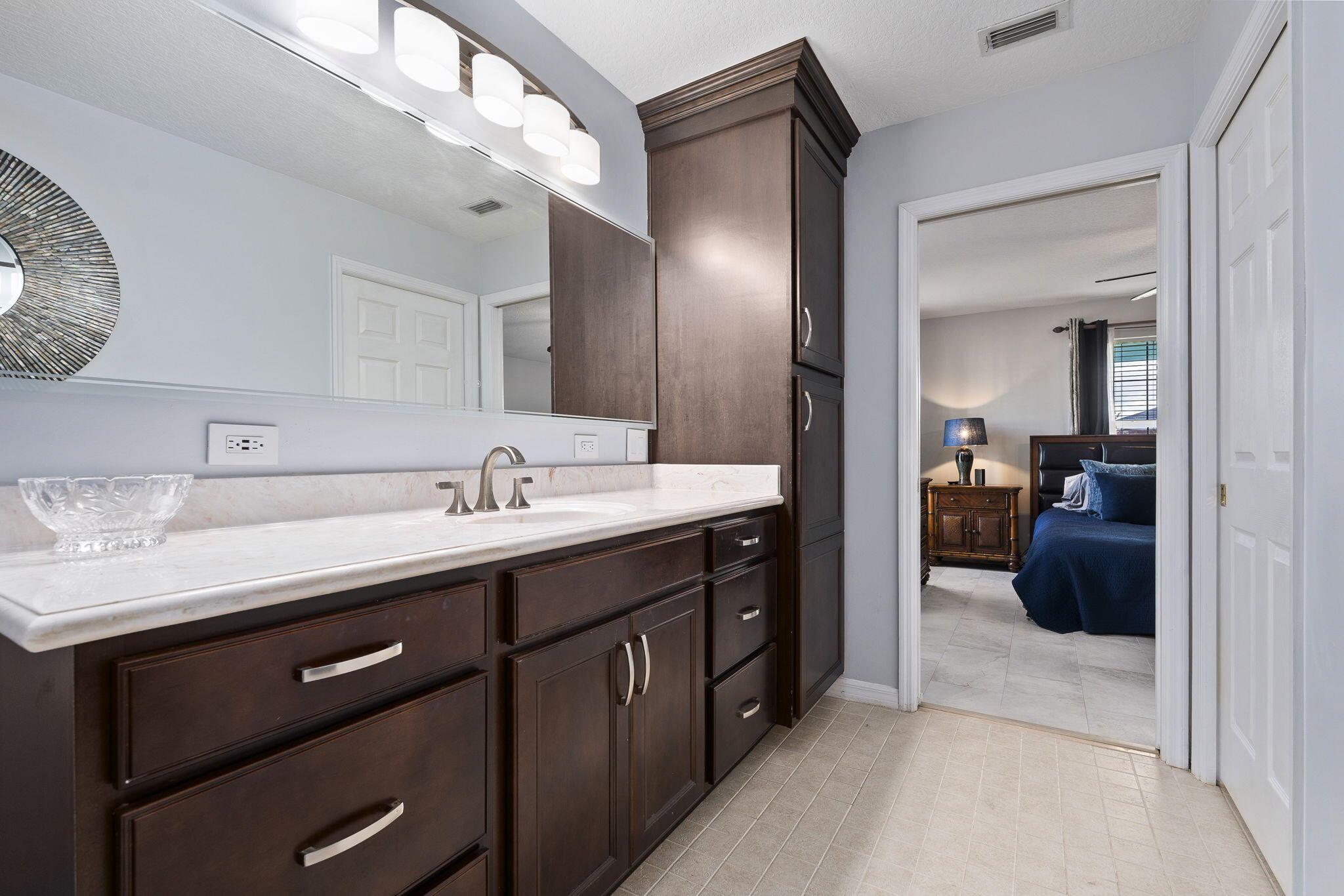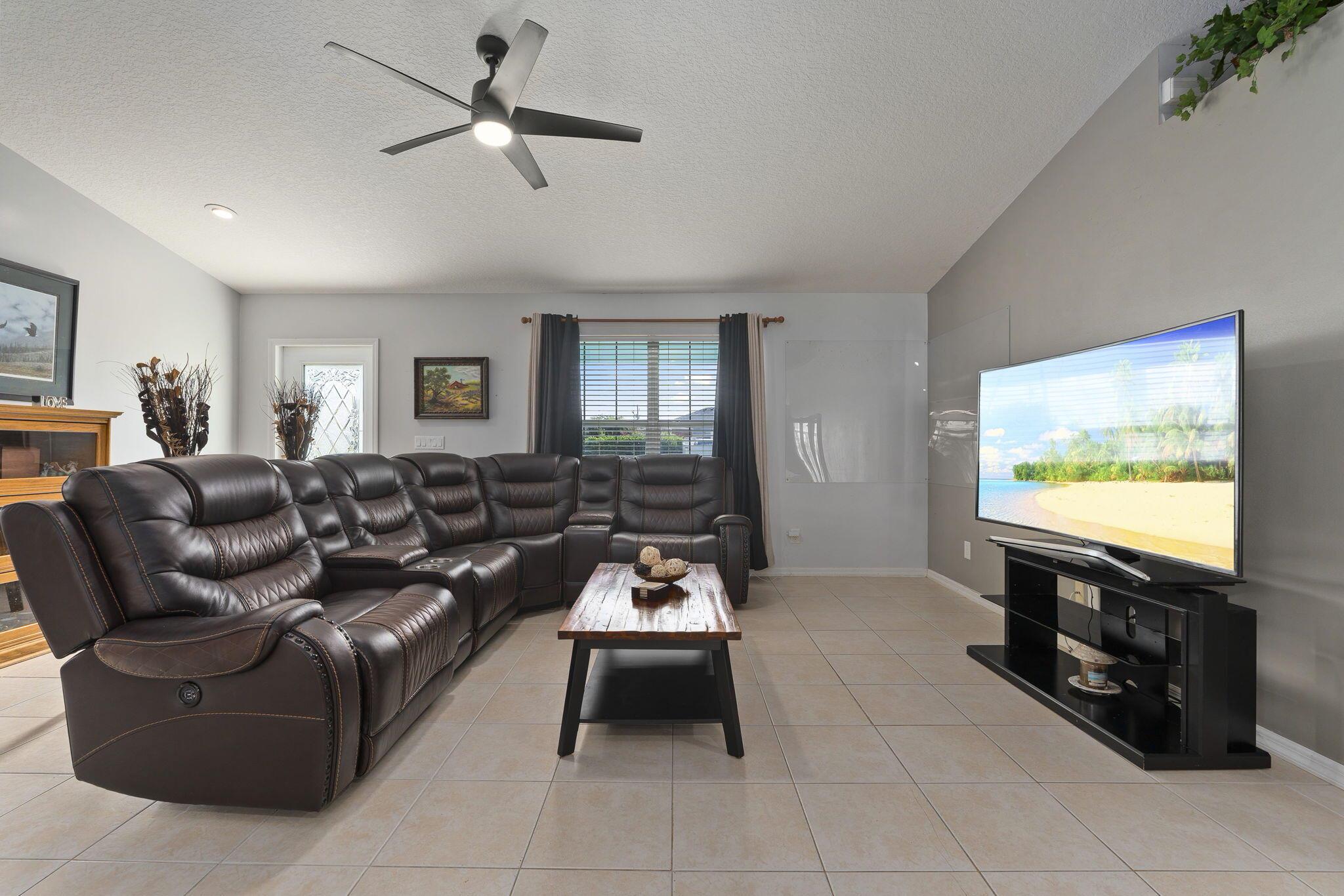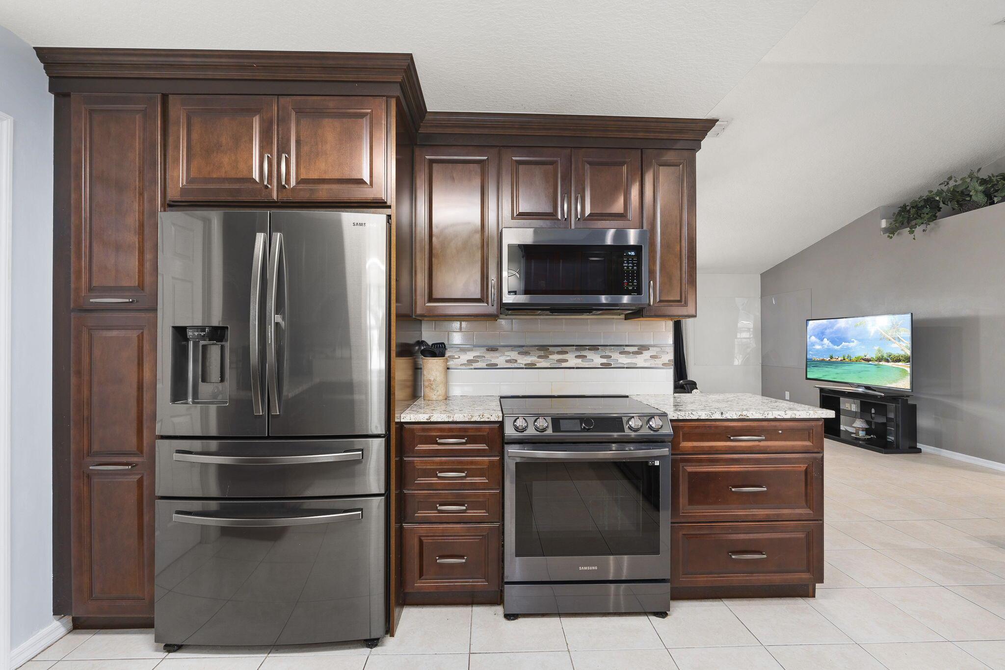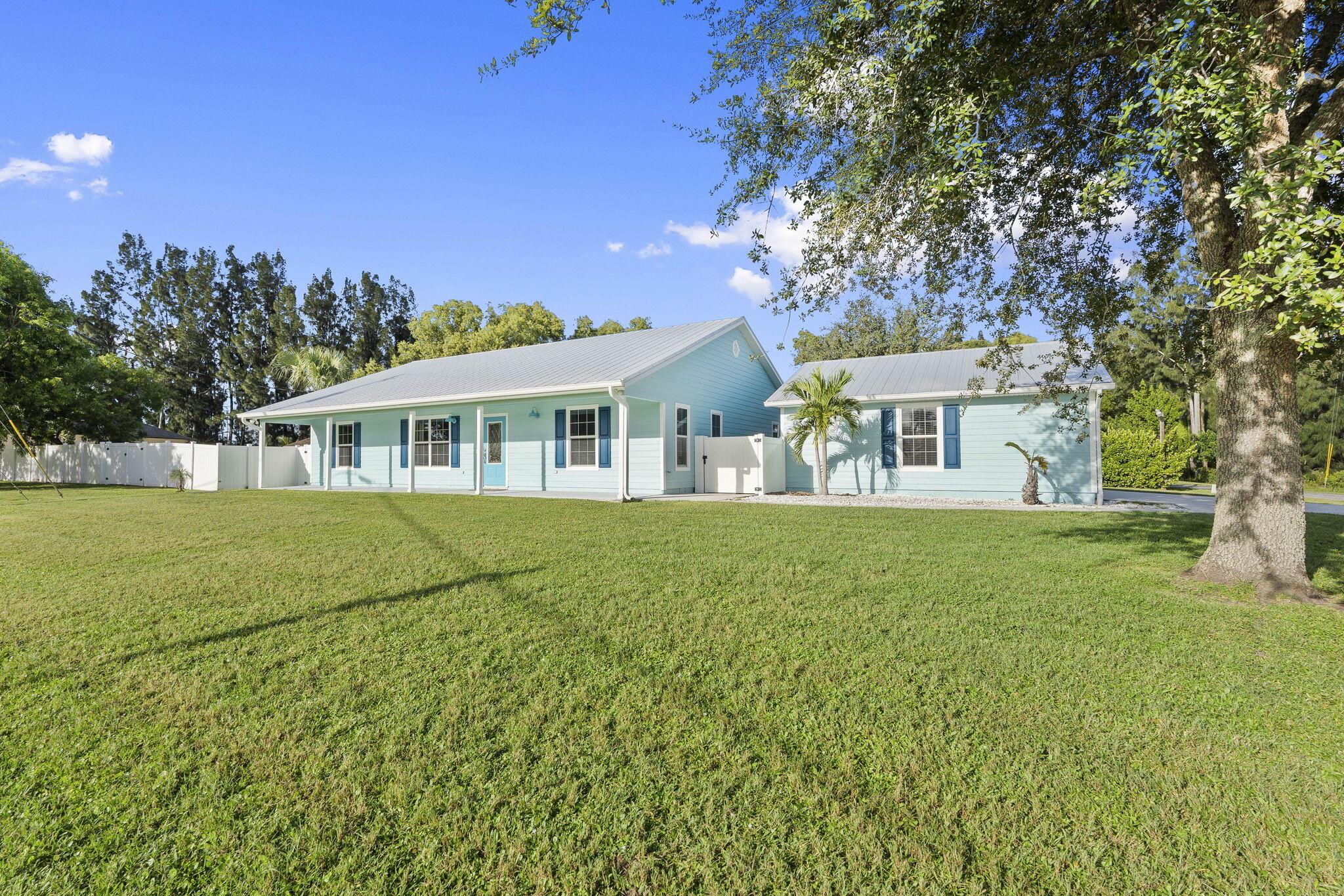 Welcome to a home that blends Florida charm with thoughtful upgrades and a ranch-style retreat set on a rare 0.57-acre double lot with, Hardie board siding, and a metal roof, this home was designed for both energy efficiency and lasting quality.Step inside to vaulted ceilings and a bright, open floor plan. Tile flows throughout the main living spaces, and primary bedroom, while two guest bedrooms feature carpet. The kitchen offers dark wood cabinetry, granite countertops, a breakfast bar with seating for three, and stainless Samsung appliances perfectly designed for cooking, entertaining, or gathering with family.