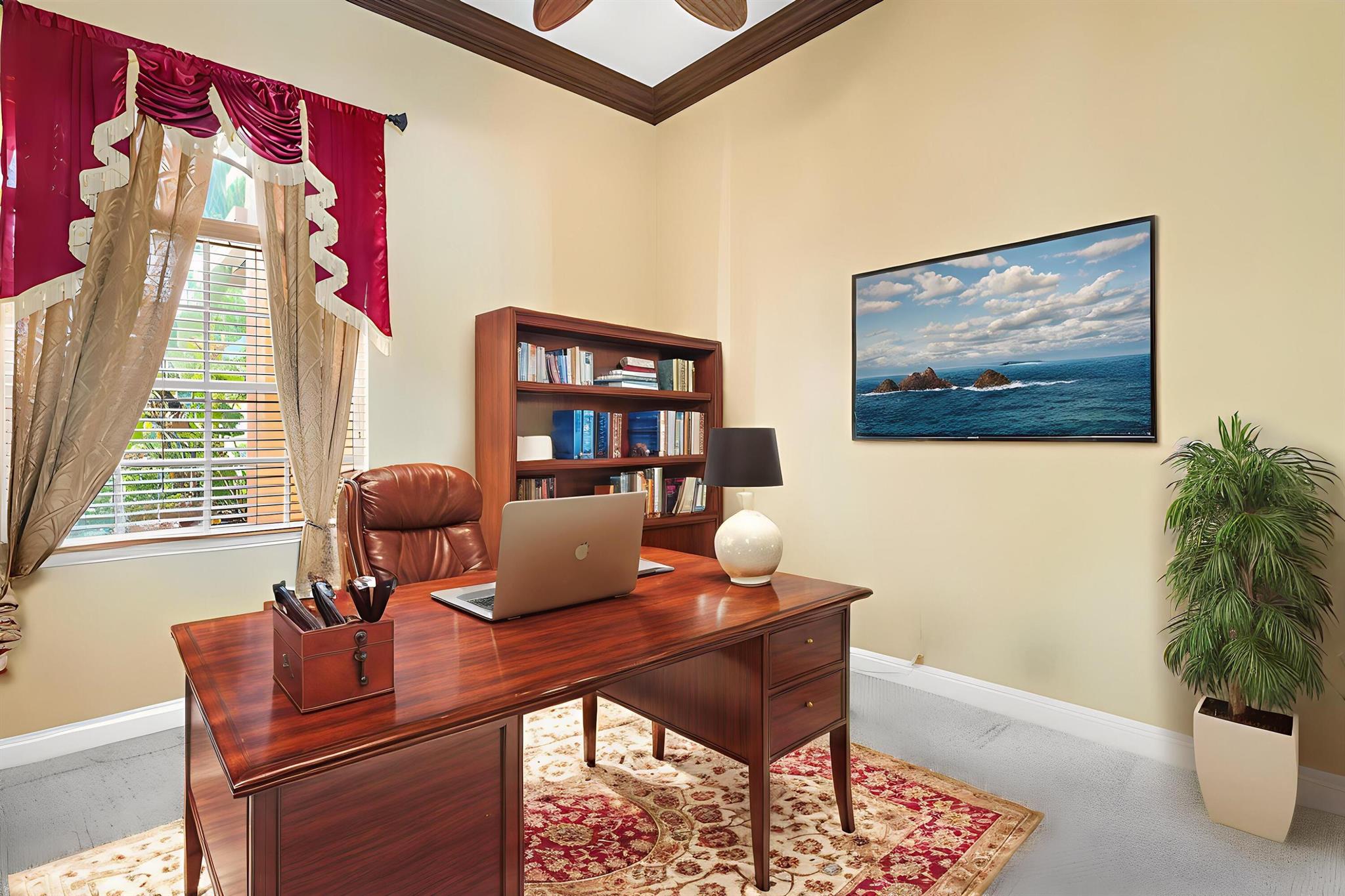 Welcome Home! This immaculately maintained 5-bedroom, 4-bathroom pool home with a 3-car garage is what you've been looking for. Enjoy soaring high ceilings, upgraded crown molding, partial water views, and a spacious 3-way split floor plan. The primary suite, located on the first floor, features a cozy sitting area, his-and-hers walk-in closets, and a luxurious en-suite with dual vanities, a soaking tub, and a separate walk-in shower. An additional full bedroom and bathroom are also conveniently located on the main level as well as a den that could be a 6th bedroom. Upstairs, you'll find a loft, plus 3 additional bedrooms and 2 additional full bathrooms. The kitchen offers newer stainless appliances and beautiful dark granite countertops.
