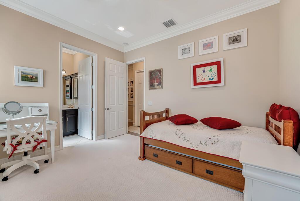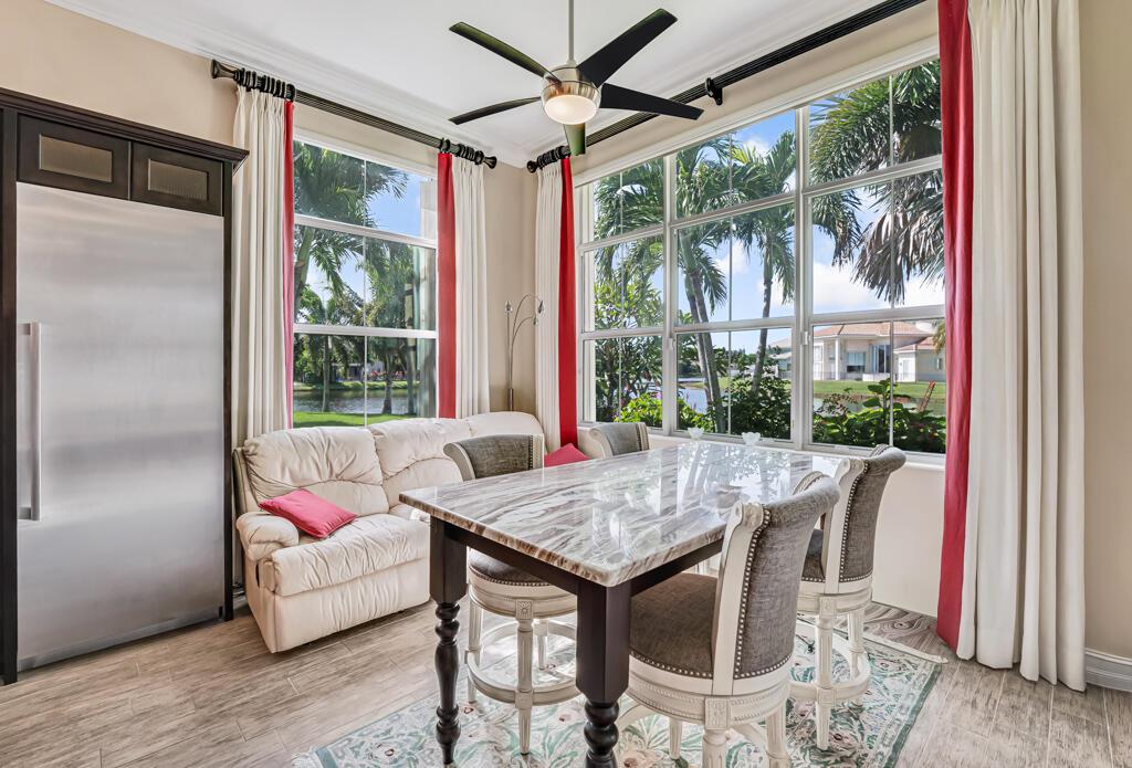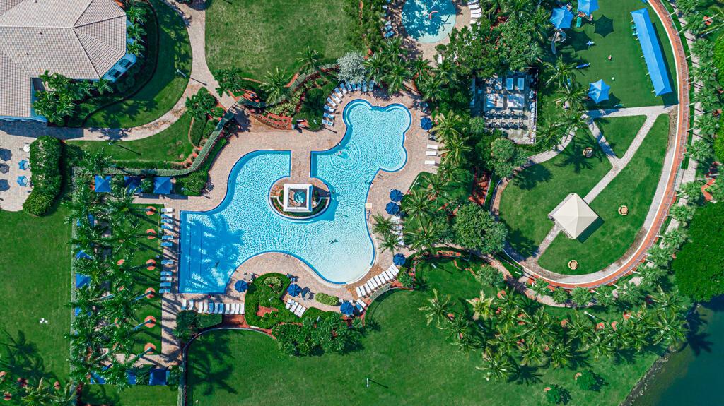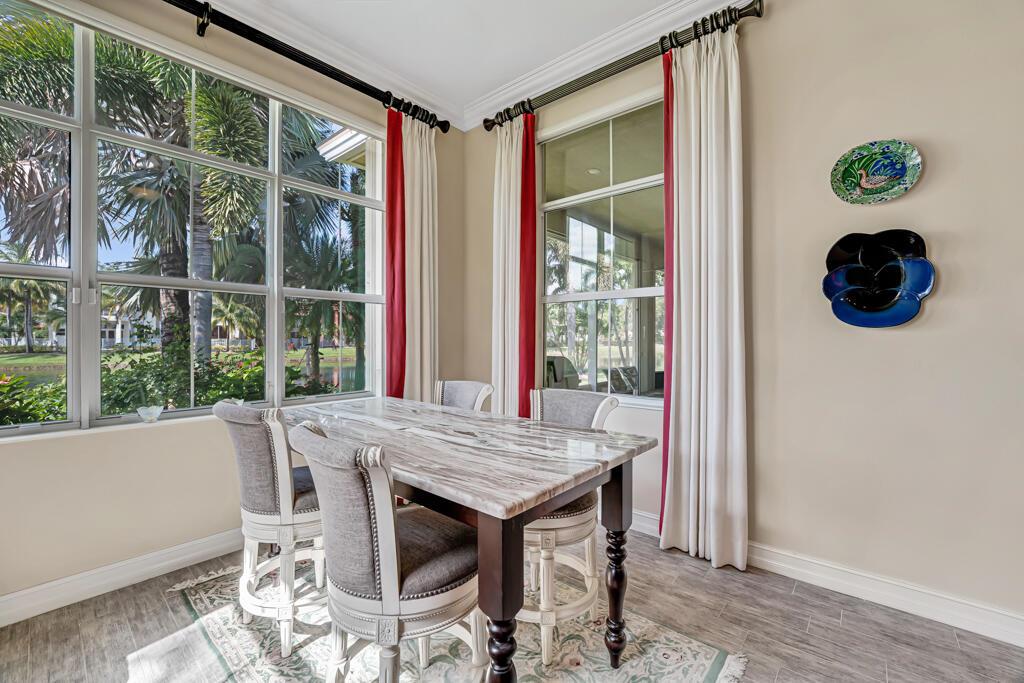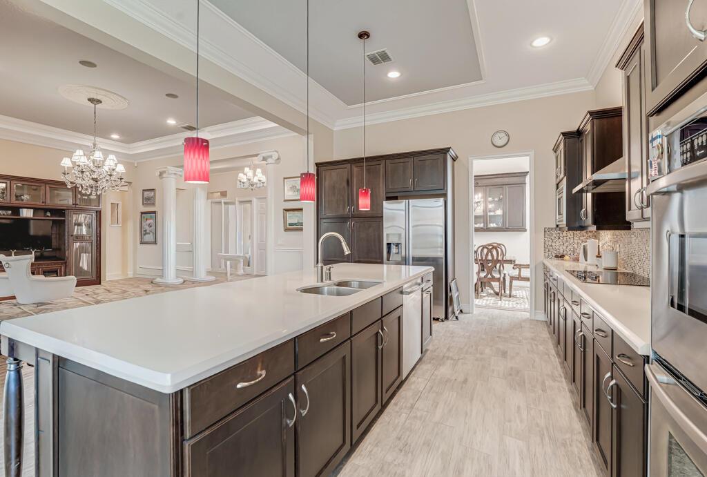 This elegant one-story home offers over 4,000 square feet of living space and is situated on a large pie-shaped lot at the end of a quiet cul-de-sac. Once part of the community's model row, the property is surrounded by expansive lakefront views, providing nearly 180 degrees of stunning water scenery.Notable features include a three-car garage, three private bedrooms, and a spacious club room currently used as an office. The home showcases high-end finishes such as crown molding throughout, 11-foot coffer ceilings, neutral tones, and light tile flooring across the main living areas.The primary bedroom wing offers exceptional comfort with red oak flooring, dual custom walk-in closets and separate his-and-hers bathroom areas, creating a private retreat within the home. Olympia