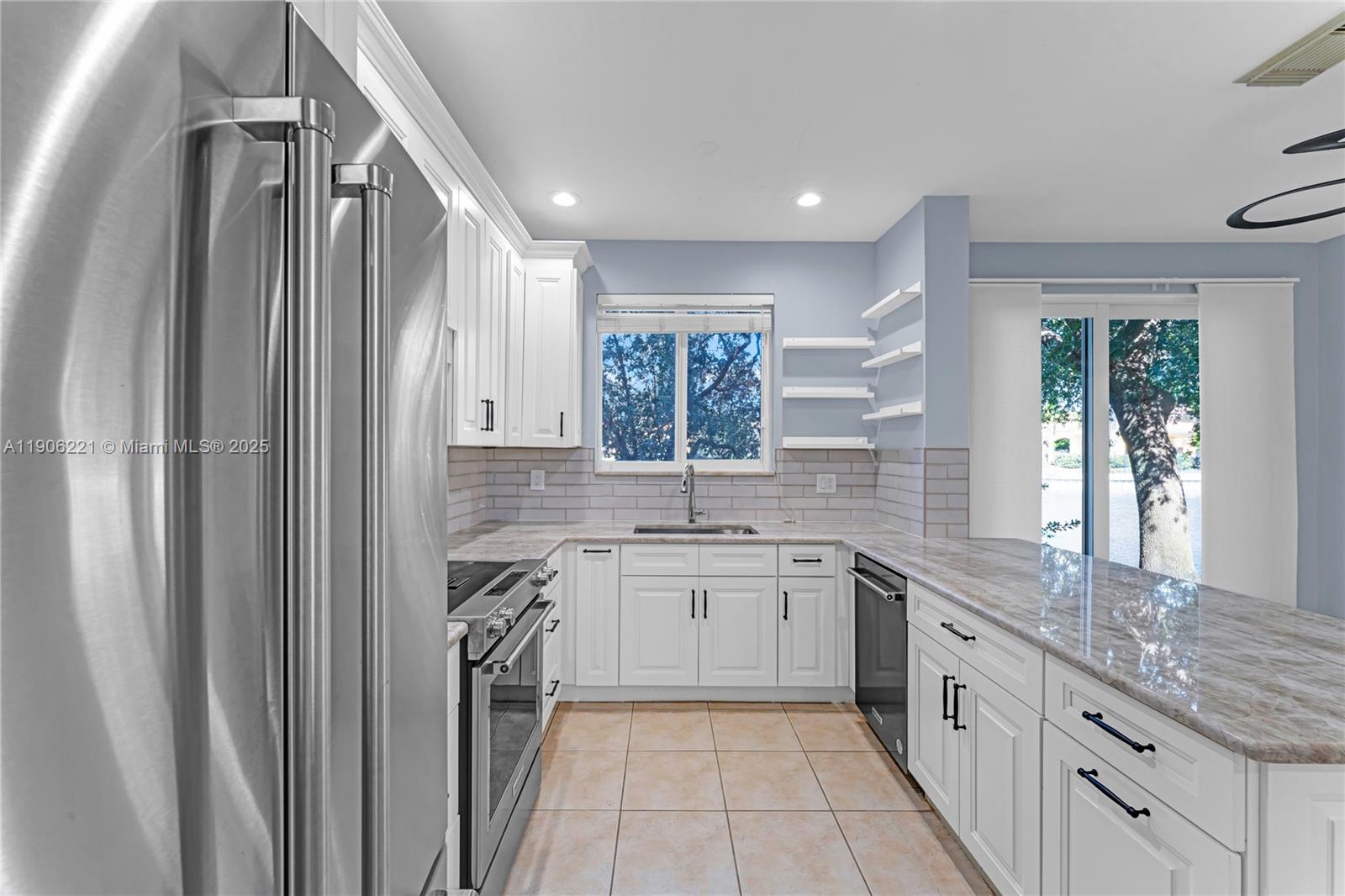 Fully renovated 2 bed, 2.5 bath townhouse featuring a modern open-concept design with a gourmet white kitchen with marble countertops, tile floors, and a chic wood-slat accent wall. Enjoy premium upgrades: whole-house water filtration system, hurricane impact windows/doors, stylish Zebra blinds, and new Samsung washer and dryer. Both baths are custom-remodeled, including a glass walk-in shower with pebble floor. This home offers high-end style and ultimate protection.