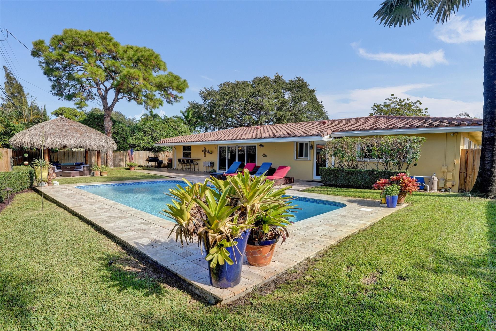 Experience the relaxed South Florida lifestyle in this private tropical retreat located in the heart of Coral Ridge Isles. This 4-beds, 2.5-bth home offers comfort, and easy living. The gourmet kitchen features granite countertops, a copper sink, stainless-steel appliances, and a wine bar that opens to a dining and family area perfect for entertaining. Step outside and unwind by the refinished Diamond Brite pool under the tiki hut, complete with a built-in grilling area and lush landscaping. Nestled in one of Fort Lauderdale's most desirable neighborhoods, enjoy quiet, tree-lined streets just minutes from the beach, top dining and shopping, Holy Cross Hospital, and private schools like Pine Crest, Westminster Academy, and St. Mark's.