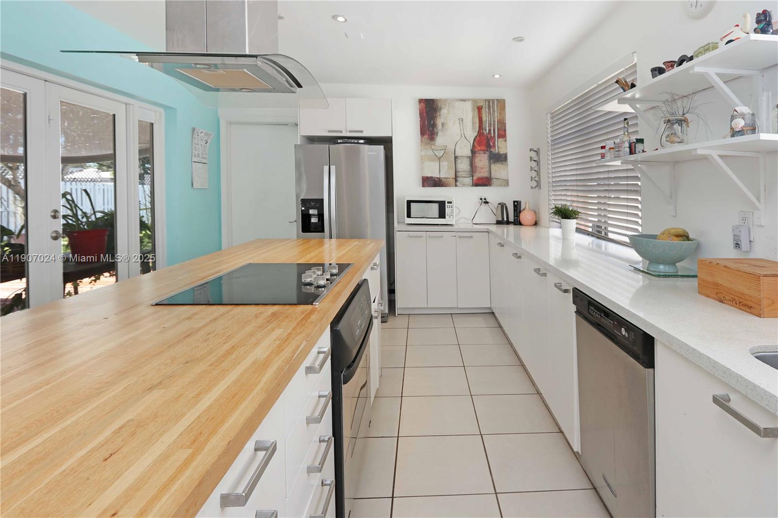 A beautifully maintained 3-bedroom, 2.5-bath home with 1-car garage perfectly located in one of Hollywood Hills! This home features a spacious layout with tile flooring and a bright, inviting atmosphere. The updated kitchen offers quartz counters, stainless steel appliances, recessed lighting, and a stunning butcher block island. French doors open to a covered patio and fully fenced backyard—complete with a spacious deck for entertaining, additional rear parking with alleyway access, and a half cabana bath with direct access to the outdoor area. Major upgrades include a roof less than 5 years old, A/C approx. 3 years old, and a newer water heater (approx. 1 year). Additional highlights include a private well, a large circular driveway, and plenty of space to add a pool!