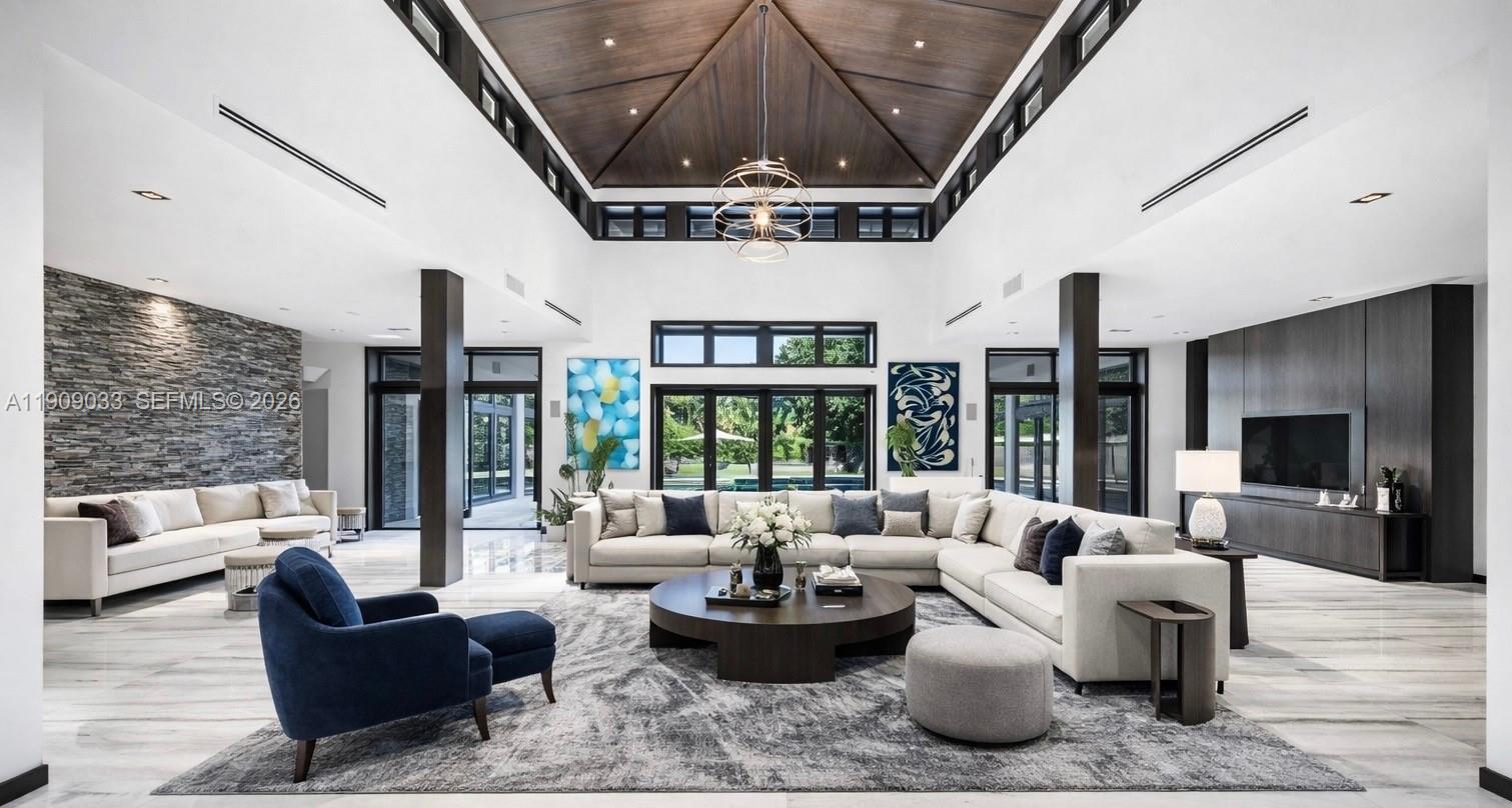 Welcome to The Sanctuary at Pinecrest, a private haven of modern elegance and timeless design. This gated estate offers approx. 11,300 SF of living space on a 1.16-acre lot with 7 bedrooms and 11 baths, including two luxurious primary suites. Soaring ceilings, walls of glass, and refined finishes define the interiors, featuring a chef’s kitchen, formal and casual living areas, gym, media room, office, and guest quarters. Outdoors, enjoy an infinity-edge pool, summer kitchen, covered terraces, PRIVATE TENNIS COURT, and two fountains framing the main entrance. Complete smart-home automation, elevator, and lush tropical landscaping enhance this architectural masterpiece. The images has been digitally altered for virtual staging.