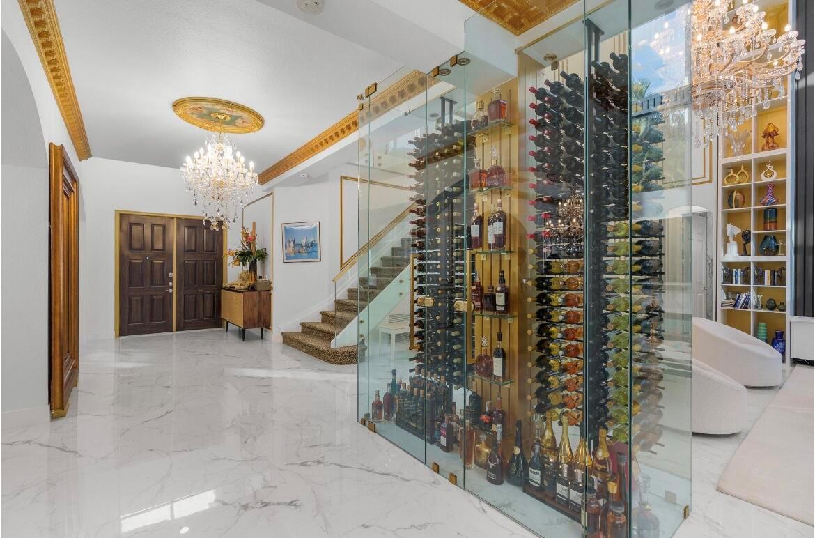 This exquisite home offers an open floor plan with high-end upgrades throughout. The main level features new 32''x32'' white and gray porcelain tile, glass stair railings, crown moldings, and a renovated kitchen and guest bath. A custom 300-bottle wine cellar adds sophistication. Recent updates include a resurfaced pool and new carpet on the stairs and all upstairs bedrooms. A first-floor den or office with a full bath provides flexibility. Enjoy lush landscaping, a beautiful pool, a covered screened patio, and a private screened balcony off the primary suite.