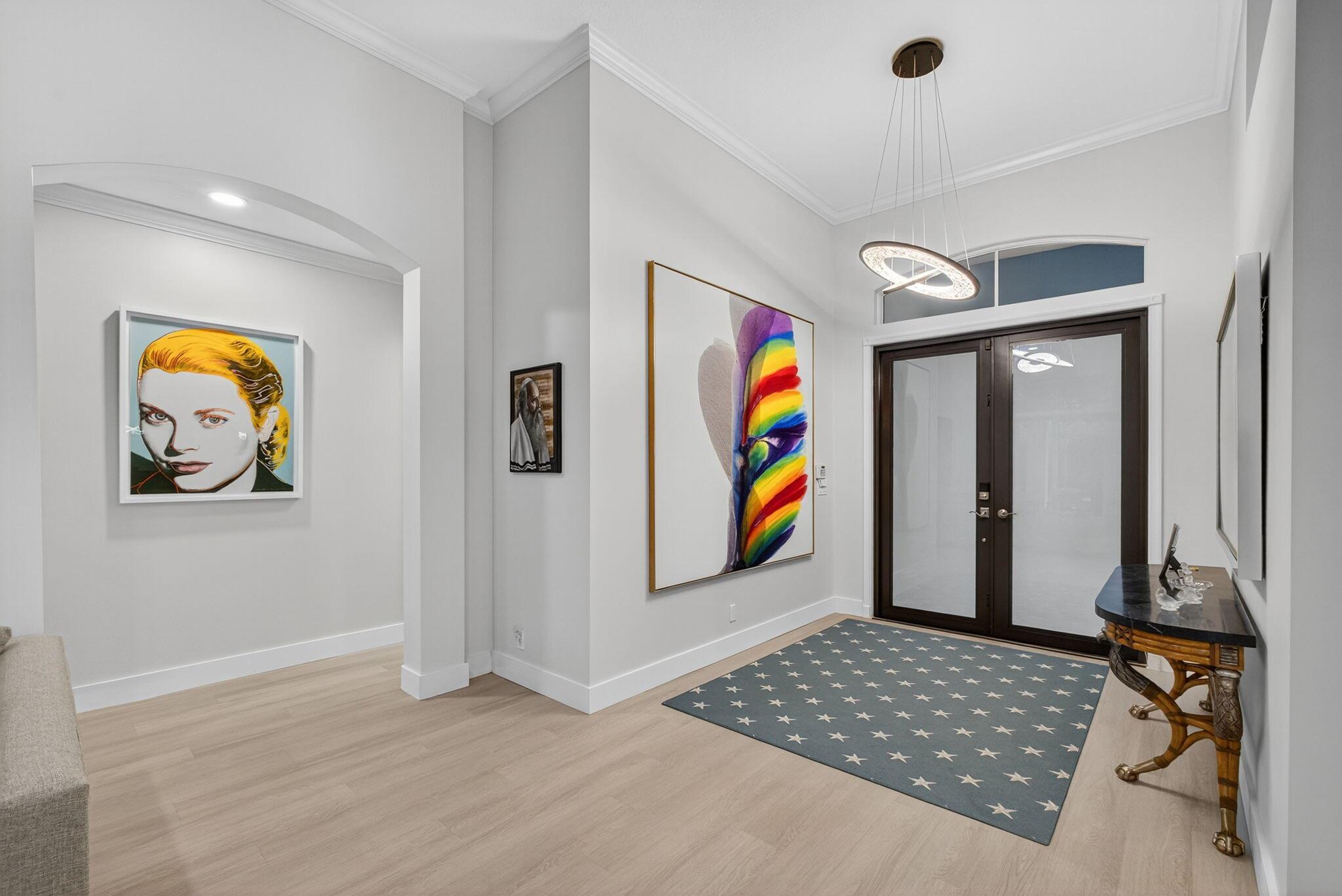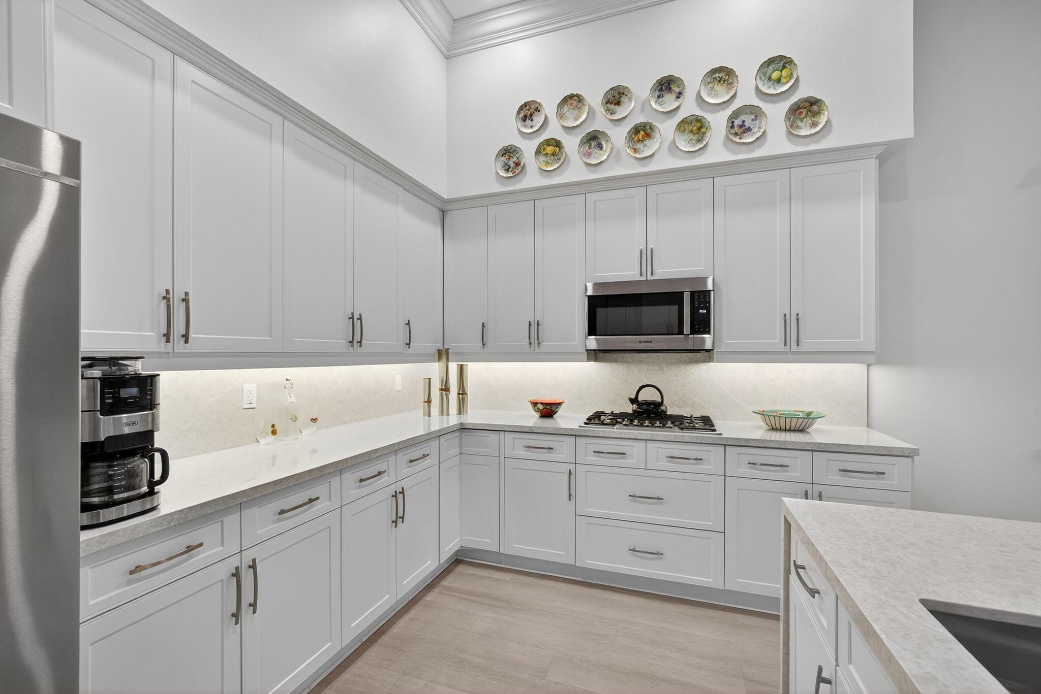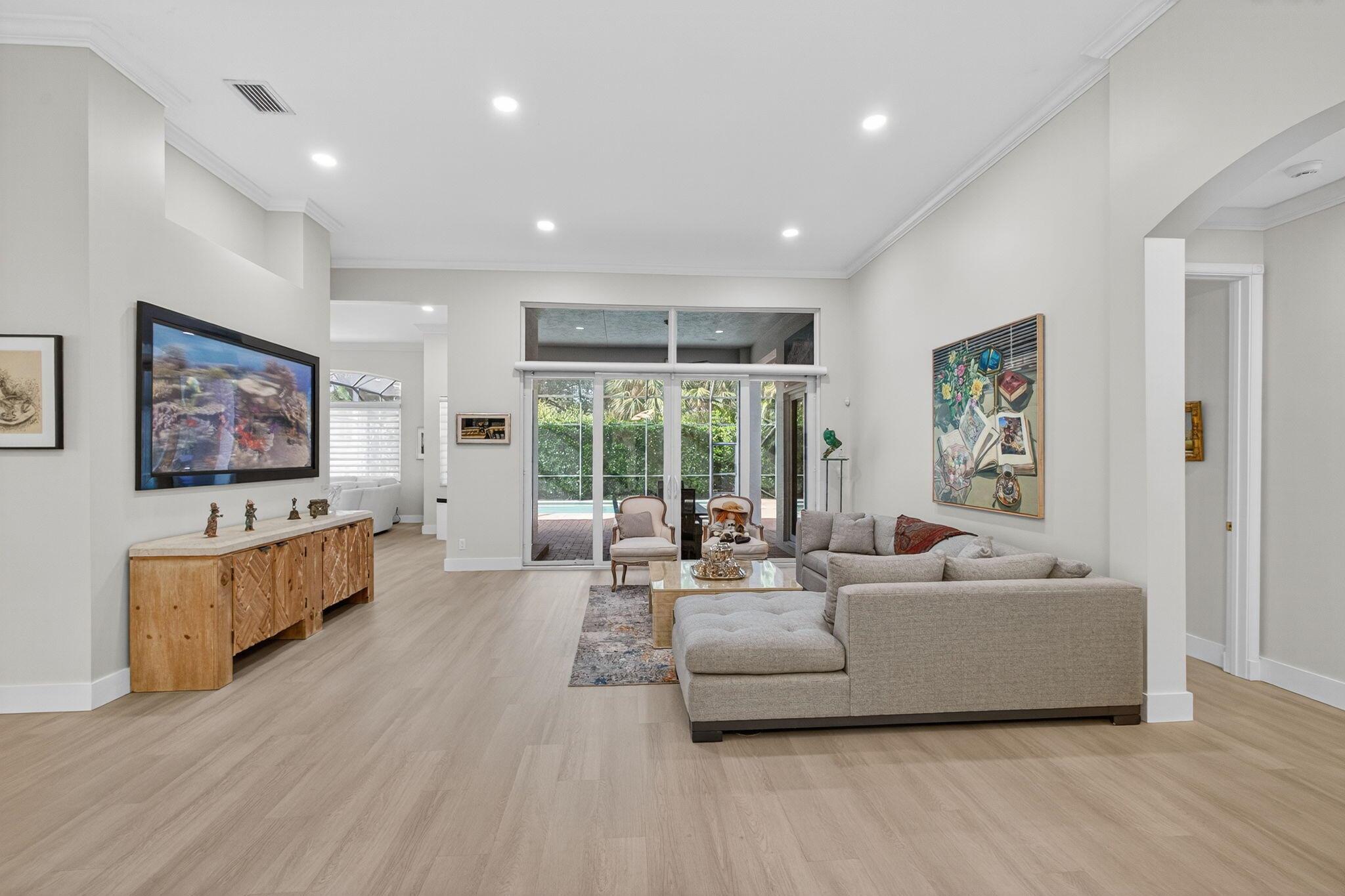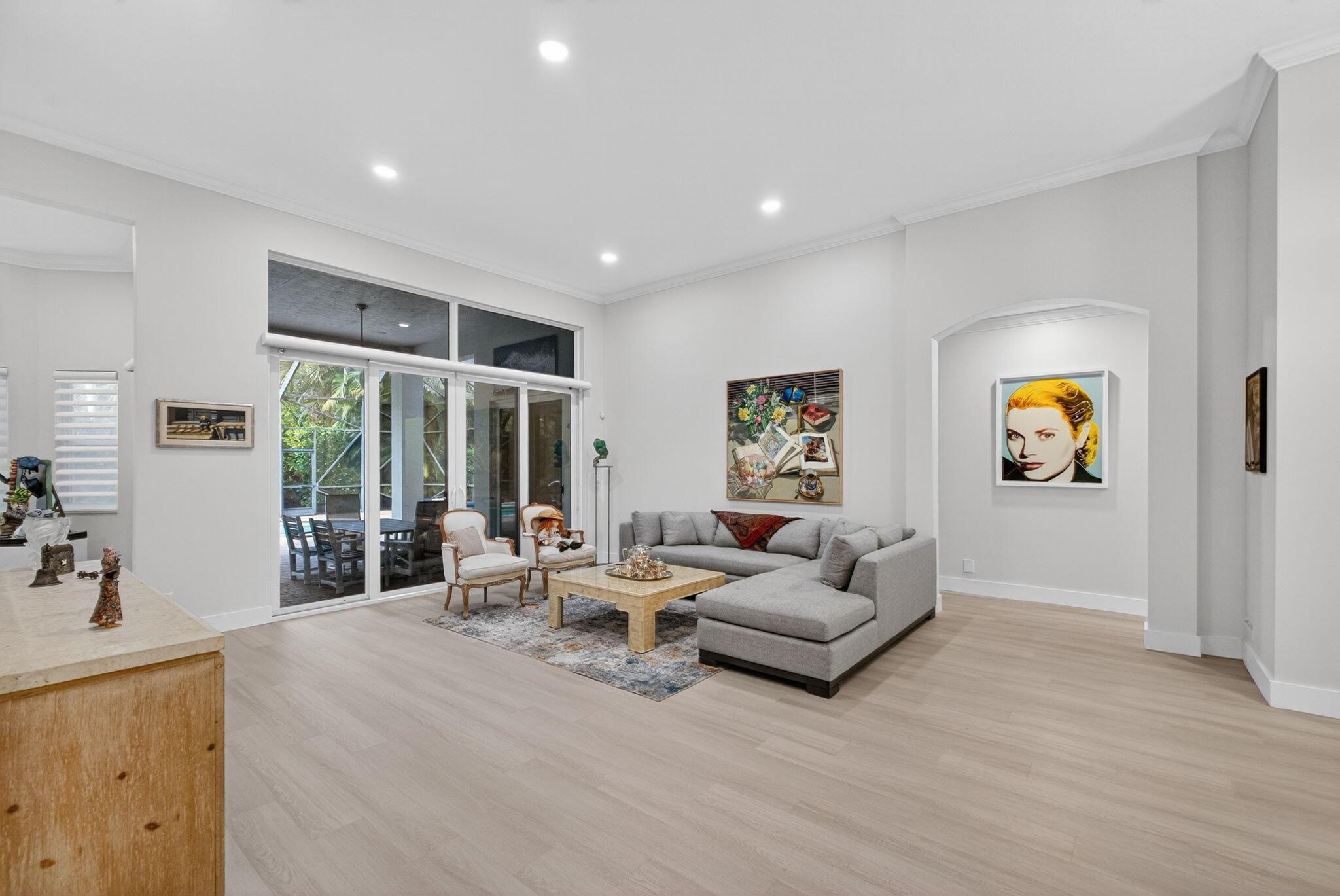 Must see this Beautifully remodeled one-level pool home in one of best gated communities in PBG. This 4-bedroom, 3 full bath ranch home has one of the nicest and most open floor plans in all of Mirabella. Renovated gourmet kitchen open to the family room features quartz countertops with a waterfall edge center island and matching quartz backsplash. High-end Bosch appliances & refinished wood cabinetry. All new light fixtures & LED recessed lighting throughout the home. Upgraded plank composite wood flooring throughout the entire home with upgraded wood base & crown molding. Large saltwater pool with screened enclosure, outdoor shower & large covered lanai area. Full impact glass windows & doors, whole house backup generator, custom automated Hunter Douglas window treatments + much more!