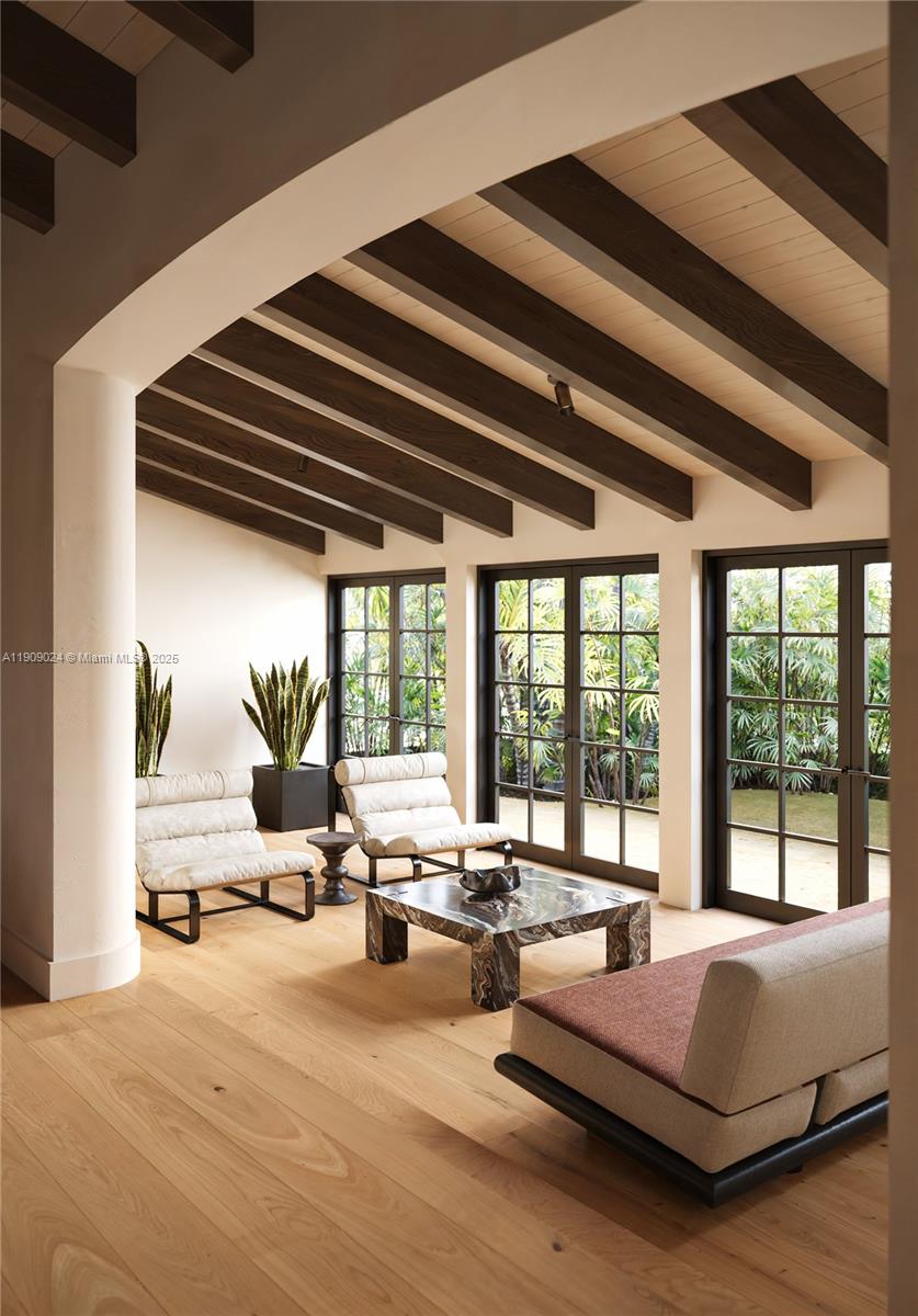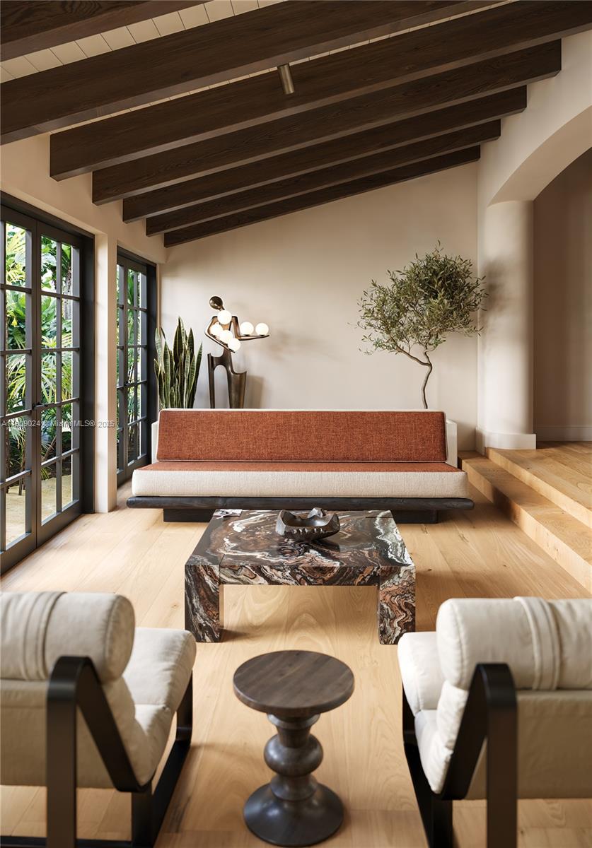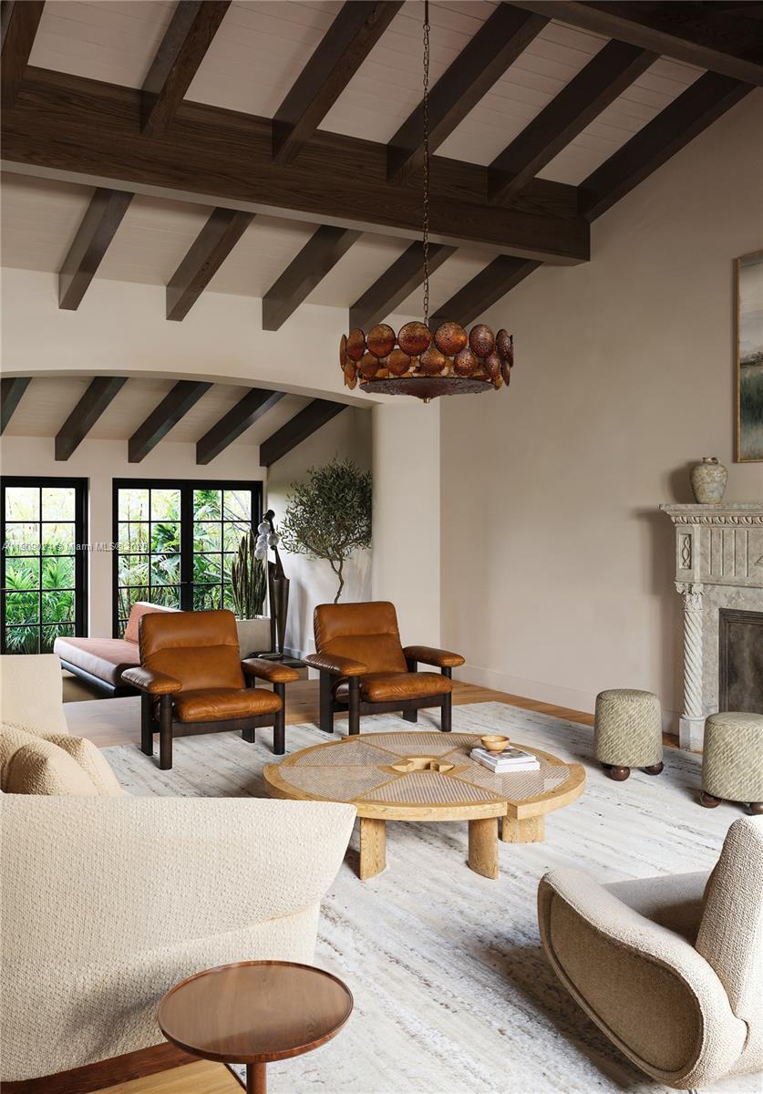 LOCATED ON PRESTIGIOUS NORTH BAY ROAD THIS CHARMING MEDITERRANEAN FAMILY VILLA IS WRAPPED IN LUSH GREENERY FOR TOTAL PRIVACY & SECURITY! Gated Entry into this Beautiful Family Home with Pool. Timeless Architecture reimagined with Modern Elegance on Iconic North Bay Rd. Developed by Carolwood & re-designed by BuiltIN studio/Gary Eisner, this approximate 4,000 square foot house sits on a 10,000 sqft estate, for resort style living. Main house offers 4BD/5BA, detached pool house with sauna and cold plunge, powder room, and outdoor shower. Soaring vaulted ceilings and new wood flooring throughout interiors anchored by an original limestone fireplace. White oak kitchen with SubZero appliances and Waterworks fixtures, travertine-accented baths, custom millwork, custom steel windows and doors.