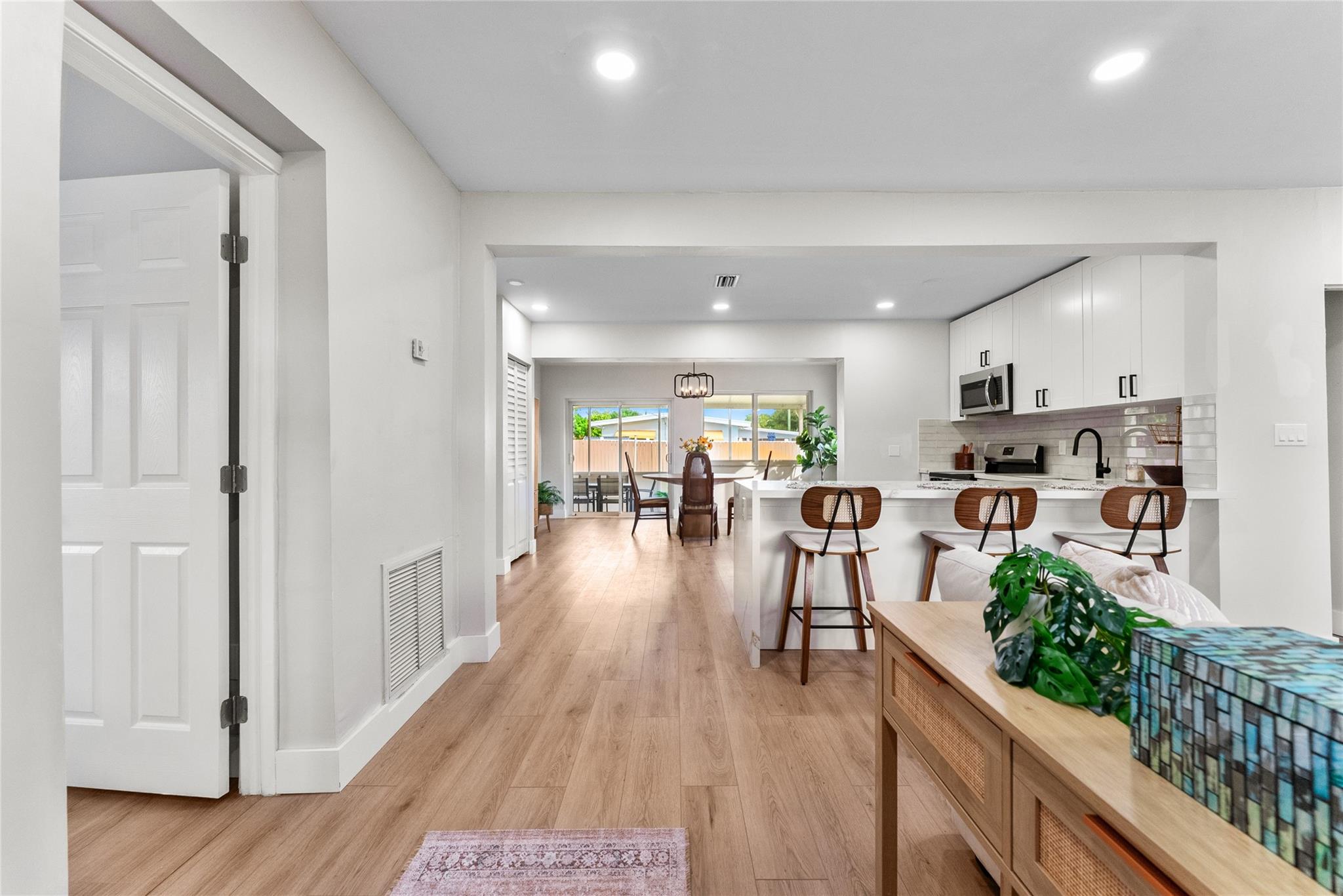 Fully renovated and move-in ready! This bright, open-concept home features a new kitchen with shaker cabinets, quartz countertops, stainless steel appliances, and a large peninsula with seating. Enjoy a seamless flow from the kitchen to the living and dining areas—perfect for entertaining. Modern finishes throughout include luxury vinyl flooring, updated lighting, and a stunning bathroom with a walk-in shower and illuminated mirror. The spacious covered patio overlooks a large fenced yard with a fire pit and with plenty of room for a pool. New roof, impact windows, and updated systems add peace of mind. Conveniently located near shops, schools, restaurants, and major highways!