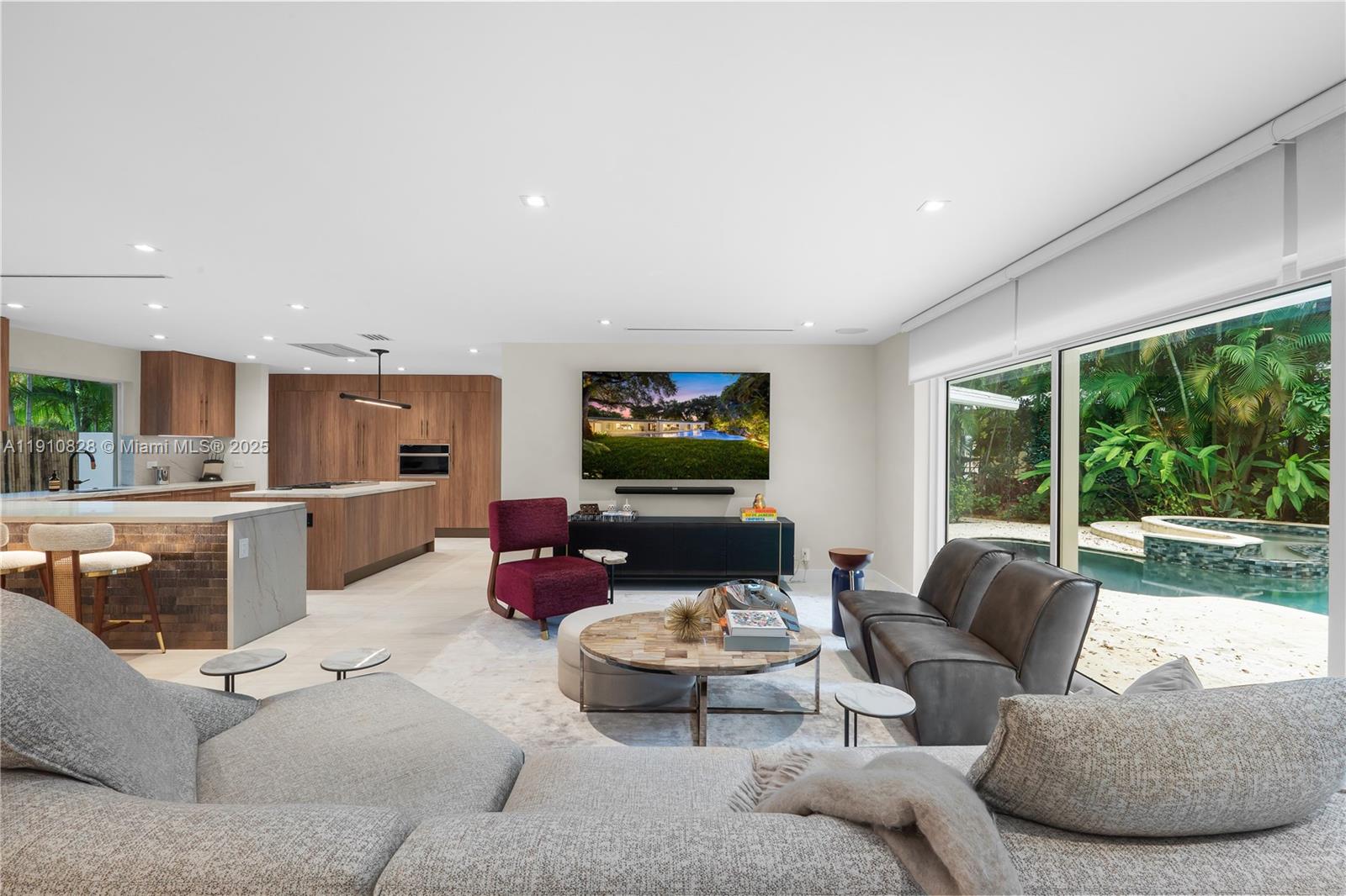 Mid-century modern home east of Biscayne in Miami Shores. This 4-bed, 3-bath residence sits on an expansive 12,000+ SF lot, minutes from top private schools. Sunlight floods the interiors through floor-to-ceiling impact glass, framing lush tropical greenery. Expertly reimagined, the home showcases custom European millwork, refined lighting & sophisticated finishes. The Italian Stosa kitchen features quartzite countertops, a 36" Monogram gas range, Wolf hood, Sub-Zero wine cooler & Dacor refrigerator. The primary suite offers a serene escape with a spa-inspired bath, soaking tub & garden outlook. Smart home upgrades include Lutron lighting, Bowers & Wilkins speakers, Vivint security & motorized shades. Outside, enjoy a heated pool, jacuzzi, coral stone driveway, and a canopy of grand oaks.