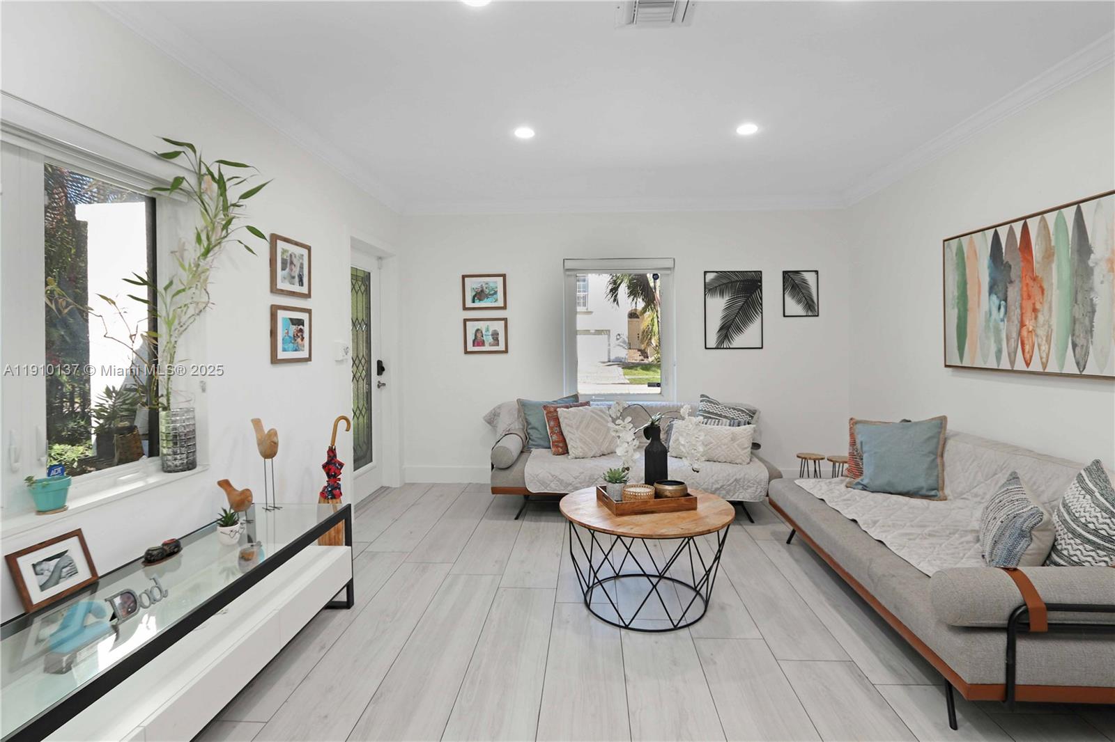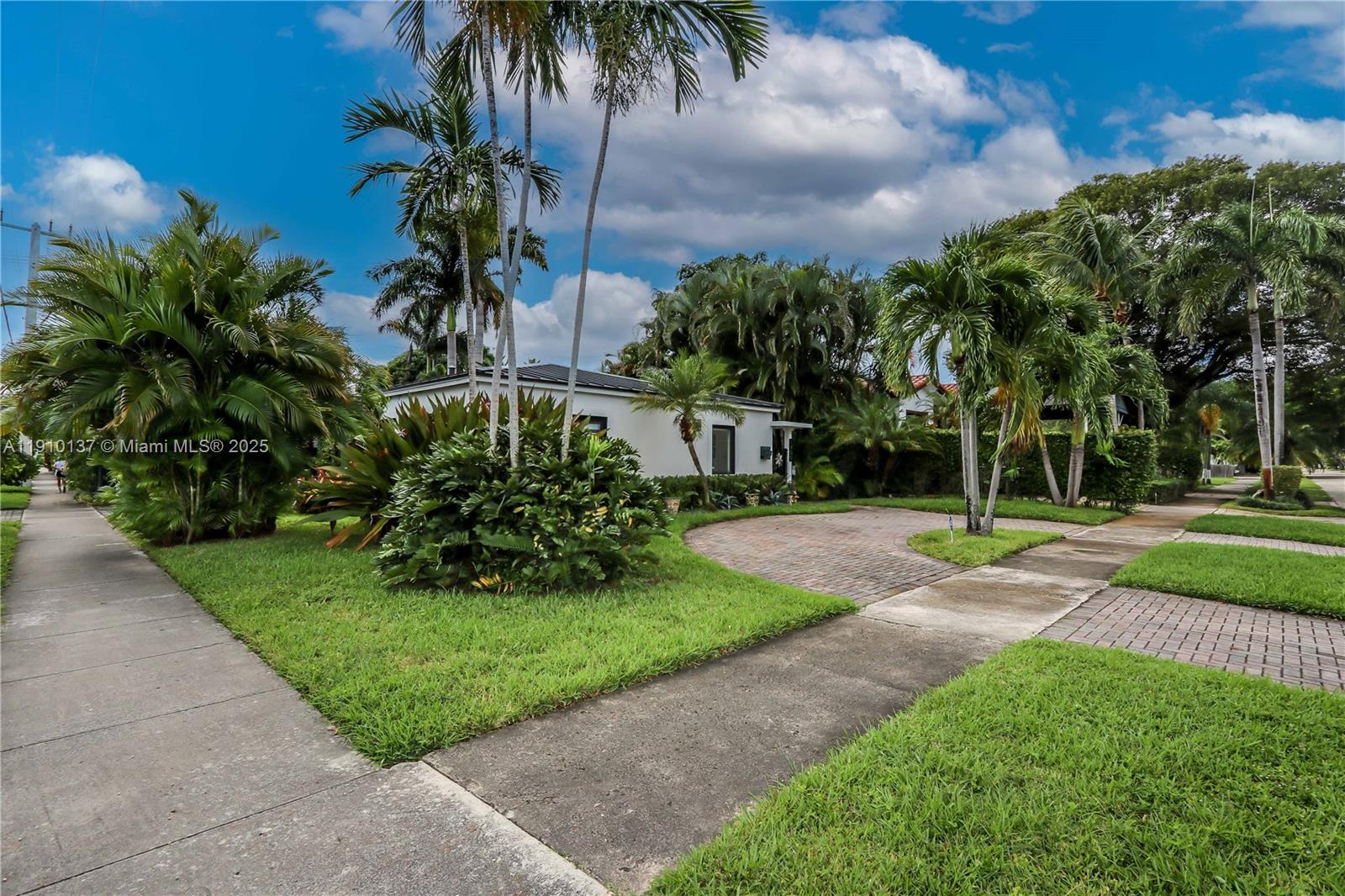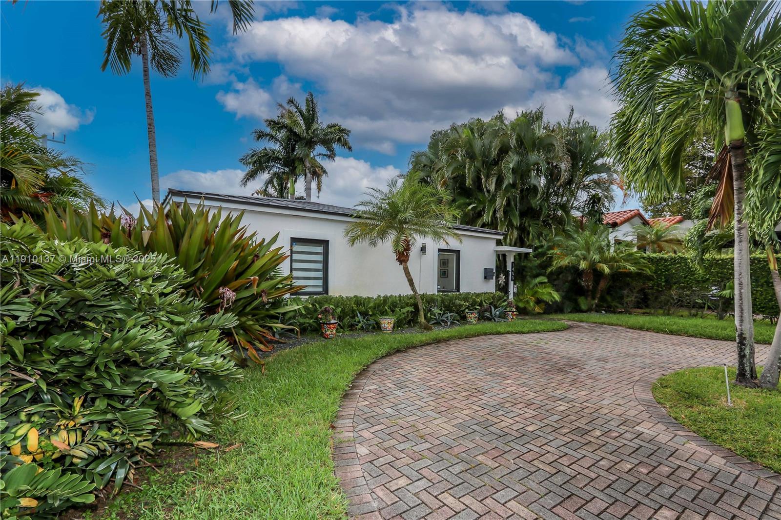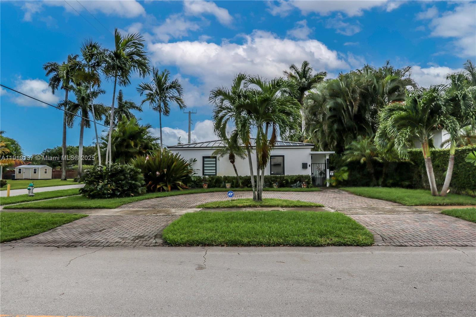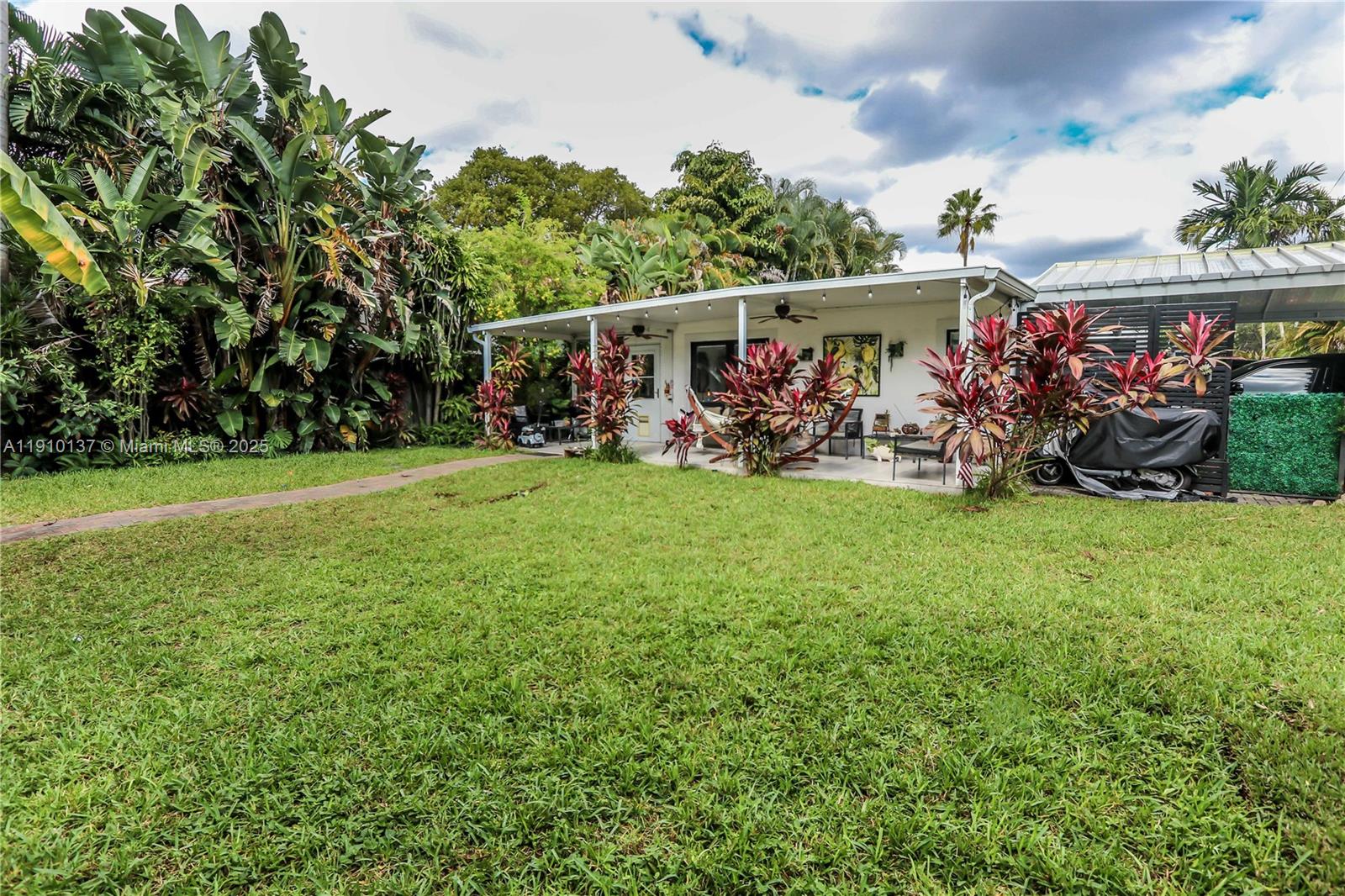 Stunning, high-efficiency 3 bed, 2 bath, 2-car carport home on a corner lot with beautiful lush landscaping! The custom kitchen features waterfall quartz counters, matching backsplash, gas stove, stainless appliances, farmhouse sink, wine cooler, + abundant storage. Enjoy a split floor plan with a formal dining room + sliders opening to a large covered patio ideal for entertaining. Upgrades include impact windows + doors, new gas washer/dryer, metal roof a few yrs old, gas tankless water heater, + a solar panel system! Both bathrooms are beautifully updated, + every room showcases custom closets, crown molding, + designer window treatments. Outside entails a private, large backyard with mango + banana trees, + climate-controlled shed with power that is currently used as an office!