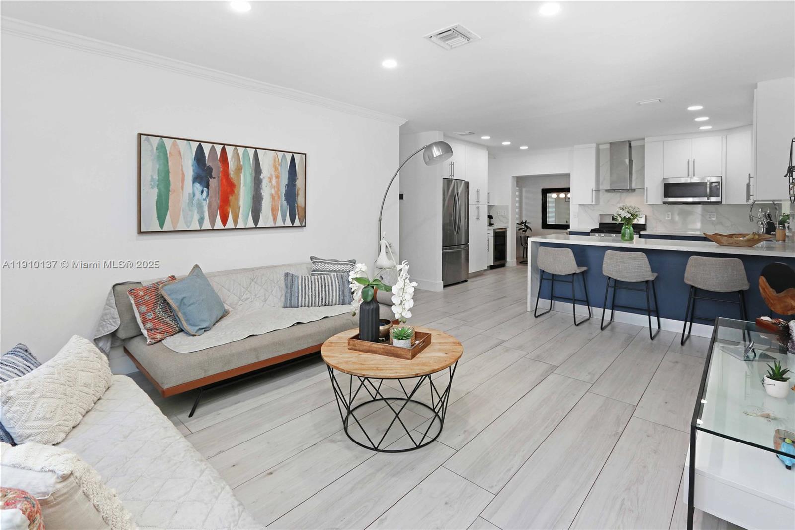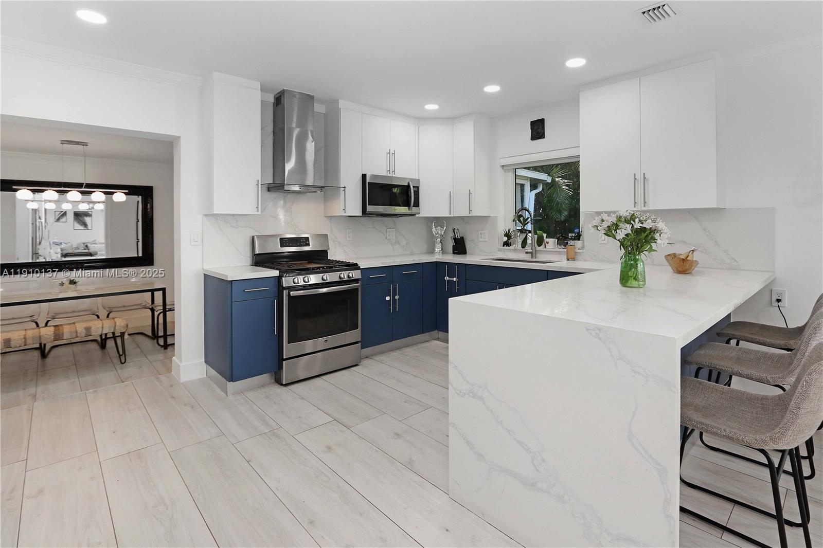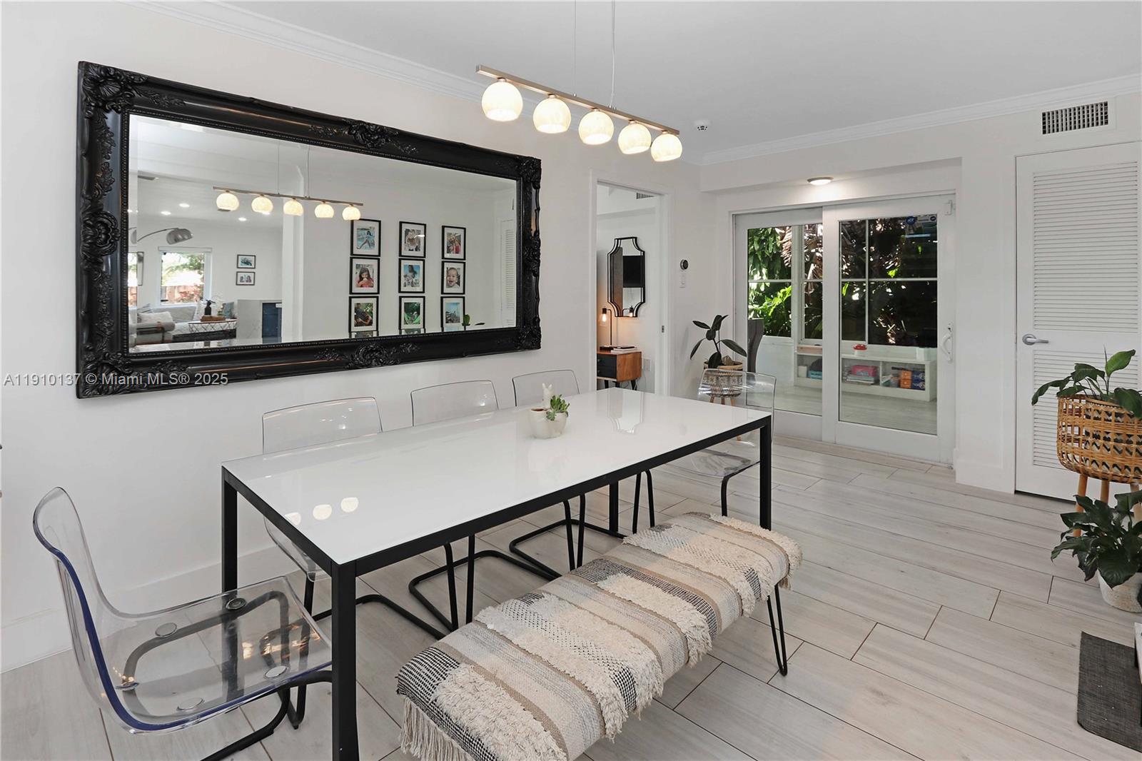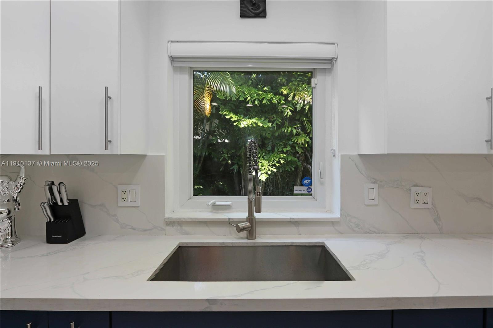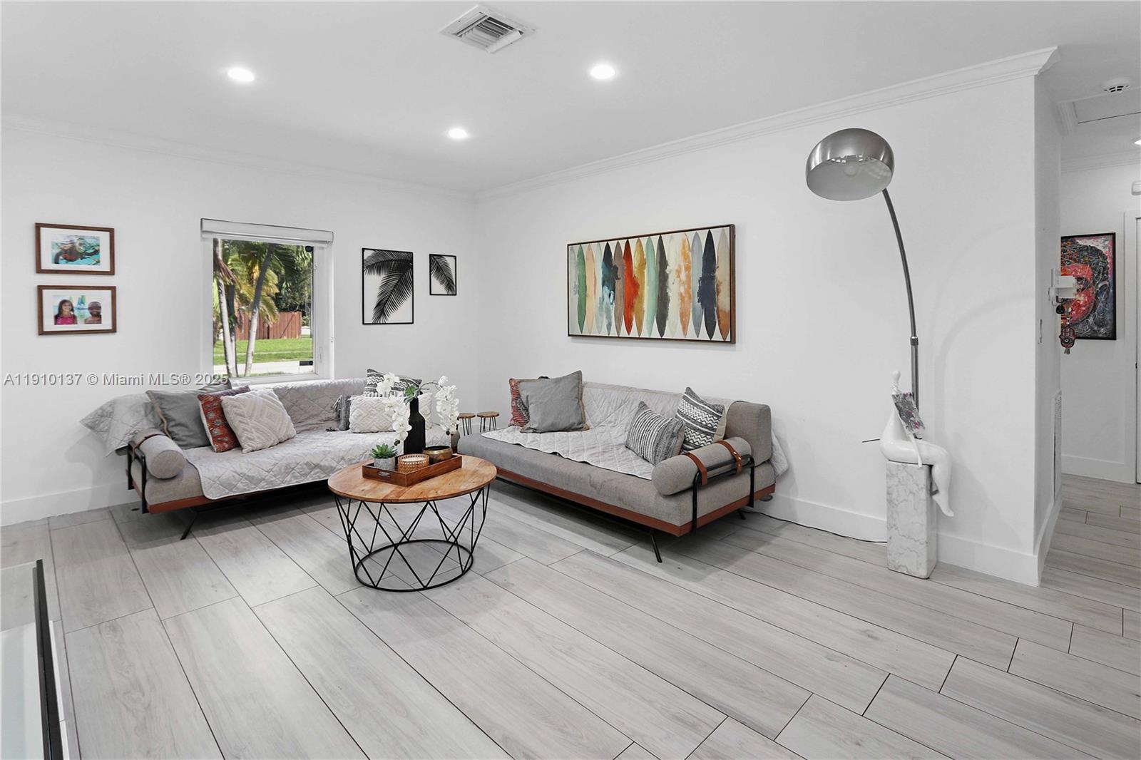 Stunning, high-efficiency 3 bed, 2 bath, 2-car carport home on a corner lot with beautiful lush landscaping! The custom kitchen features waterfall quartz counters, matching backsplash, gas stove, stainless appliances, farmhouse sink, wine cooler, + abundant storage. Enjoy a split floor plan with a formal dining room + sliders opening to a large covered patio ideal for entertaining. Upgrades include impact windows + doors, new gas washer/dryer, metal roof a few yrs old, gas tankless water heater, + a solar panel system! Both bathrooms are beautifully updated, + every room showcases custom closets, crown molding, + designer window treatments. Outside entails a private, large backyard with mango + banana trees, + climate-controlled shed with power that is currently used as an office!