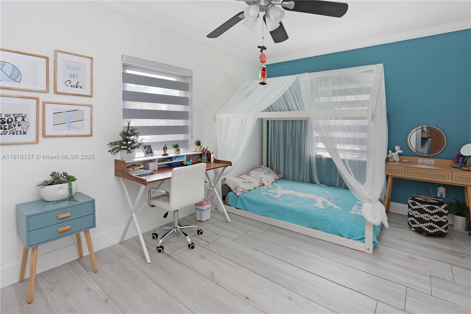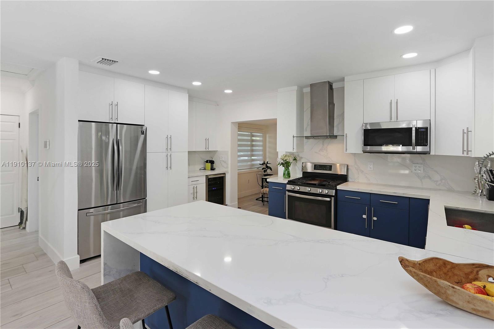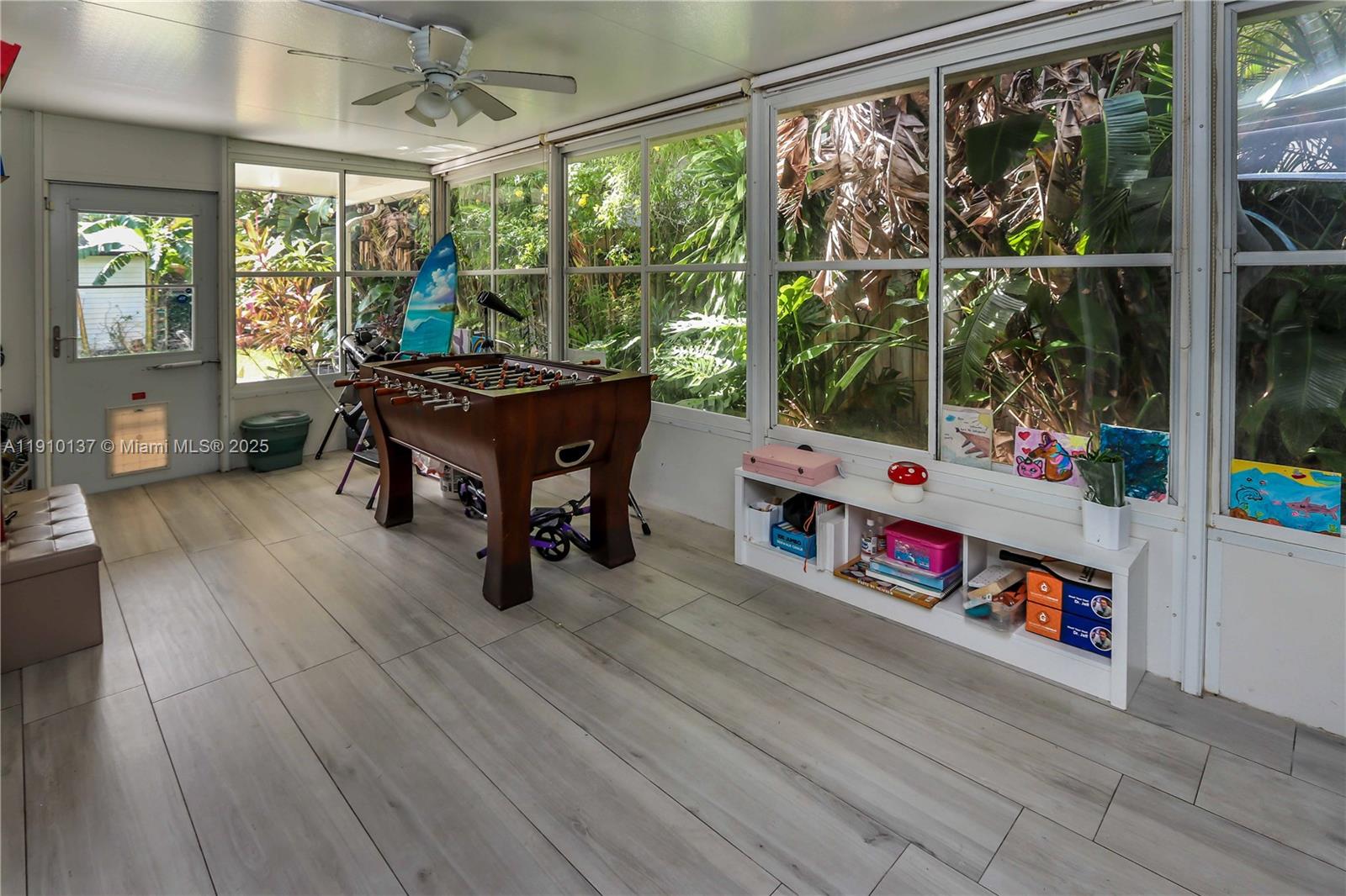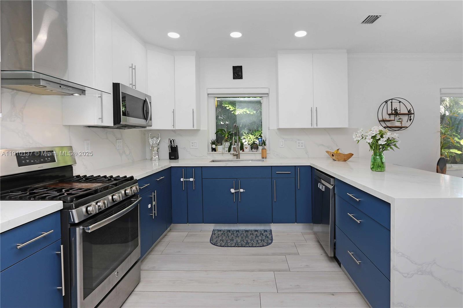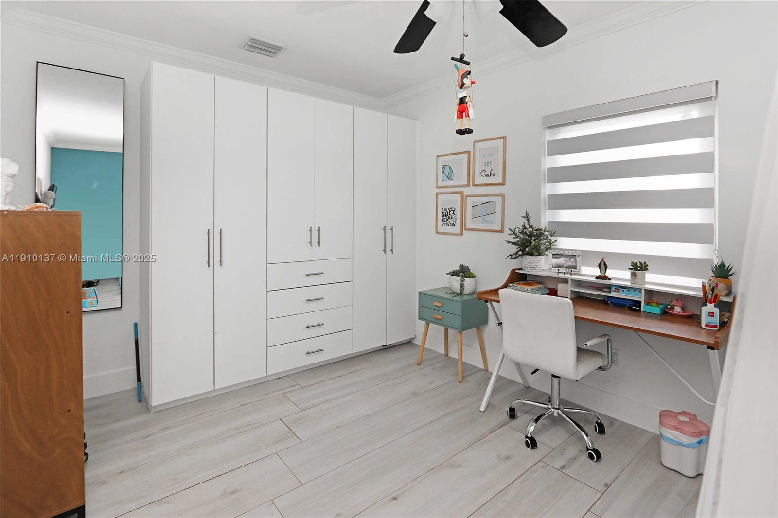Stunning, high-efficiency 3 bed, 2 bath, 2-car carport home on a corner lot with beautiful lush landscaping! The custom kitchen features waterfall quartz counters, matching backsplash, gas stove, stainless appliances, farmhouse sink, wine cooler, + abundant storage. Enjoy a split floor plan with a formal dining room + sliders opening to a large covered patio ideal for entertaining. Upgrades include impact windows + doors, new gas washer/dryer, metal roof a few yrs old, gas tankless water heater, + a solar panel system! Both bathrooms are beautifully updated, + every room showcases custom closets, crown molding, + designer window treatments. Outside entails a private, large backyard with mango + banana trees, + climate-controlled shed with power that is currently used as an office!