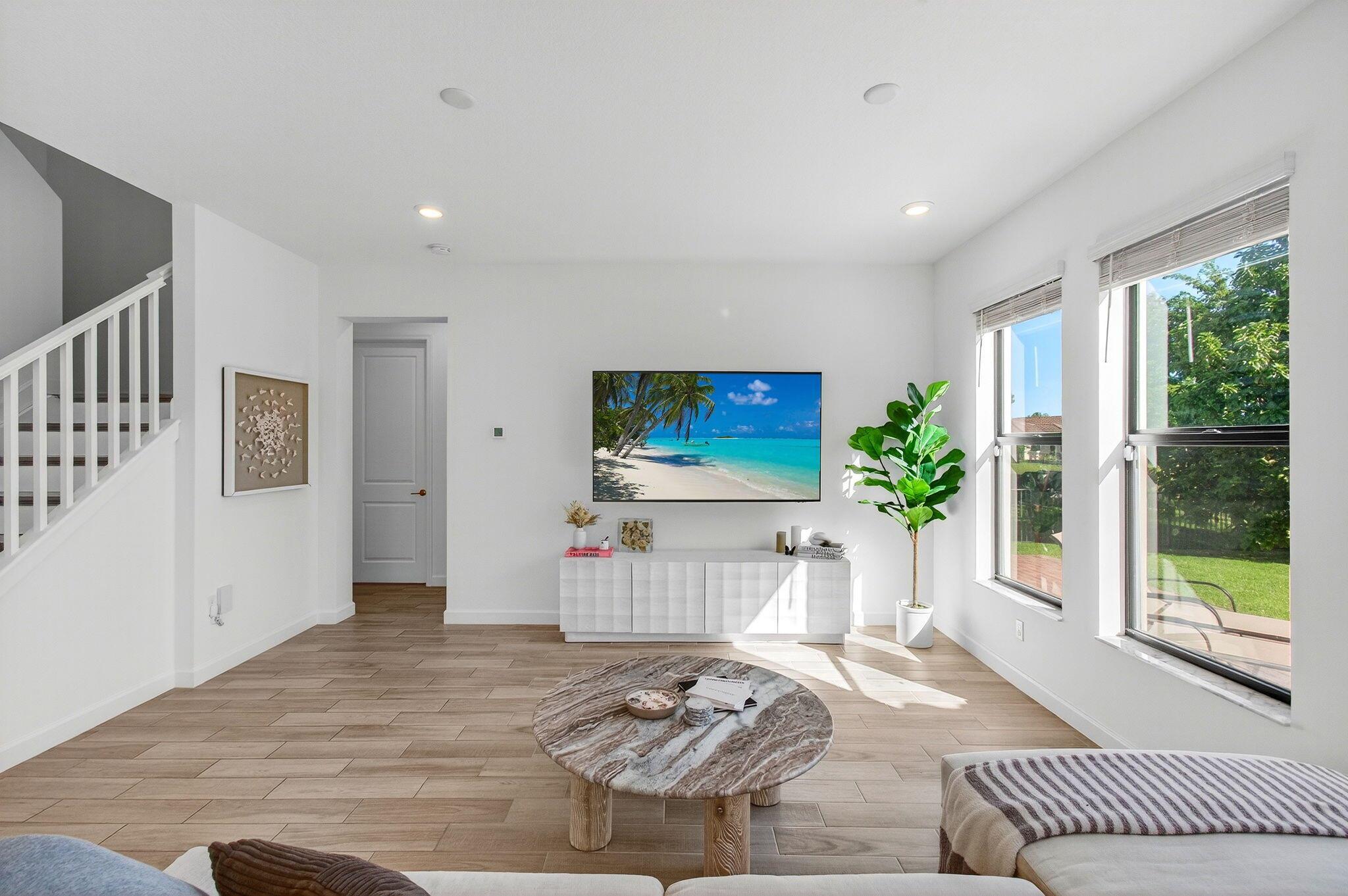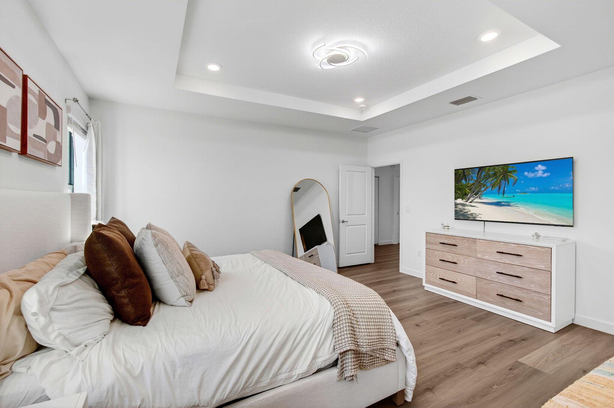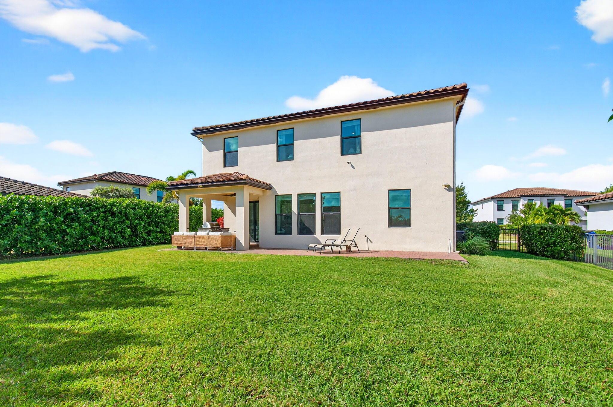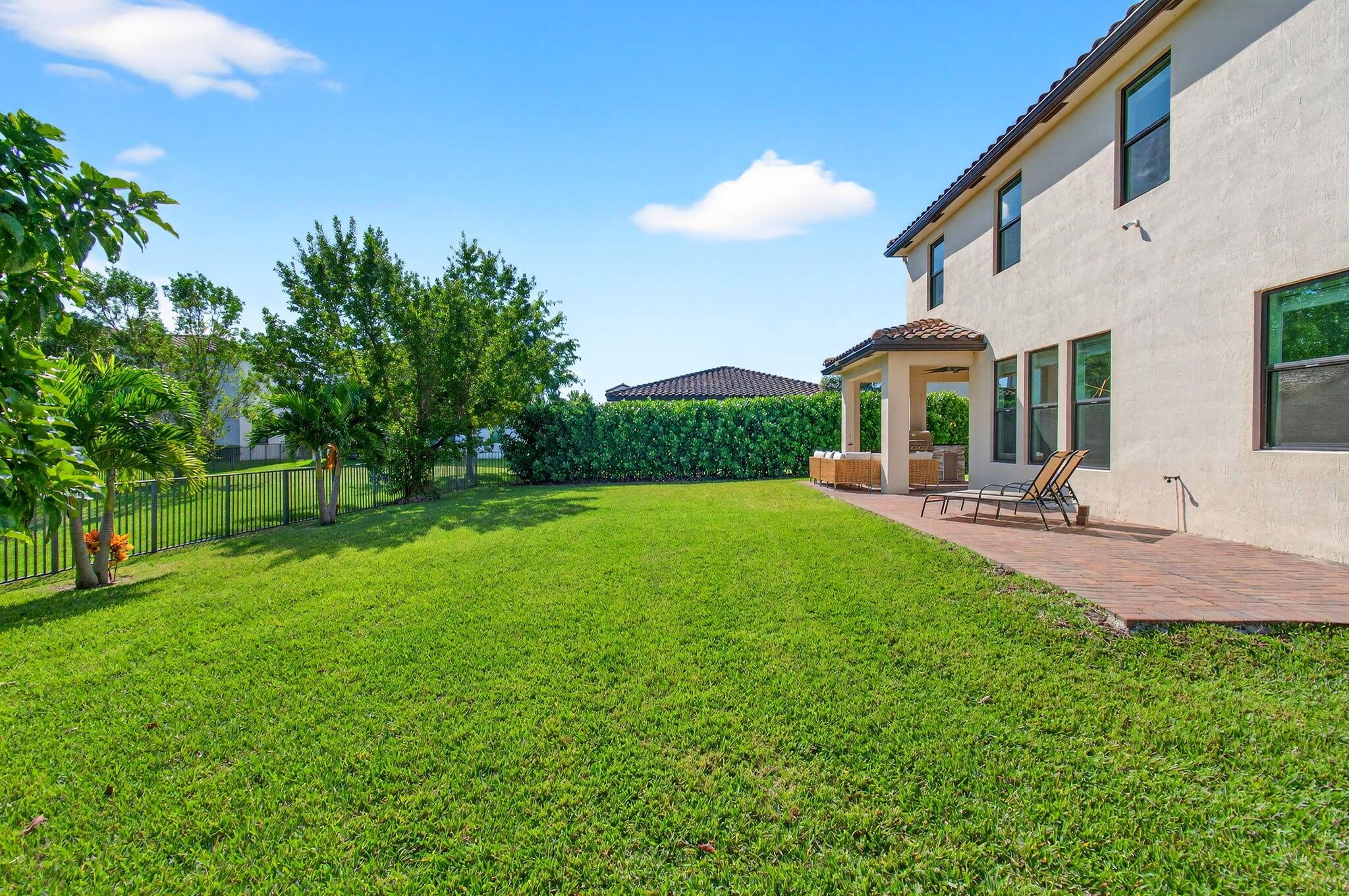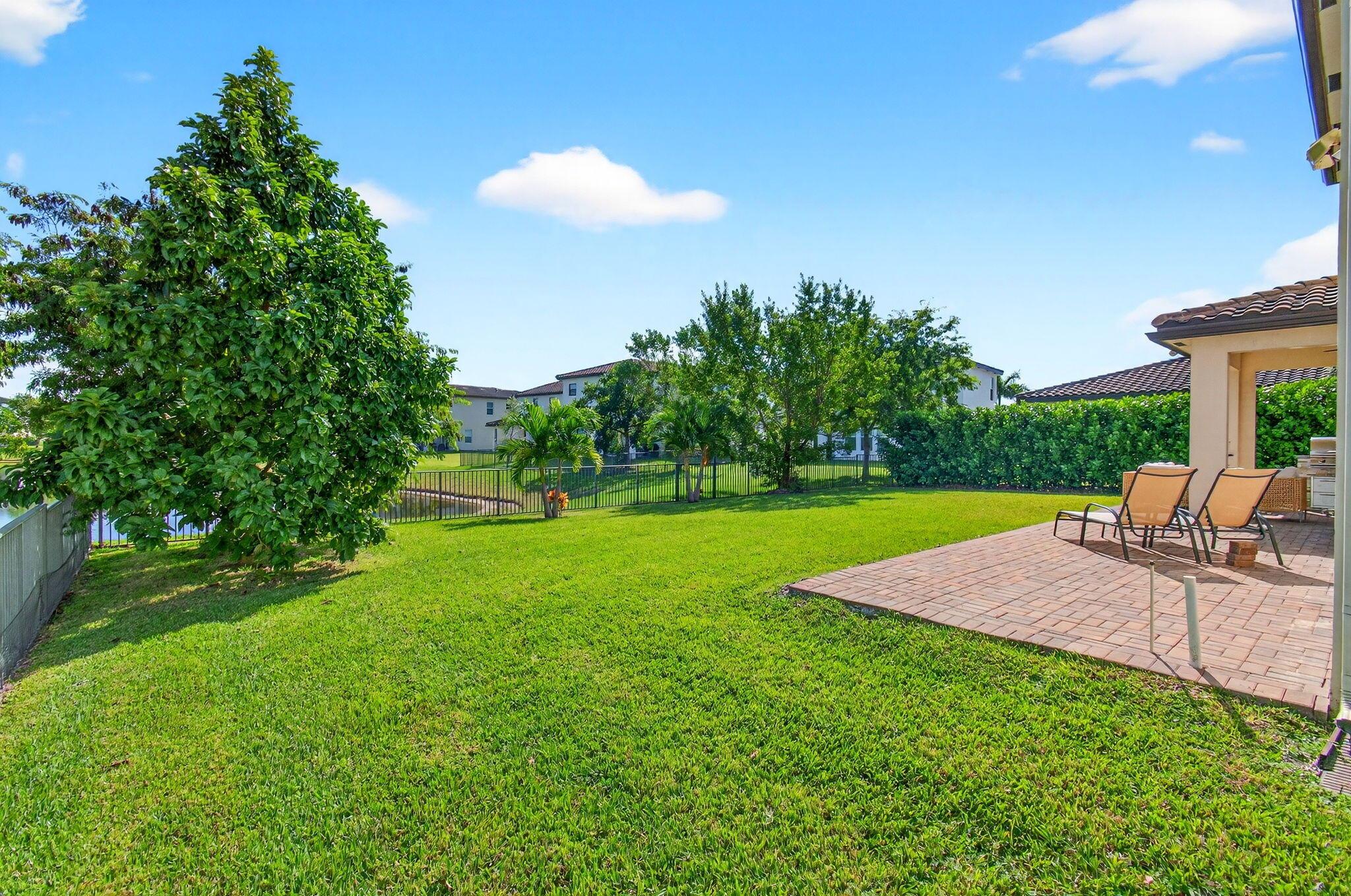 WATER, WATER EVERYWHERE- experience lake views from nearly every room in this bright contemporary Bellasera home!As you arrive, you are greeted by freshly manicured landscaping & a welcoming front porch overlooking the lake , with another lake behind the home for the ultimate privacy & serenity. The fully fenced backyard is enormous, offering plenty of room to design your dream pool while maintaining abundant green space for your four-legged friends to play. Mature Clusia hedges create a natural privacy wall, beautifully framing the water views. An impressive 12' x 40' brick paver patio provides the perfect space for alfresco dining & outdoor entertainment. Built in 2020, this home features a newer roof and full-impact glass for total peace of mind, along with lower insurance rates.