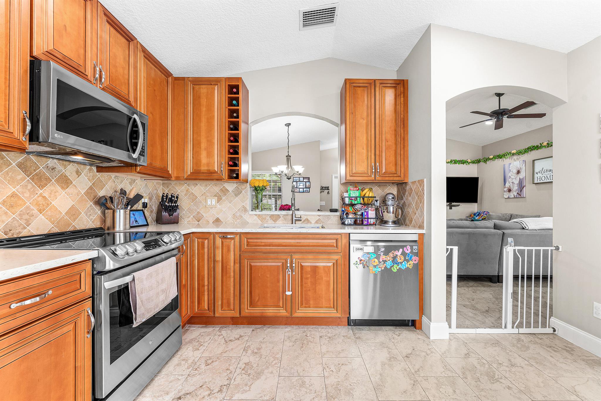 THIS BEAUTIFULLY UPDATED SPLIT FLOORPLAN HOME IN THE DESIRABLE NEIGHBORHOOD OF LAKE CHARLESTON BOASTS TASTEFULLY RENOVATED KITCHEN, GUEST BATH AND NEW TILE. VAULTED AND CATHEDRAL CEILINGS. 42-INCH KITCHEN CABINETS, STAINLESS APPLIANCES, TILED PATIO AND AMPLE ATTIC SPACE. NEW LAMINATE IN THE MASTER BEDROOM AND KNOCK-DOWN CEILINGS. BRAND NEW INSULATED HURRICANE GARAGE DOOR, HVAC(2023), WATER HEATER (2022), PEX PIPING (2020). FULLY FENCED PRIVATE YARD. NEW AWNING, NEW FRONT WALKWAY. ACCORDIAN SHUTTERS. NEW HURRICANE IMPACT FRONT DOOR. EXTRA STORAGE SPACE. FABULOUS LAKE WORTH A RATED SCHOOLS. ALL OF THIS LOCATED IN GREAT COMMUNITY WITH POOL, TENNIS, BOATING, PLAYGROUND, CLUBHOUSE, PICNIC AREA. NEAR RESTAURANTS AND SHOPPING.