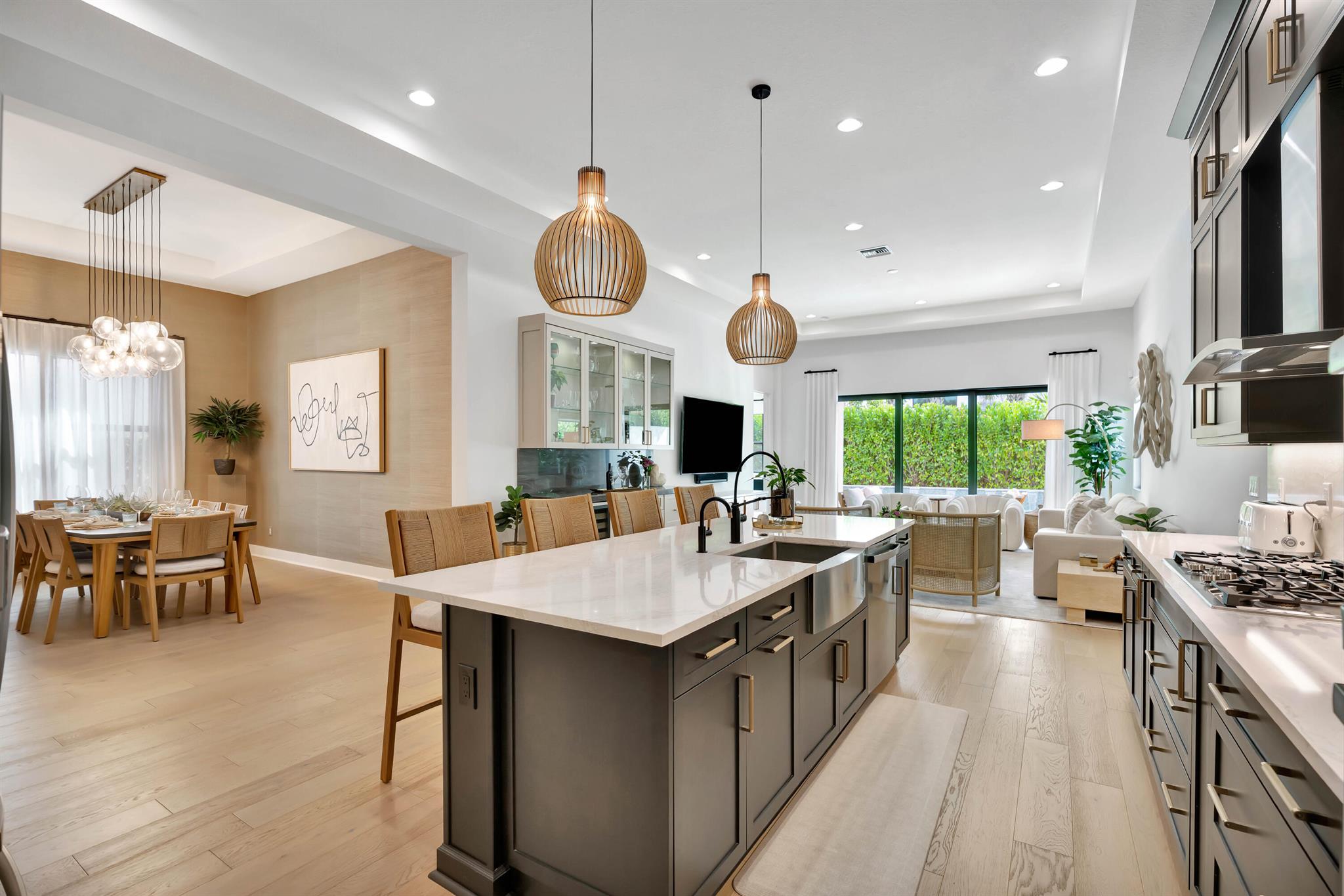 Artistry - The Decorator Fully Furnished Model You've Been Waiting ForBuilt in 2022 and upgraded far beyond builder standards, this fully furnished residence in Artistry shows like a designer model home. Every space has been elevated with thoughtful improvements, premium finishes, and custom craftsmanship, creating a luxury offering in one of Palm Beach Gardens' most desirable gated communities.Wide-plank hardwood flooring runs throughout the home. Custom cabinetry, upgraded hardware, designer lighting, and bespoke built-ins anchor each room with a polished, curated feel. The main living area features a custom media wall with integrated bar, two refrigerator drawers, and a wine refrigerator. The study includes a striking built-in workspace finished with a live-edge slab. (more)
