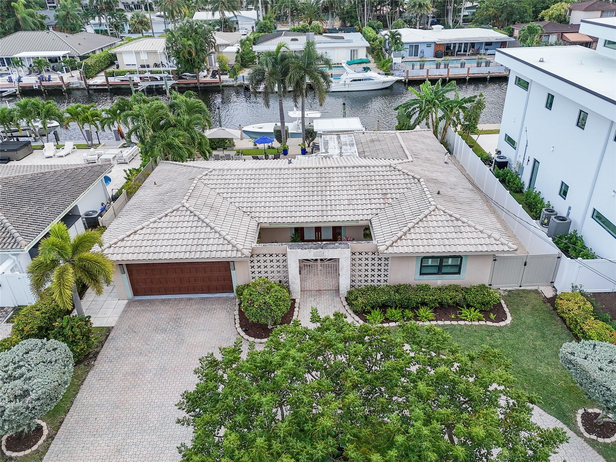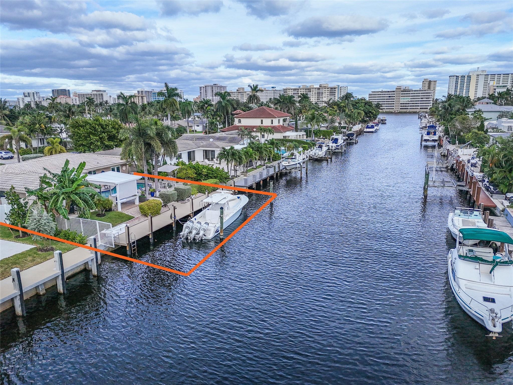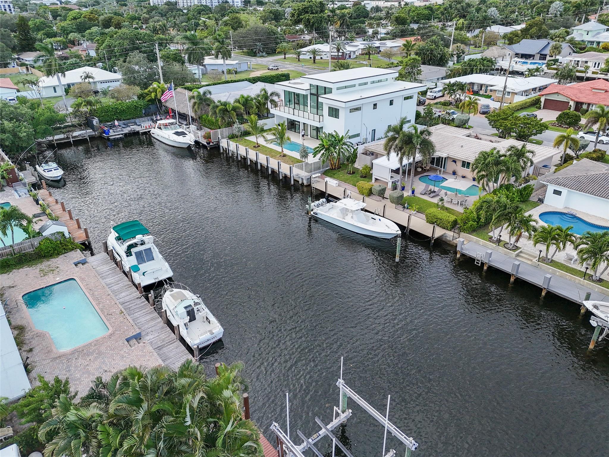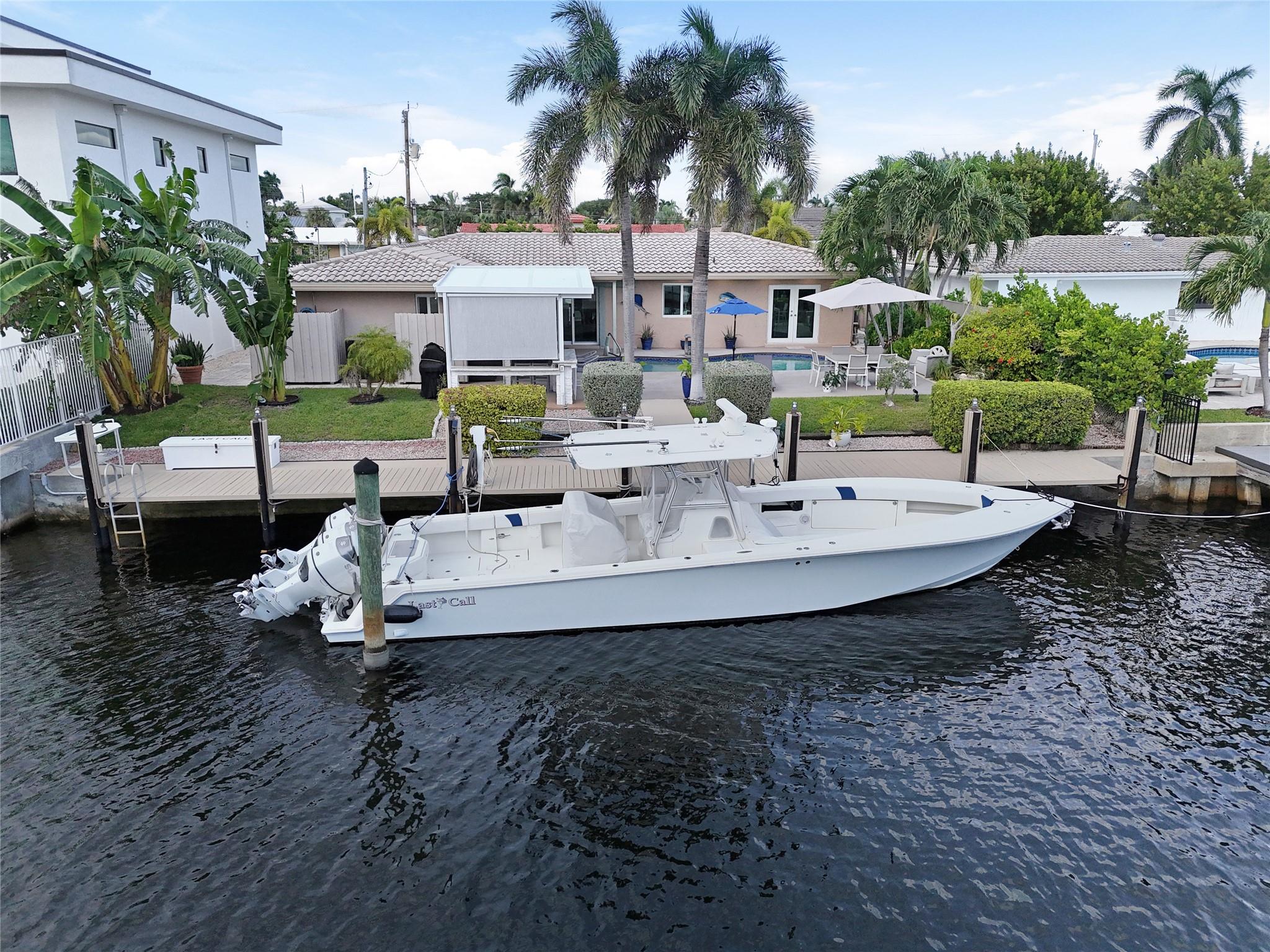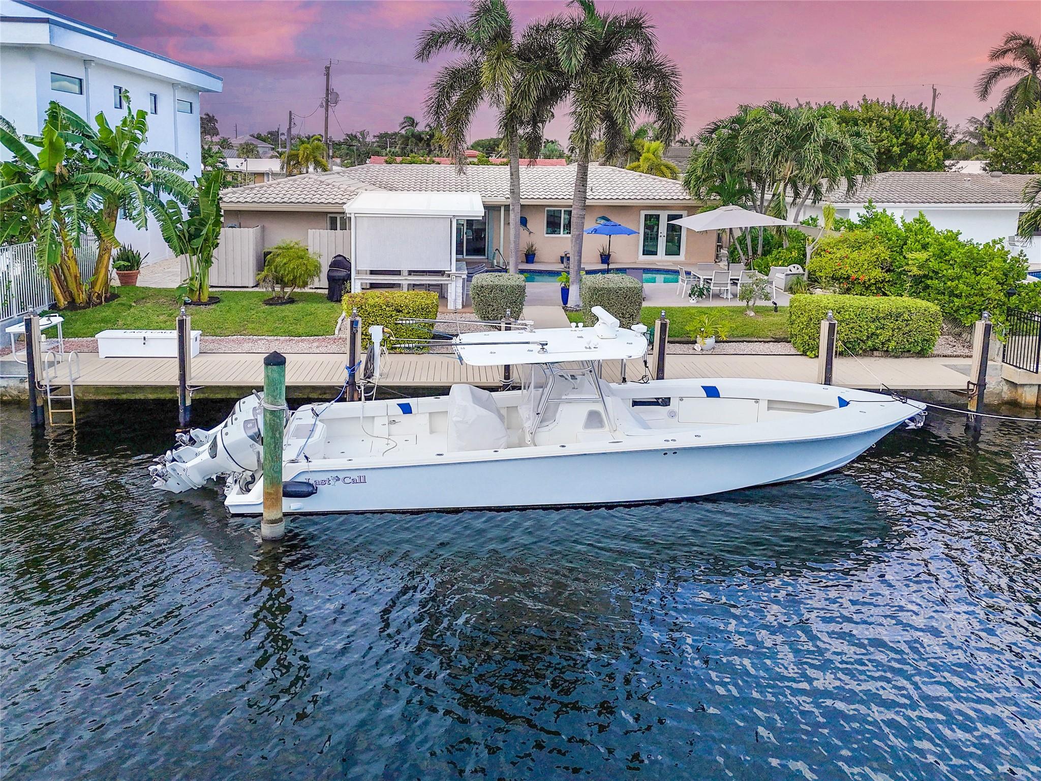 Pristine 3 bedroom 2 bath waterfront pool home in Harbor Village with NO fixed bridges & preferred Southern exposure. Open floor plan with expanded Kitchen and breakfast bar + chefs pantry. New flooring, fixtures, fans & LED recessed lighting throughout. Gorgeous primary & secondary baths. Backyard oasis w/ covered patio plus recently completed pergola & outdoor bar. 75’ of water frontage w/ a 65’ dock on 100' wide Poinsettia Canal. Dock offers 50 amp service + 110. Straight shot to the Intracoastal Waterway and minutes to Hillsboro inlet. Walking distance to Atlantic Blvd. & the beach. New PVC plumbing to the street. Updated electrical inside & out. Newer A/C and W/H. Generator hookup. Outdoor shower. Circular paver driveway. Interior Laundry w/ built-in cabinets +++. This is the one.