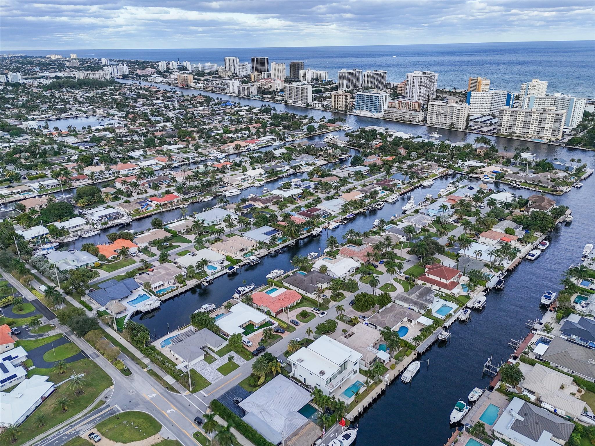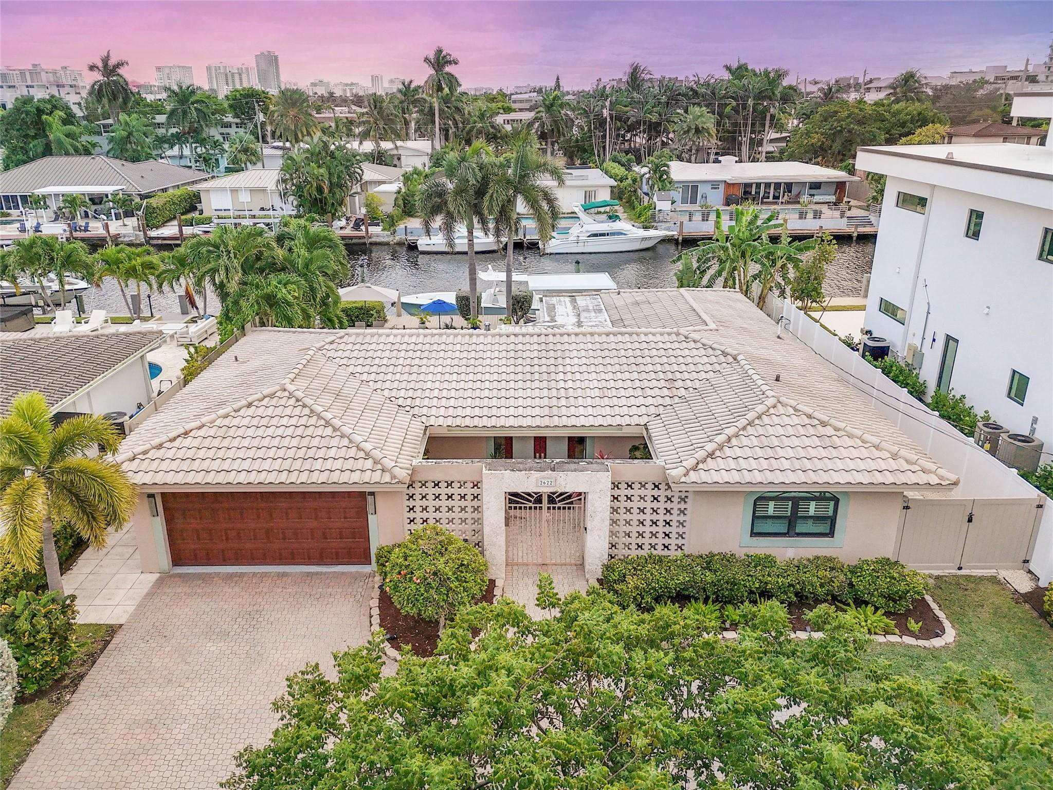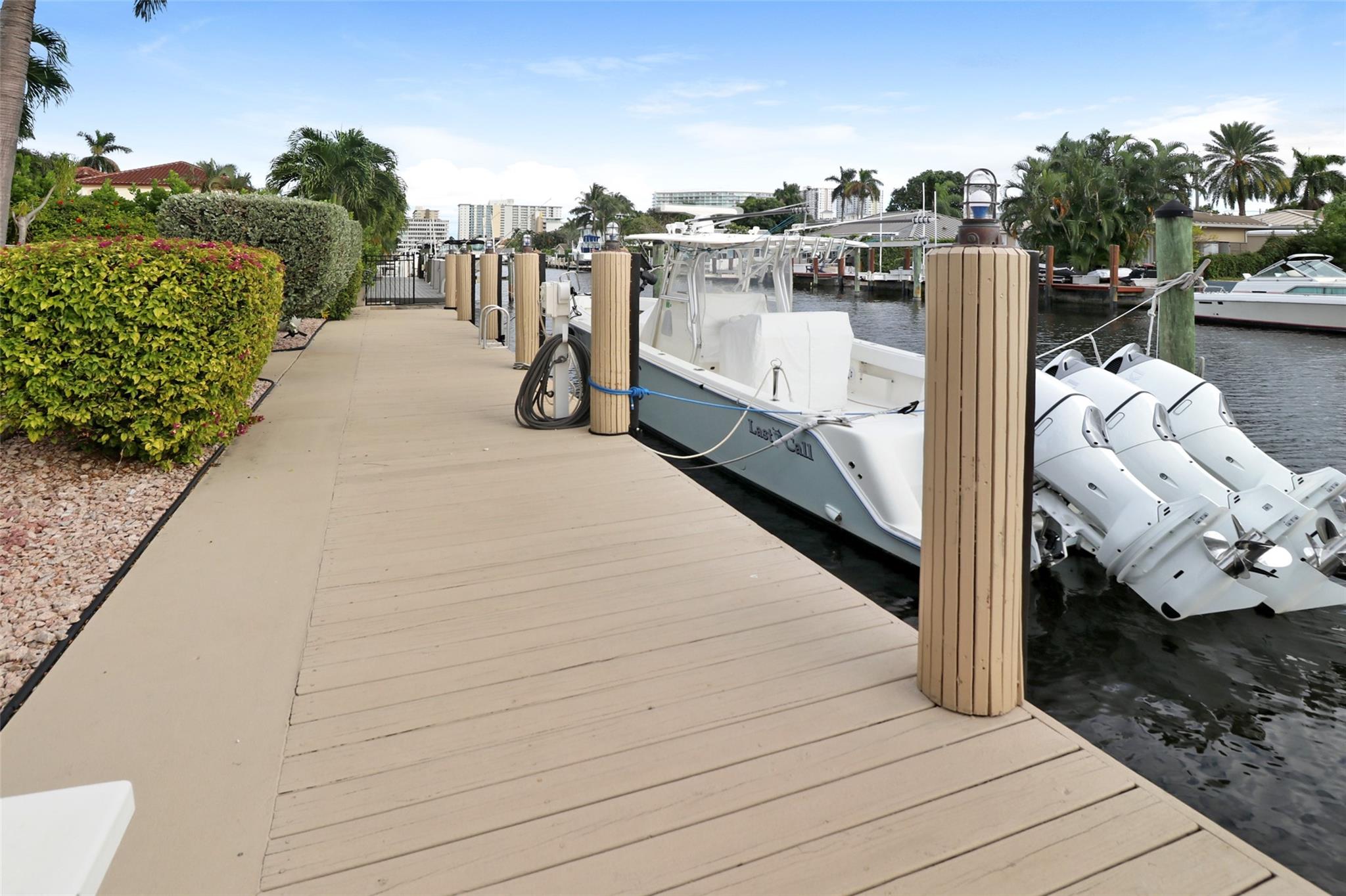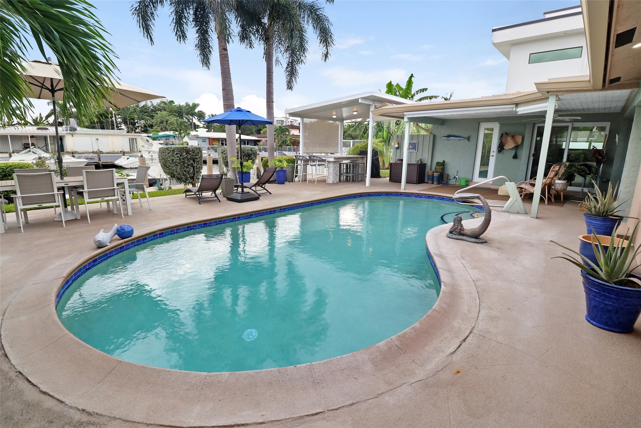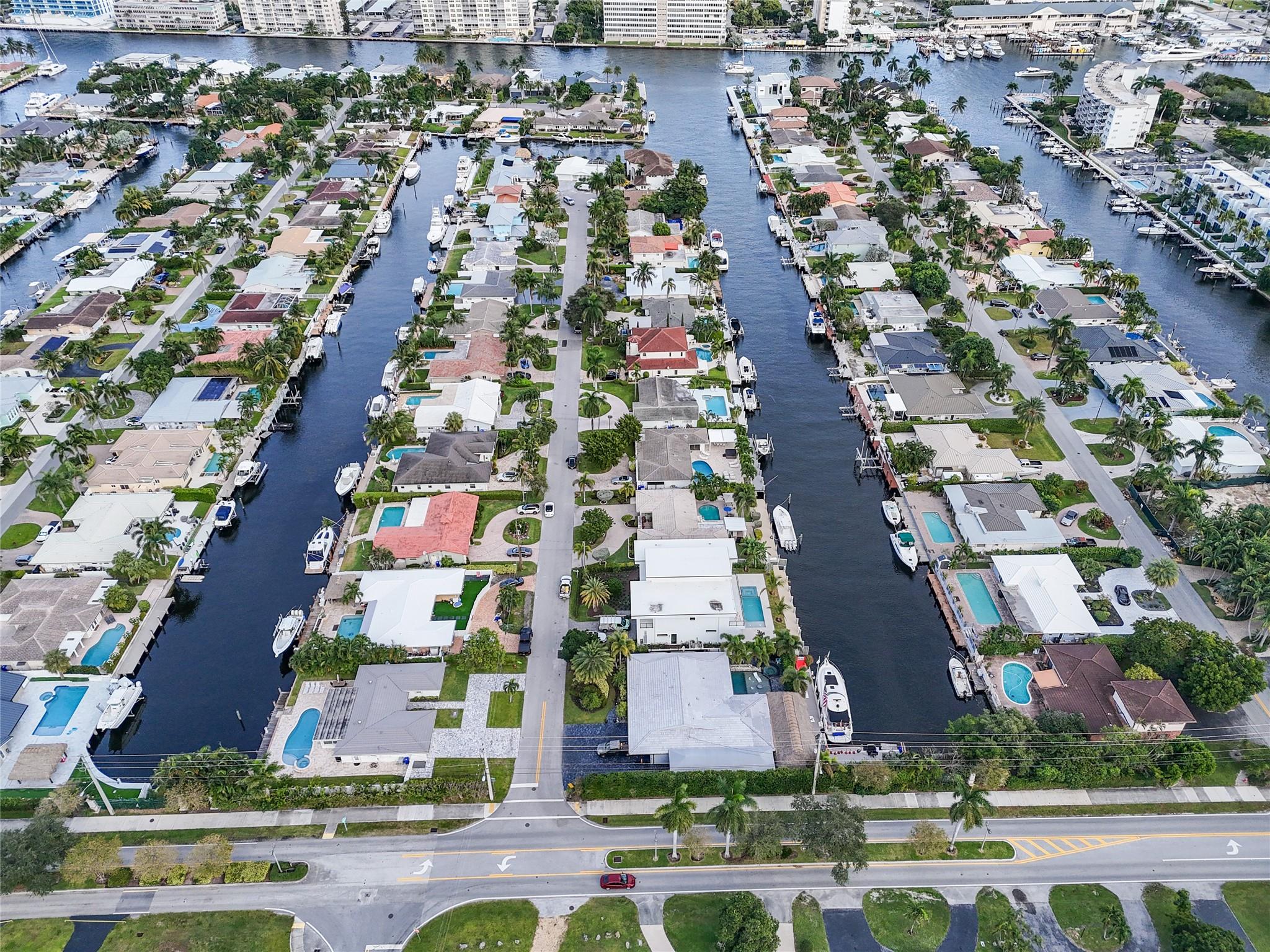 Pristine 3 bedroom 2 bath waterfront pool home in Harbor Village with NO fixed bridges & preferred Southern exposure. Open floor plan with expanded Kitchen and breakfast bar + chefs pantry. New flooring, fixtures, fans & LED recessed lighting throughout. Gorgeous primary & secondary baths. Backyard oasis w/ covered patio plus recently completed pergola & outdoor bar. 75’ of water frontage w/ a 65’ dock on 100' wide Poinsettia Canal. Dock offers 50 amp service + 110. Straight shot to the Intracoastal Waterway and minutes to Hillsboro inlet. Walking distance to Atlantic Blvd. & the beach. New PVC plumbing to the street. Updated electrical inside & out. Newer A/C and W/H. Generator hookup. Outdoor shower. Circular paver driveway. Interior Laundry w/ built-in cabinets +++. This is the one.