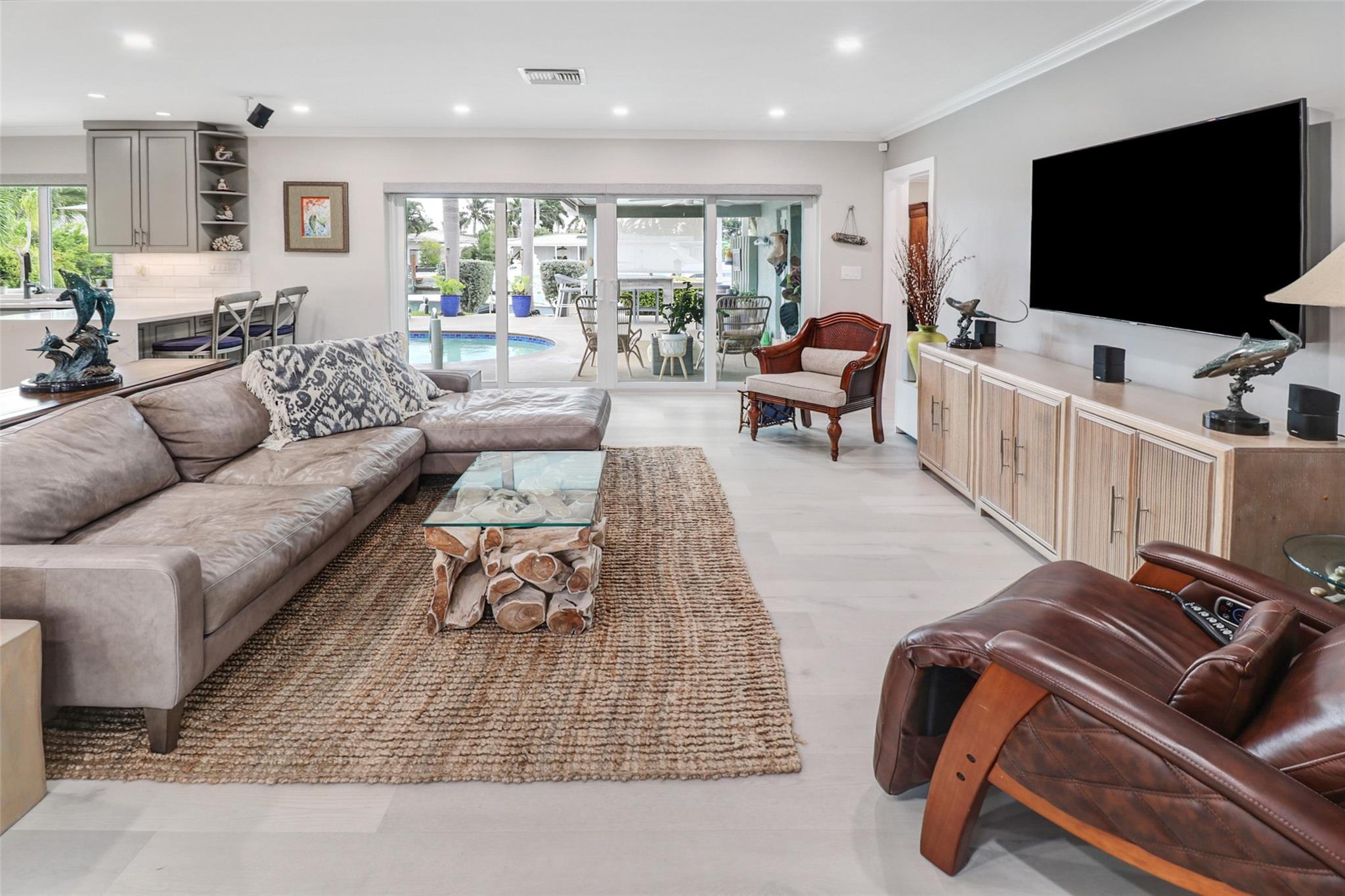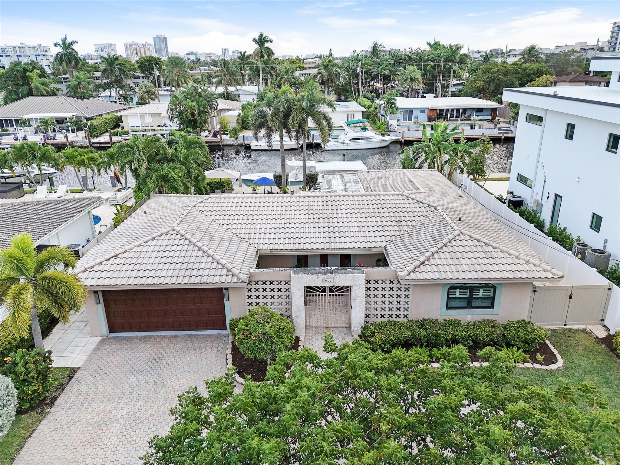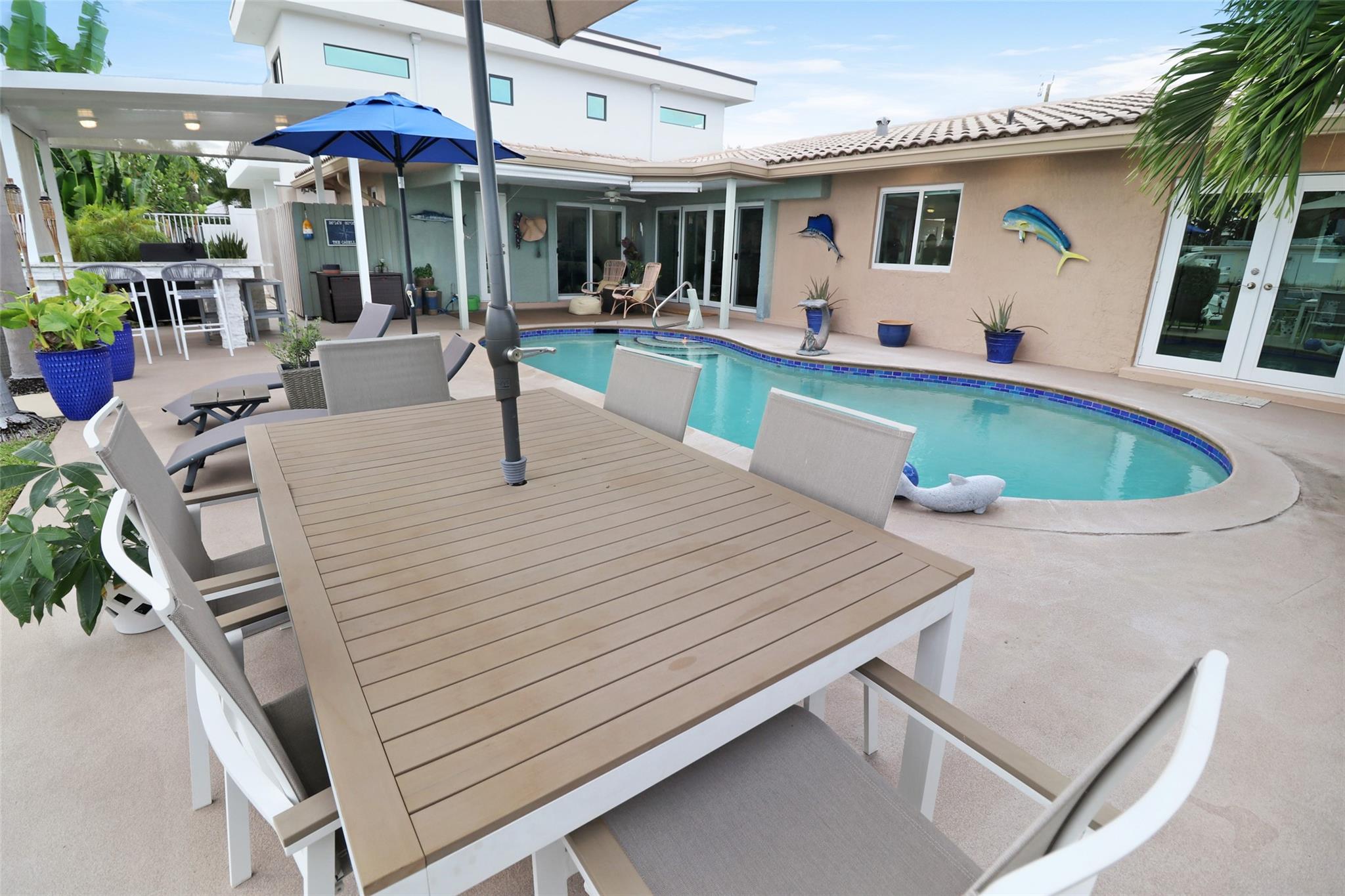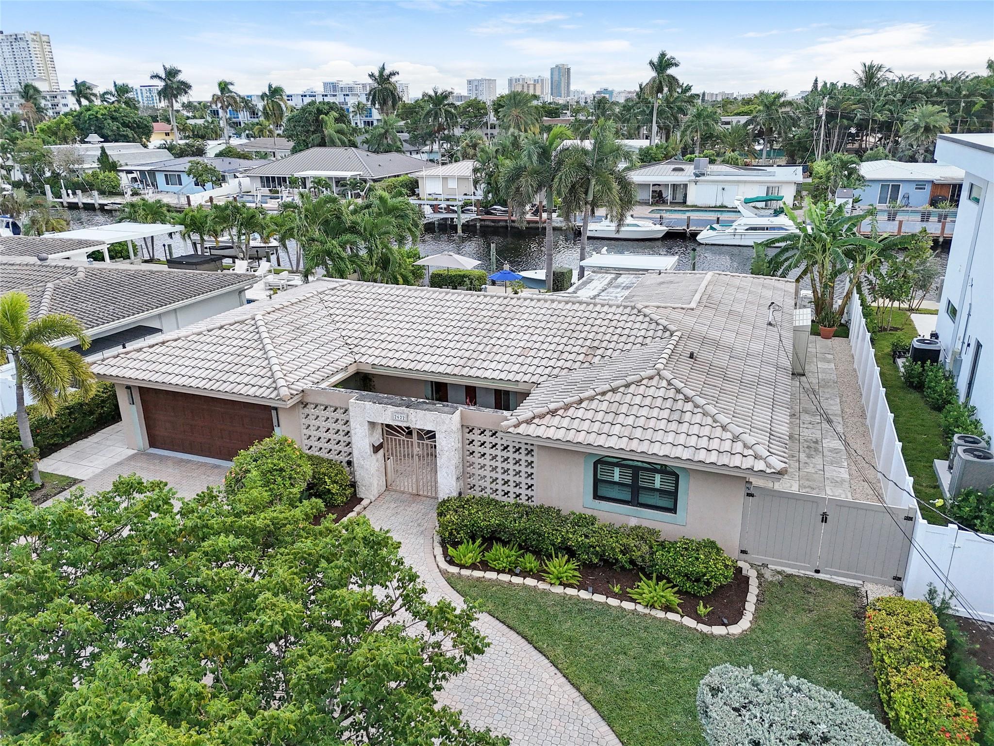Pristine 3 bedroom 2 bath waterfront pool home in Harbor Village with NO fixed bridges & preferred Southern exposure. Open floor plan with expanded Kitchen and breakfast bar + chefs pantry. New flooring, fixtures, fans & LED recessed lighting throughout. Gorgeous primary & secondary baths. Backyard oasis w/ covered patio plus recently completed pergola & outdoor bar. 75’ of water frontage w/ a 65’ dock on 100' wide Poinsettia Canal. Dock offers 50 amp service + 110. Straight shot to the Intracoastal Waterway and minutes to Hillsboro inlet. Walking distance to Atlantic Blvd. & the beach. New PVC plumbing to the street. Updated electrical inside & out. Newer A/C and W/H. Generator hookup. Outdoor shower. Circular paver driveway. Interior Laundry w/ built-in cabinets +++. This is the one.