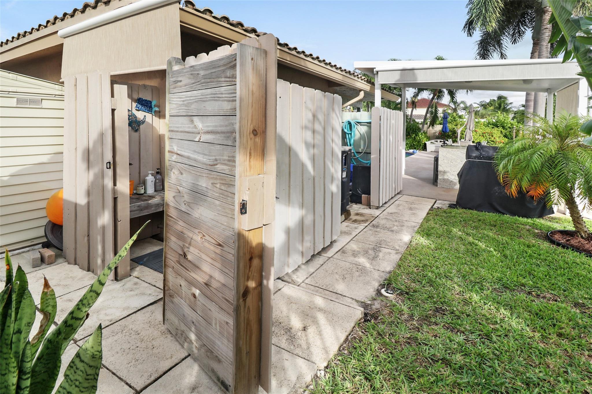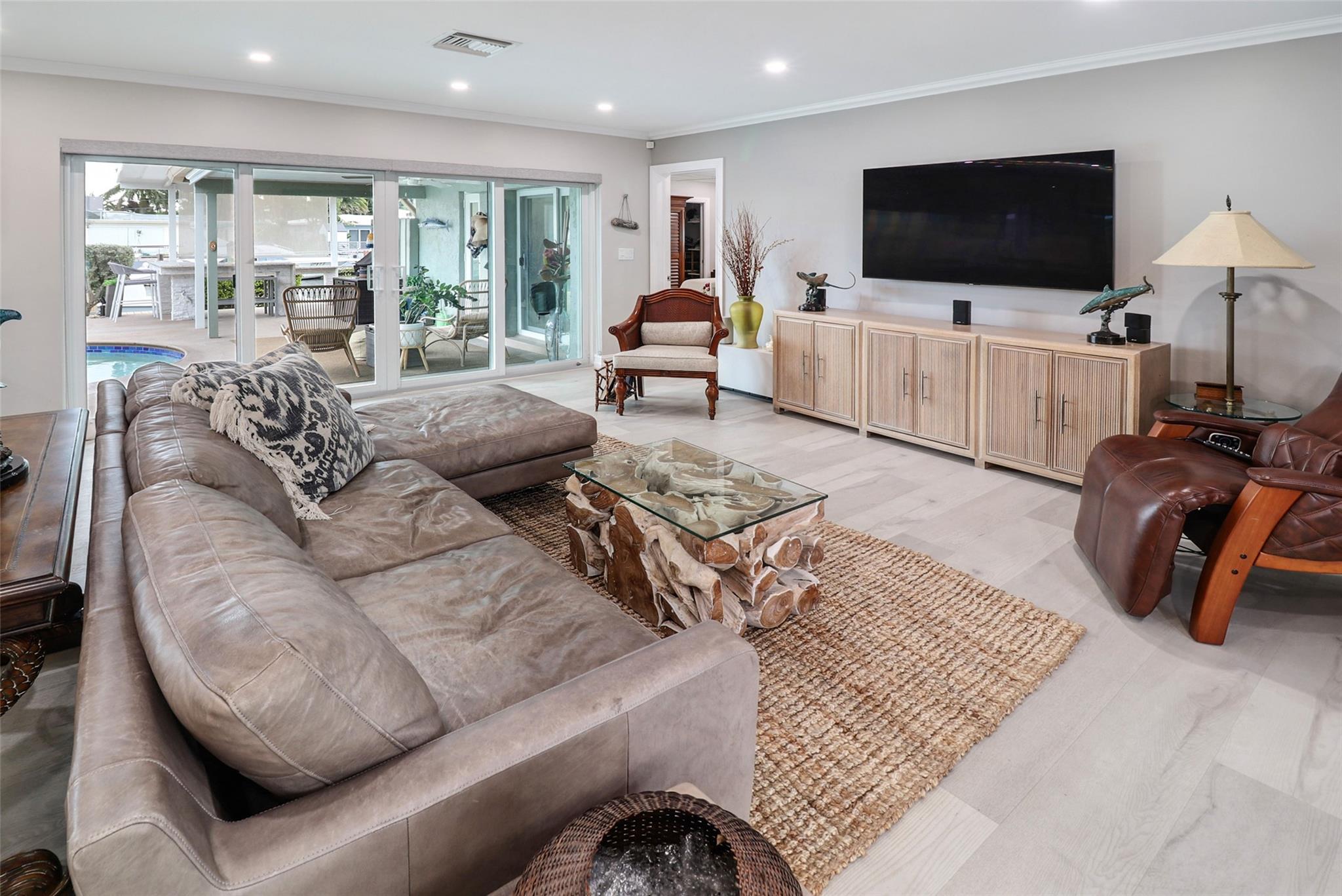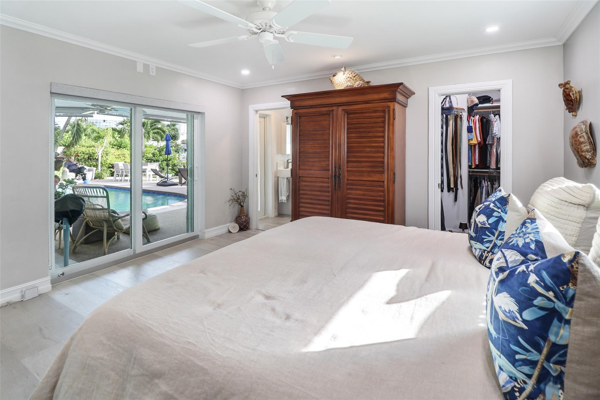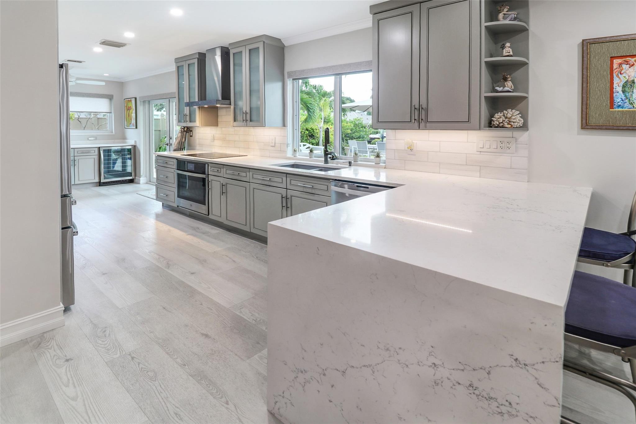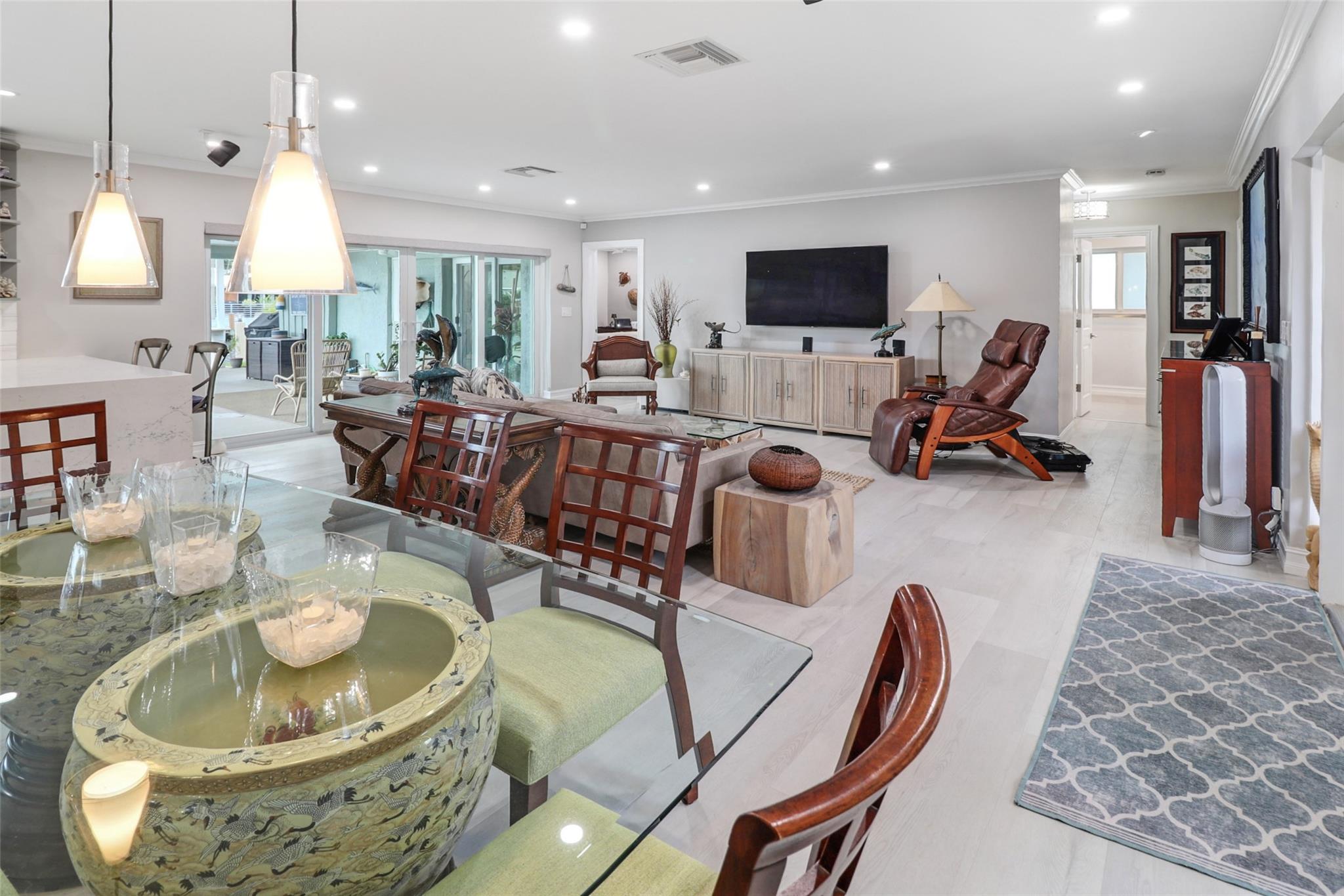 Pristine 3 bedroom 2 bath waterfront pool home in Harbor Village with NO fixed bridges & preferred Southern exposure. Open floor plan with expanded Kitchen and breakfast bar + chefs pantry. New flooring, fixtures, fans & LED recessed lighting throughout. Gorgeous primary & secondary baths. Backyard oasis w/ covered patio plus recently completed pergola & outdoor bar. 75’ of water frontage w/ a 65’ dock on 100' wide Poinsettia Canal. Dock offers 50 amp service + 110. Straight shot to the Intracoastal Waterway and minutes to Hillsboro inlet. Walking distance to Atlantic Blvd. & the beach. New PVC plumbing to the street. Updated electrical inside & out. Newer A/C and W/H. Generator hookup. Outdoor shower. Circular paver driveway. Interior Laundry w/ built-in cabinets +++. This is the one.