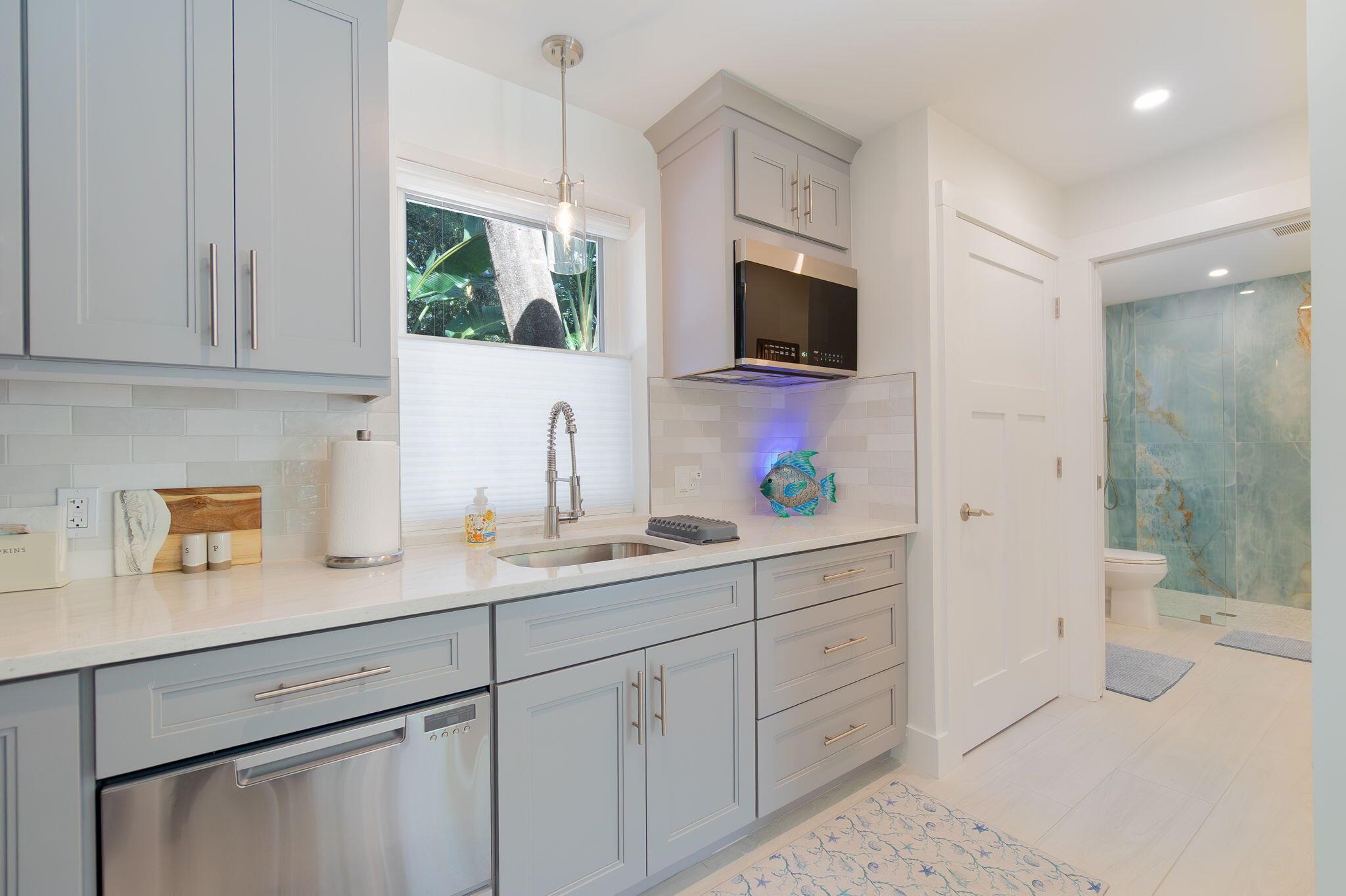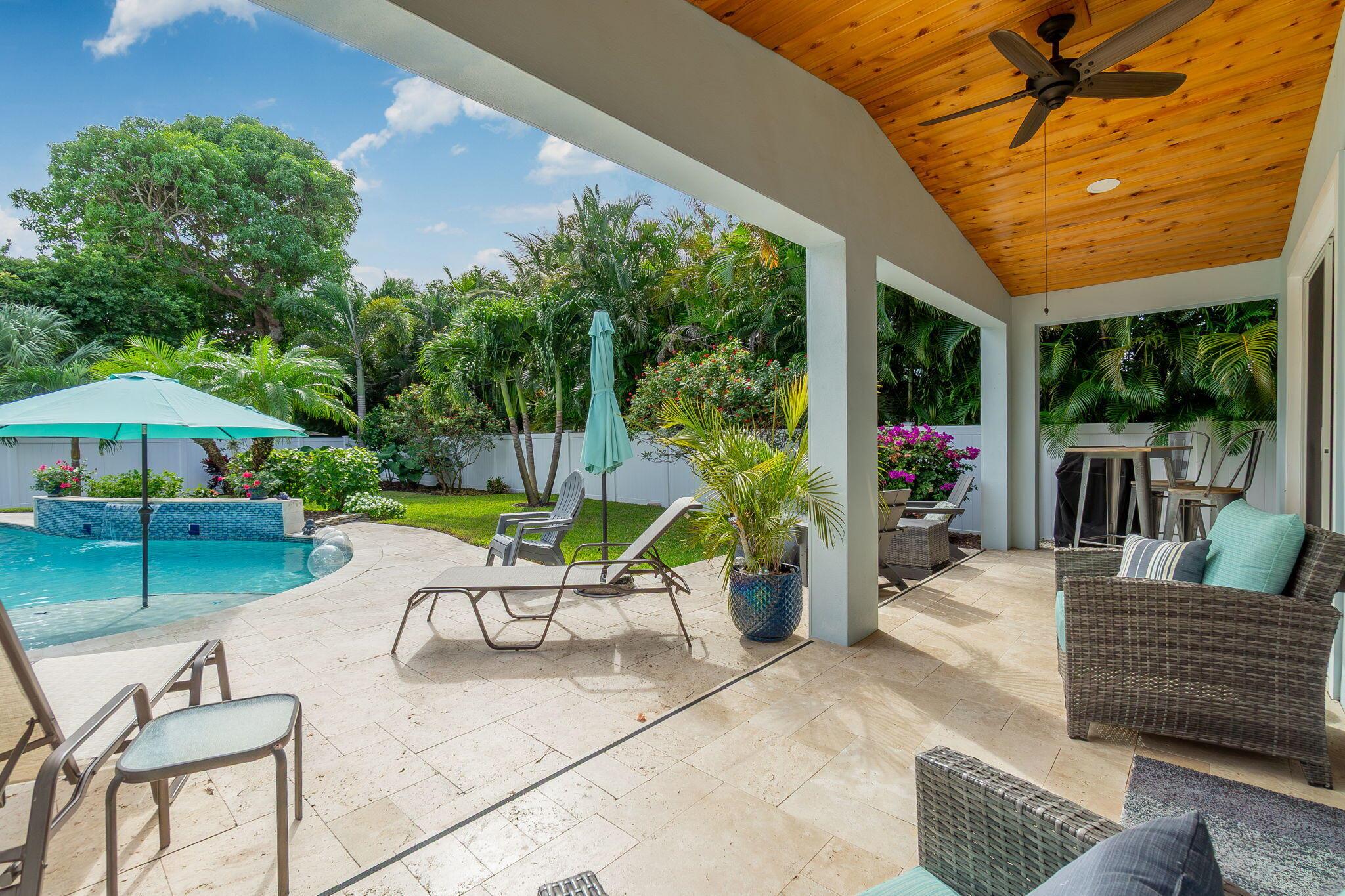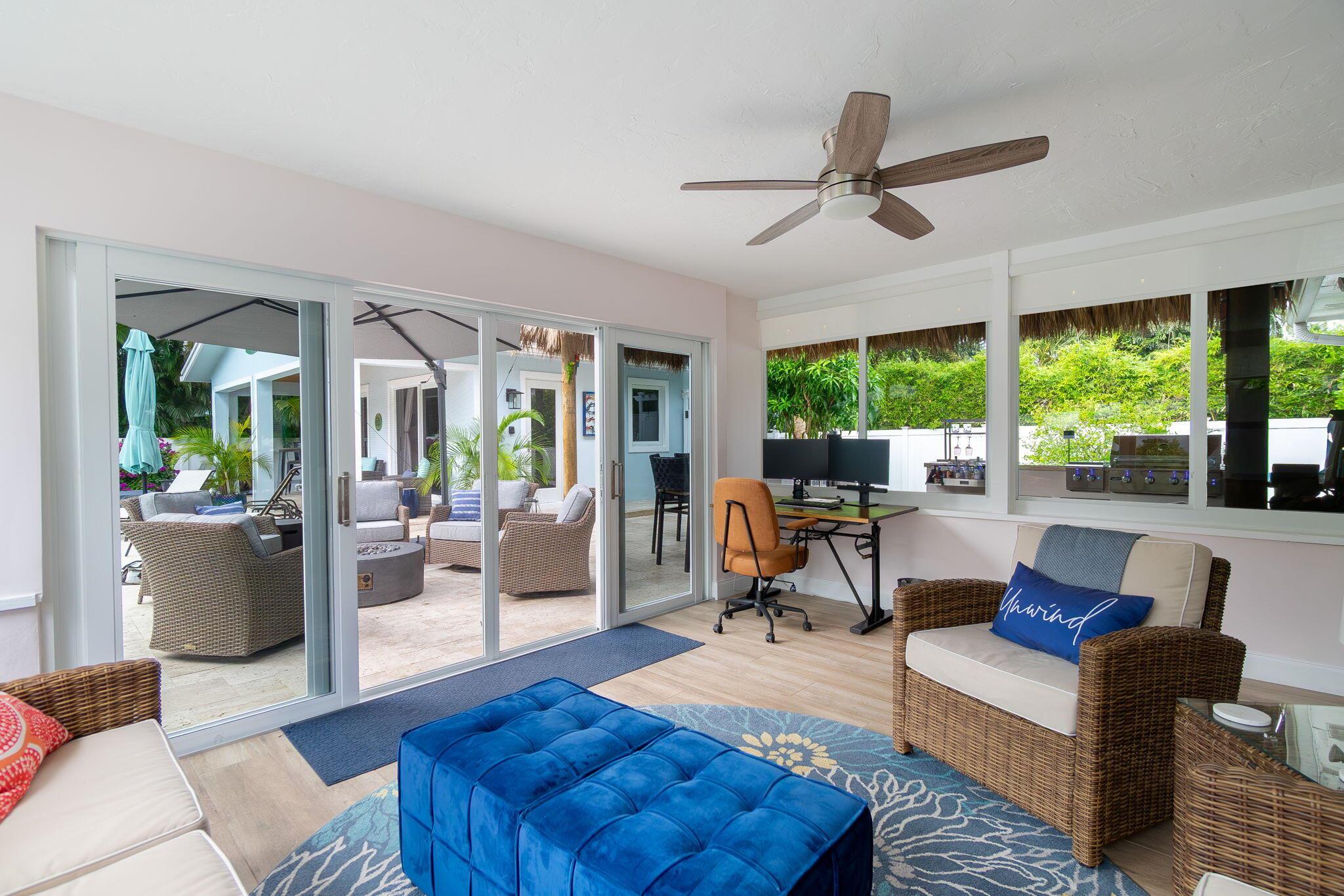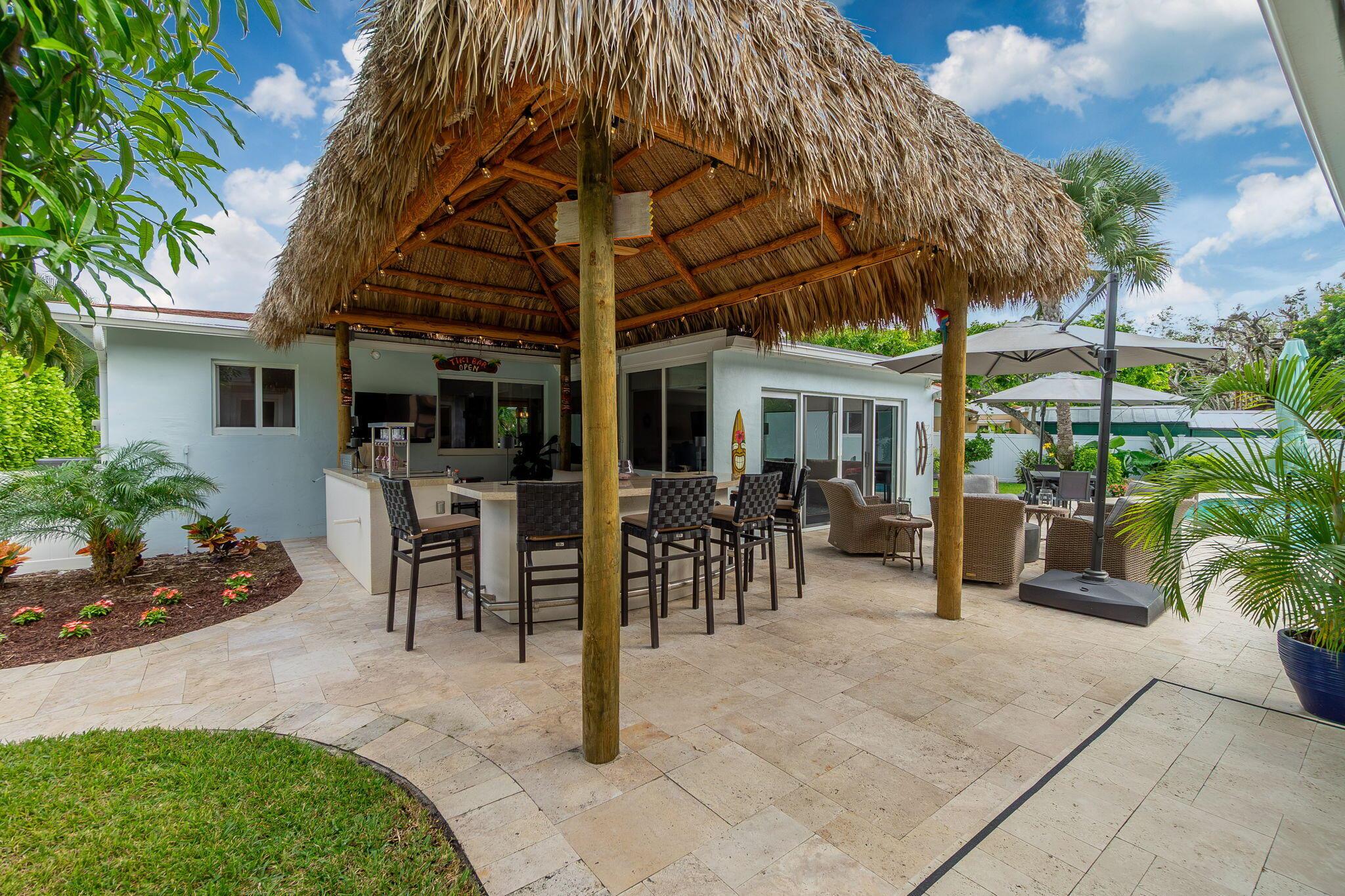 Welcome to your private tropical retreat in Delray Beach! This beautifully updated single-family home features a 2-bedroom, 2-bath main residence on one level, showcasing impact glass throughout, modern finishes, and a bright, open layout designed for effortless Florida living. Step outside to your own resort-style backyard oasis--complete with a sparkling swimming pool, lush landscaping, and an inviting tiki hut with a built-in BBQ, bar seating, and ample space for entertaining. Every detail of this outdoor paradise has been thoughtfully curated to create the ultimate relaxation and entertainment setting. The property also includes a beautiful guest house, offering bedroom, full bath, living area, and complete kitchen,