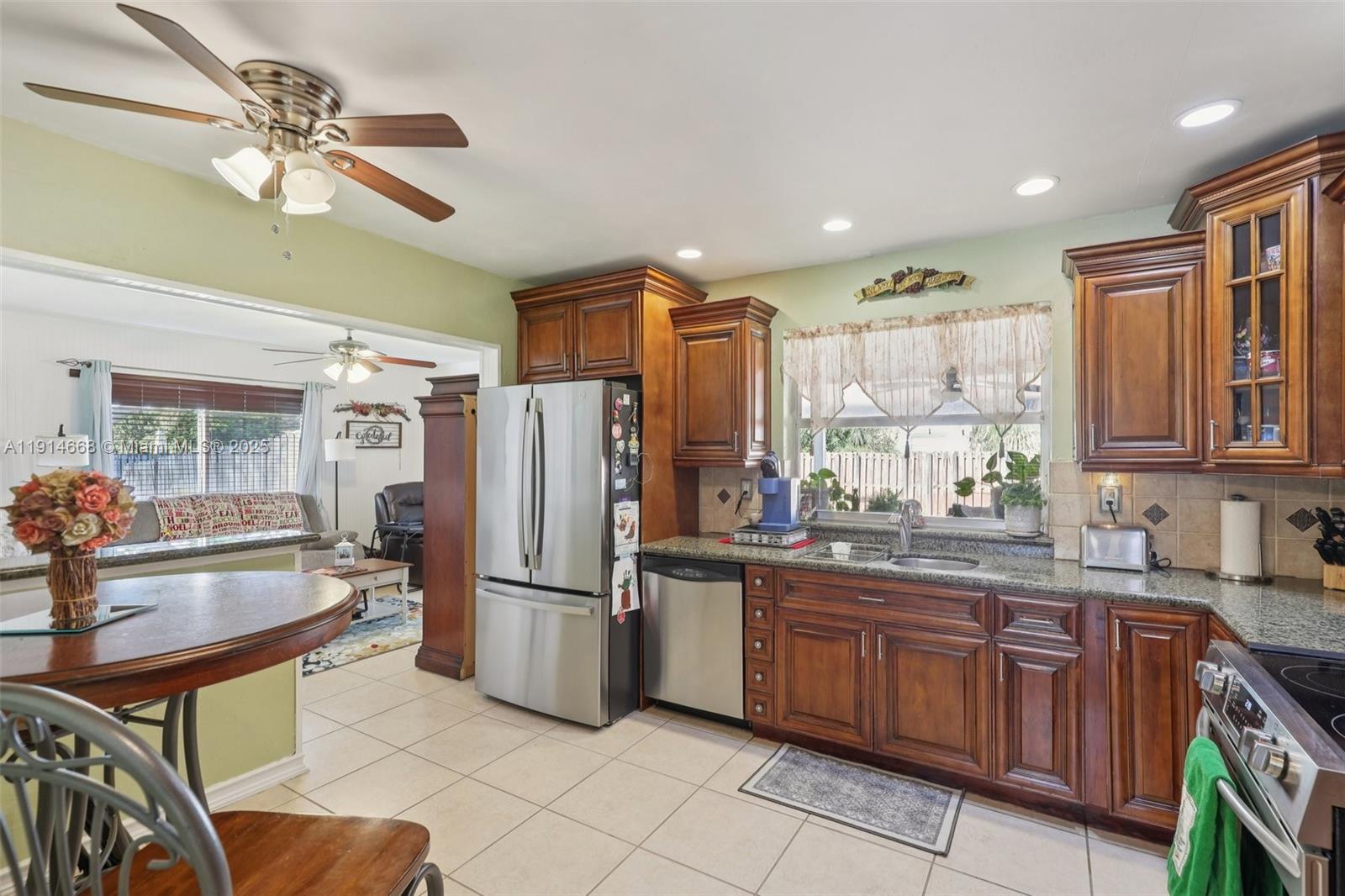 Beautifully maintained home featuring a bright open layout, impact windows, tile floors throughout, and an updated kitchen with wood cabinets, granite countertops, and stainless-steel appliances. Spacious bedrooms and a remodeled bath with dual-sink vanity. Cozy living area with a beautiful fireplace adds warmth and charm. Enjoy the large covered patio with a hurricane-resistant pergola, ceiling fans, seating area, and relaxing hot tub overlooking the fenced backyard. New roof (2025), laundry room, and no HOA. Plenty of space to add a pool or garden area. Conveniently located near schools, parks, shops, dining, and major highways. A true gem offering comfort, character, and modern updates in a desirable neighborhood.