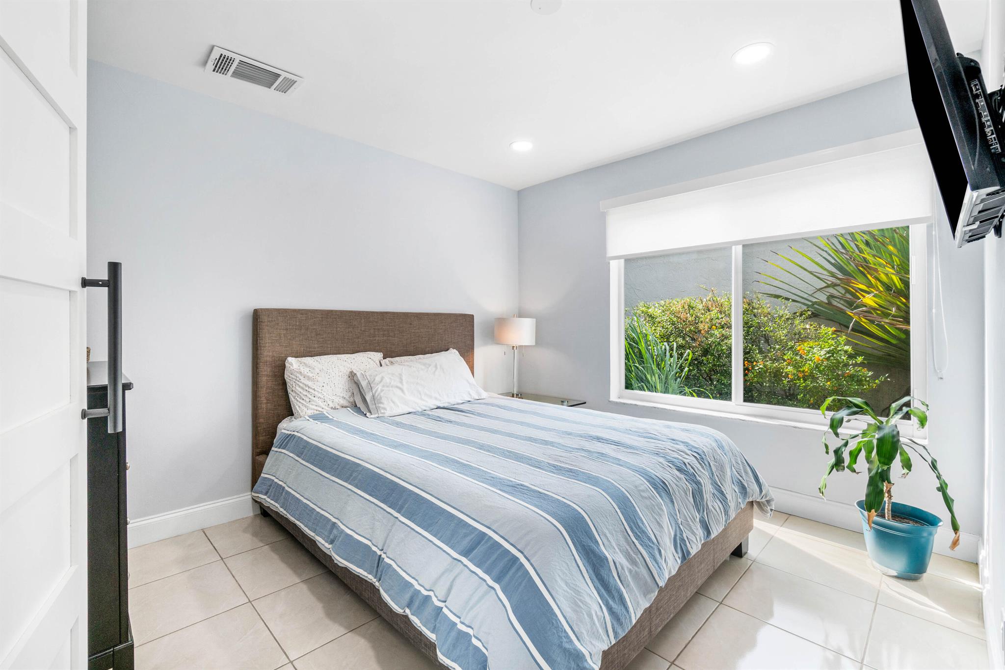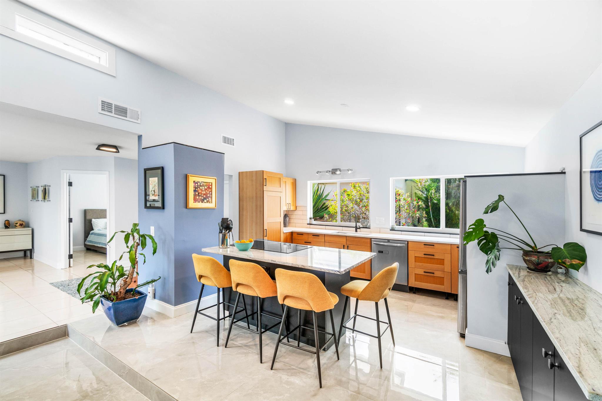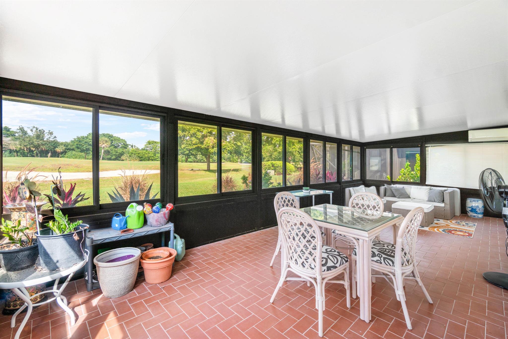 Beautiful golf course views surround this bright and inviting three-bedroom, two-bathroom single-story home. This renovated residence features a stunning modern kitchen with quartz countertops, newer appliances, induction cooktop, and impact windows and sliders throughout. The open floor plan includes a sunken living room, custom closets, and a built-in bar, with no carpeting anywhere in the home.An additional air-conditioned enclosed - patio offers a versatile 270 sq ft bonus room--perfect for relaxing or entertaining while enjoying the serene golf views. Thoughtfully designed for accessibility, the home includes a wheelchair-friendly ramp from the garage and a roll-in shower. Light, bright, and private--this home is move-in ready and beautifully updated inside and out
