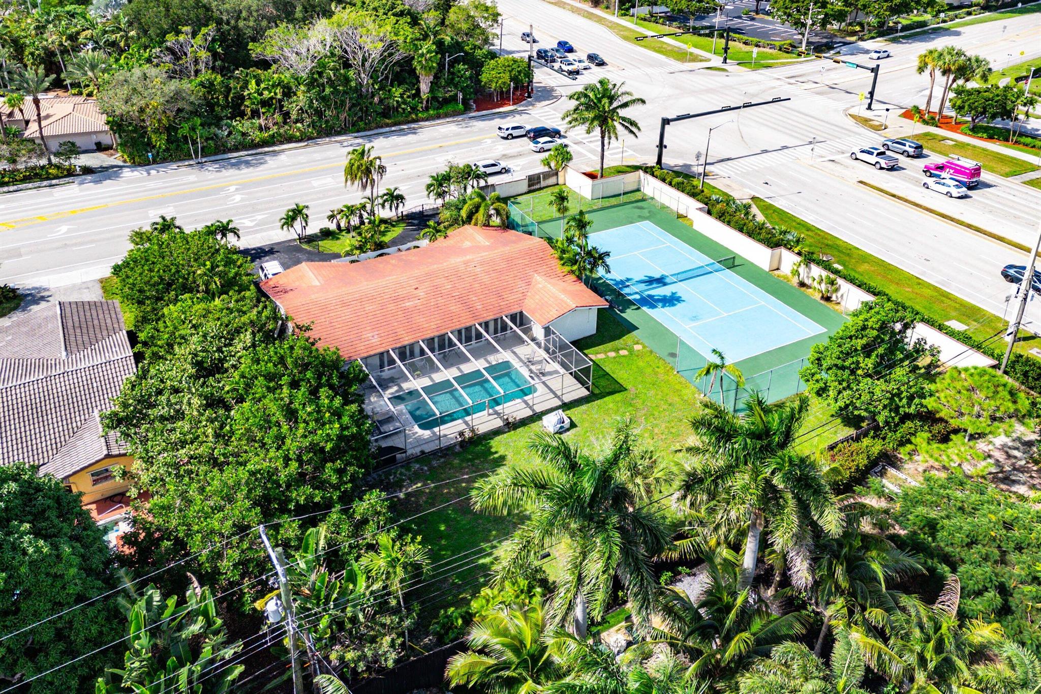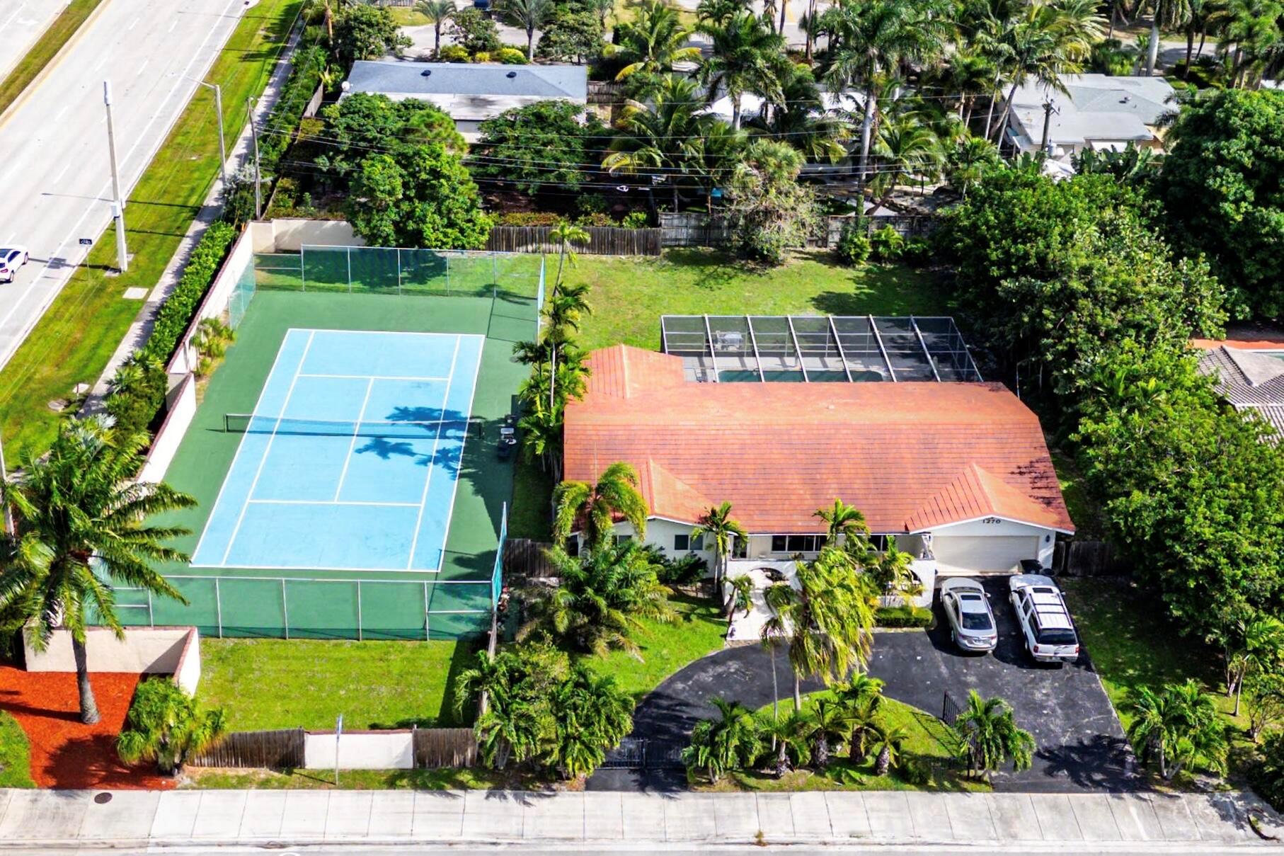 Great location in East Boca--just 25 minutes between FLL and WPB airports. Rare, large corner private lot (.58 acre), fully fenced and perfect for dog lovers. Zoned R-1-C, allowing not only residential use but also certain conditional non-profit uses (Sec. 28-340), such as school, child/adult care, or social center, with City approval. This property is an investment with many possibilities. It offers strong rental income potential, seasonally or annually. The current one lot can be converted back into two buildable lots with the variances required by the City. You can keep it as one lot for residential and conditional use, or build two homes on each deeded lot and sell. A tennis player's dream--this unique property offers many options. All nine high-end impact windows and the