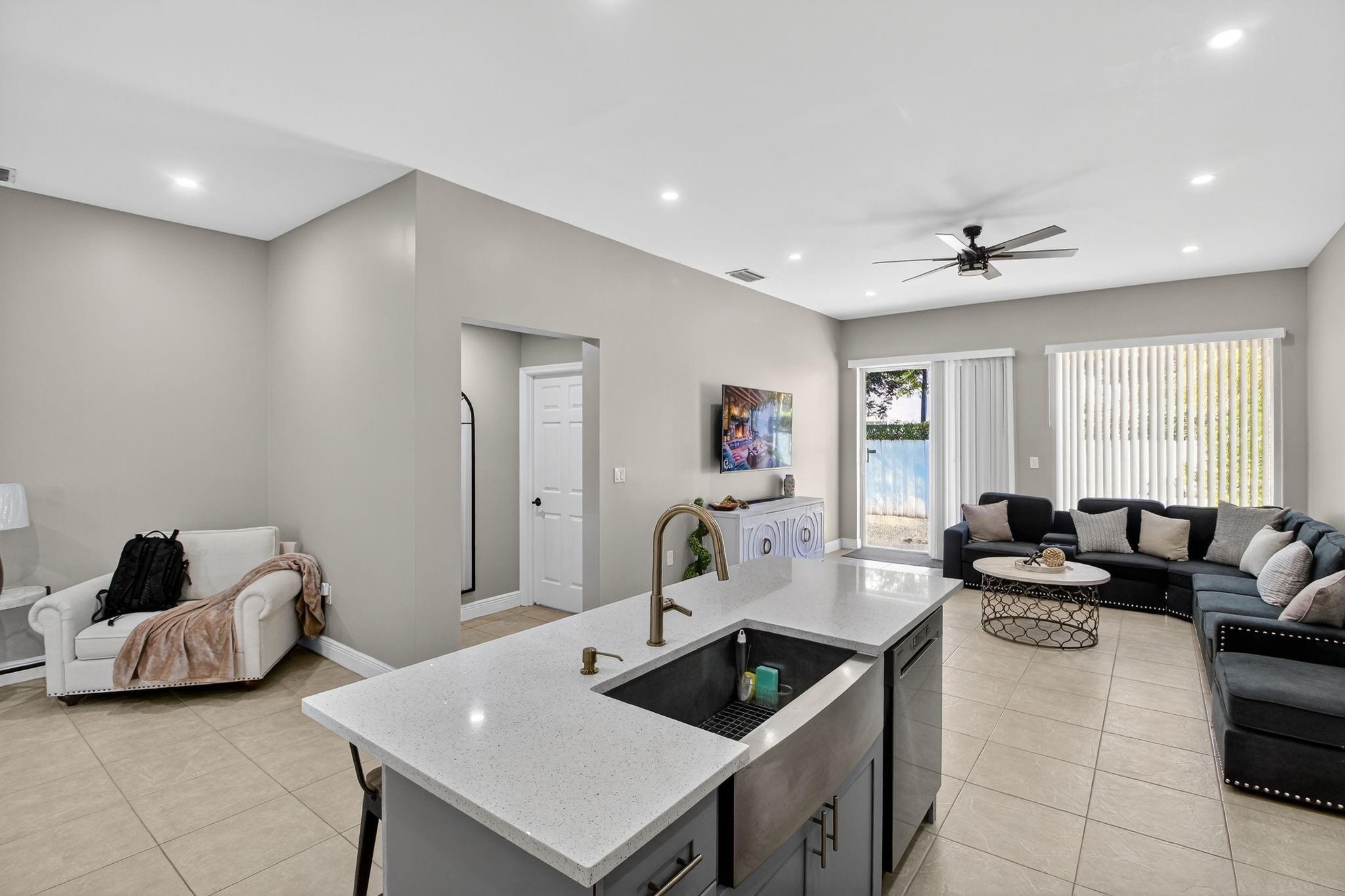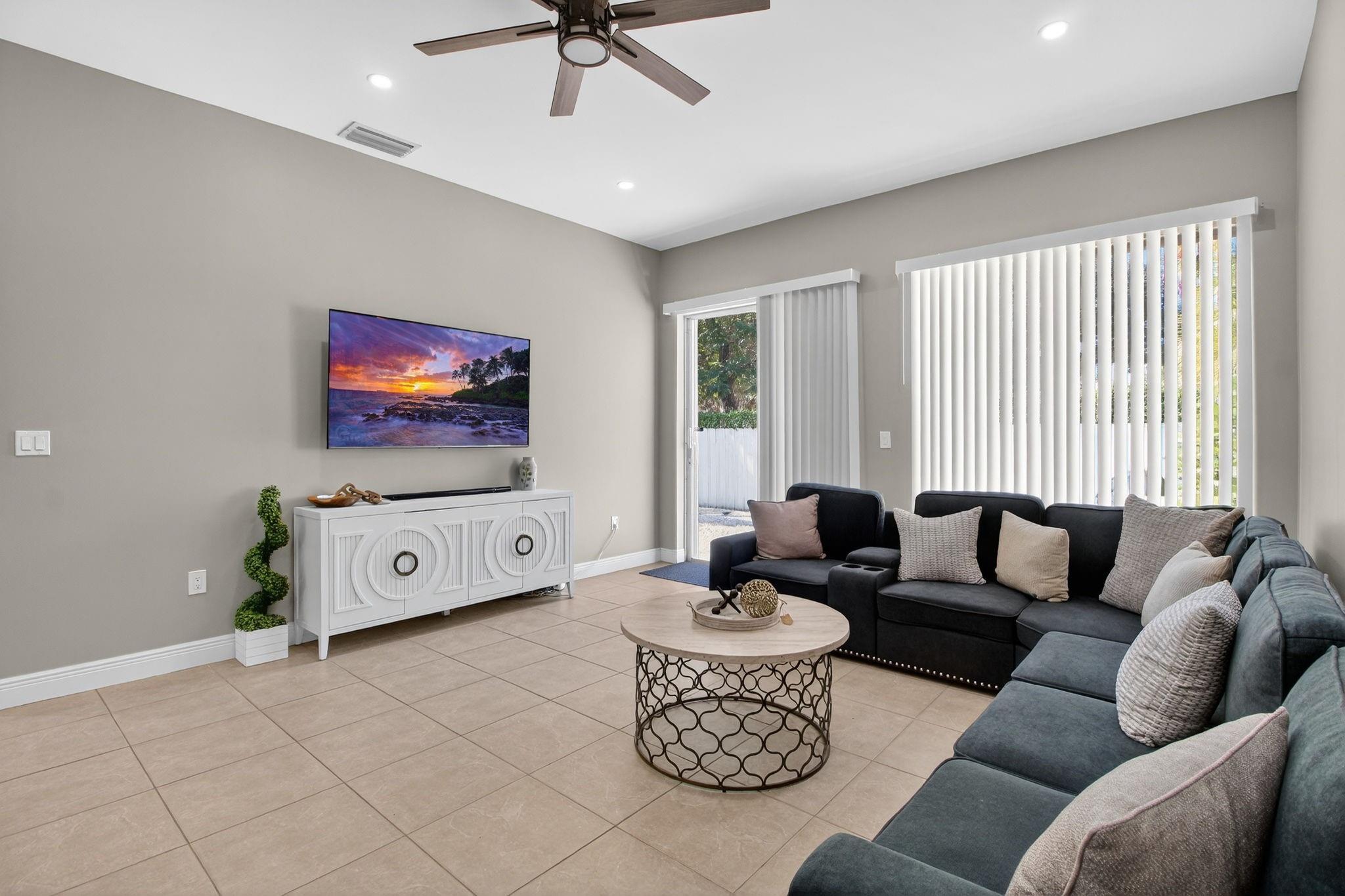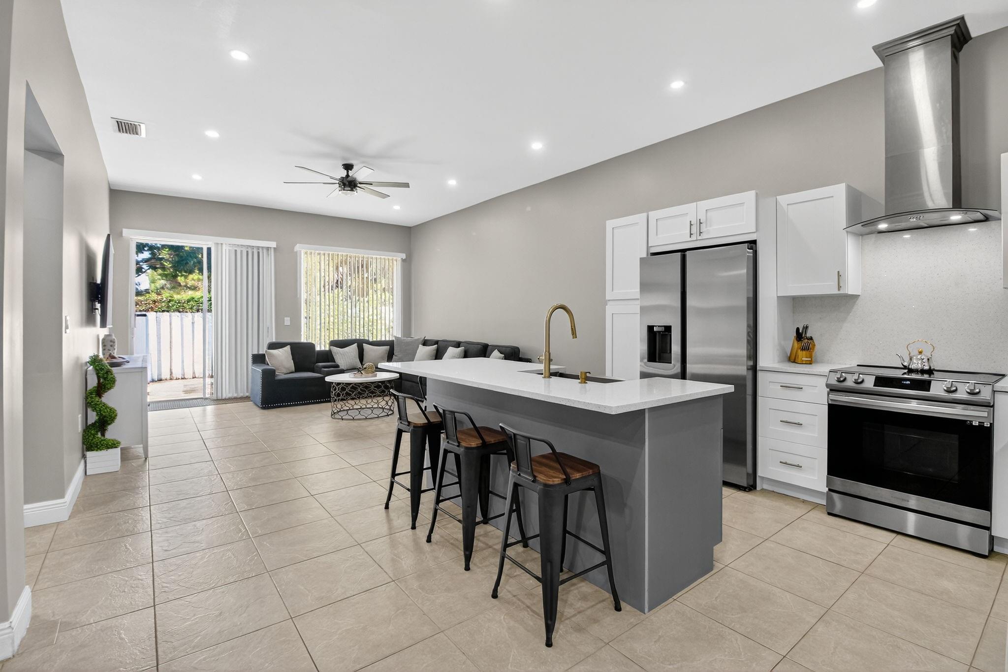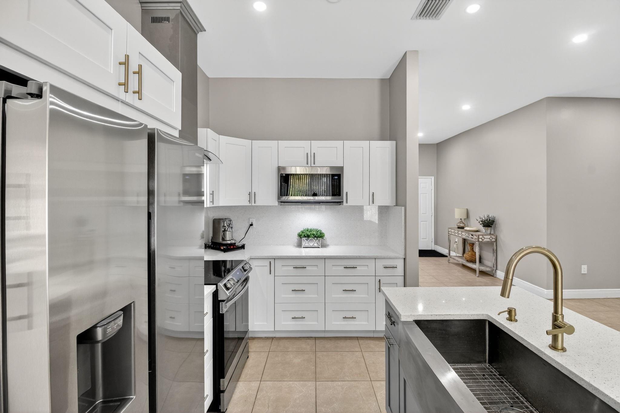 Step into this beautifully renovated 3BR/2BA home with a one-car garage, offering modern luxury and timeless style. Freshly painted interiors feature an open living and dining area and a stunning kitchen with quartz waterfall countertops and stainless-steel appliances. Both bathrooms are elegantly updated, and the spacious primary suite includes an oversized bath and walk-in closet. Enjoy a private, fully fenced backyard with a charming patio—perfect for relaxing or entertaining. Located in the highly sought-after POINCIANA AT SUNSET LAKES community with 24/7 security and minutes from parks, dining, shops, the library, and Baptist Health Hospital.