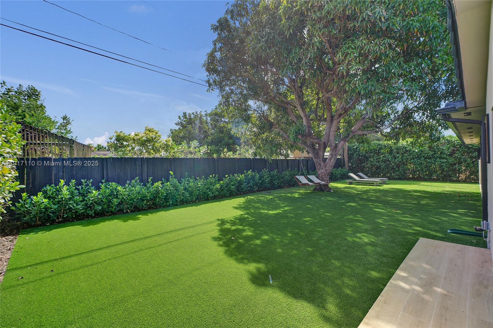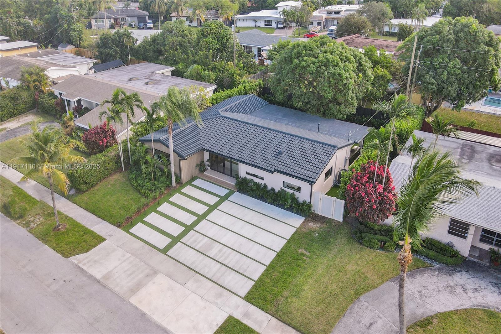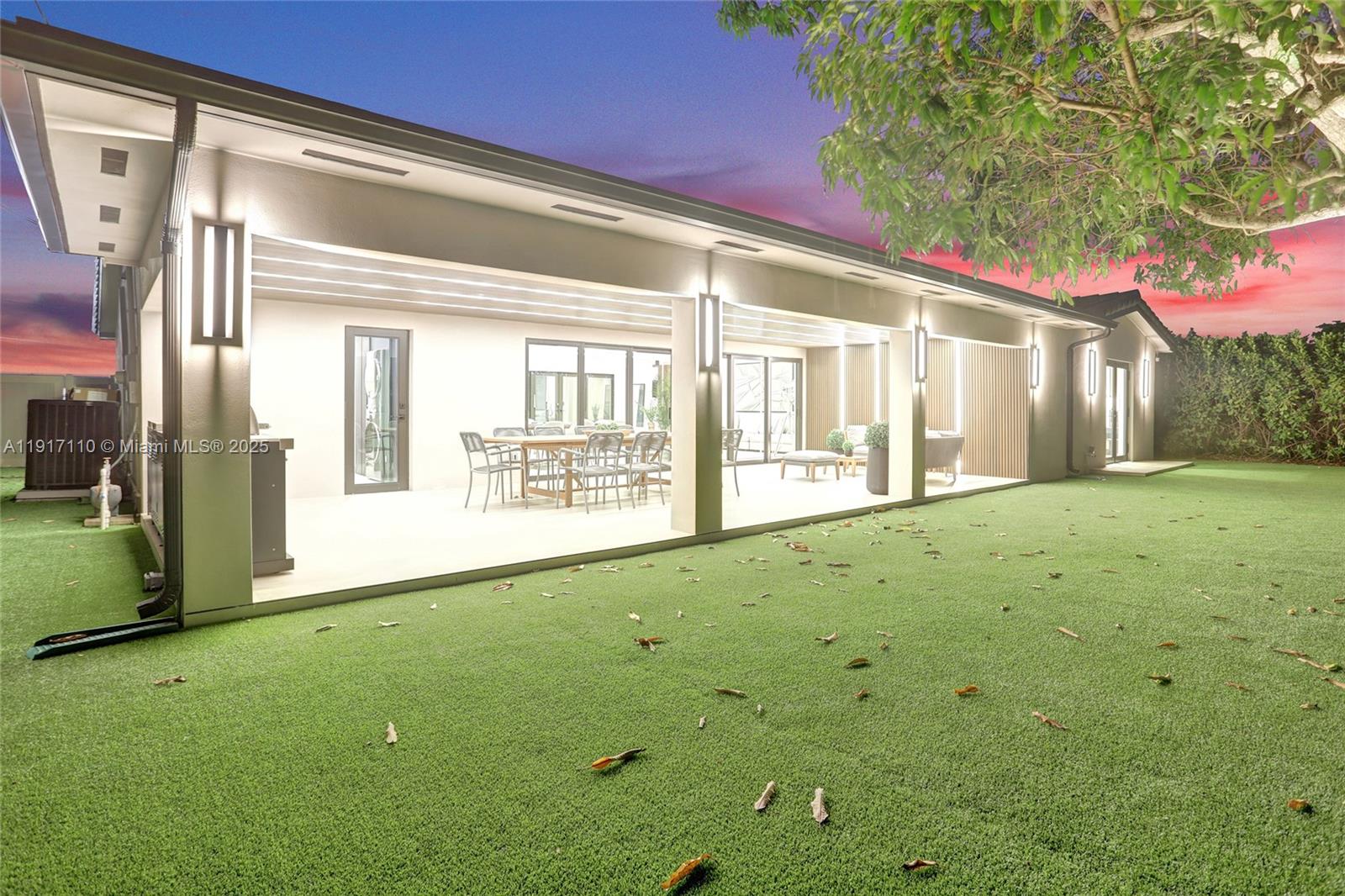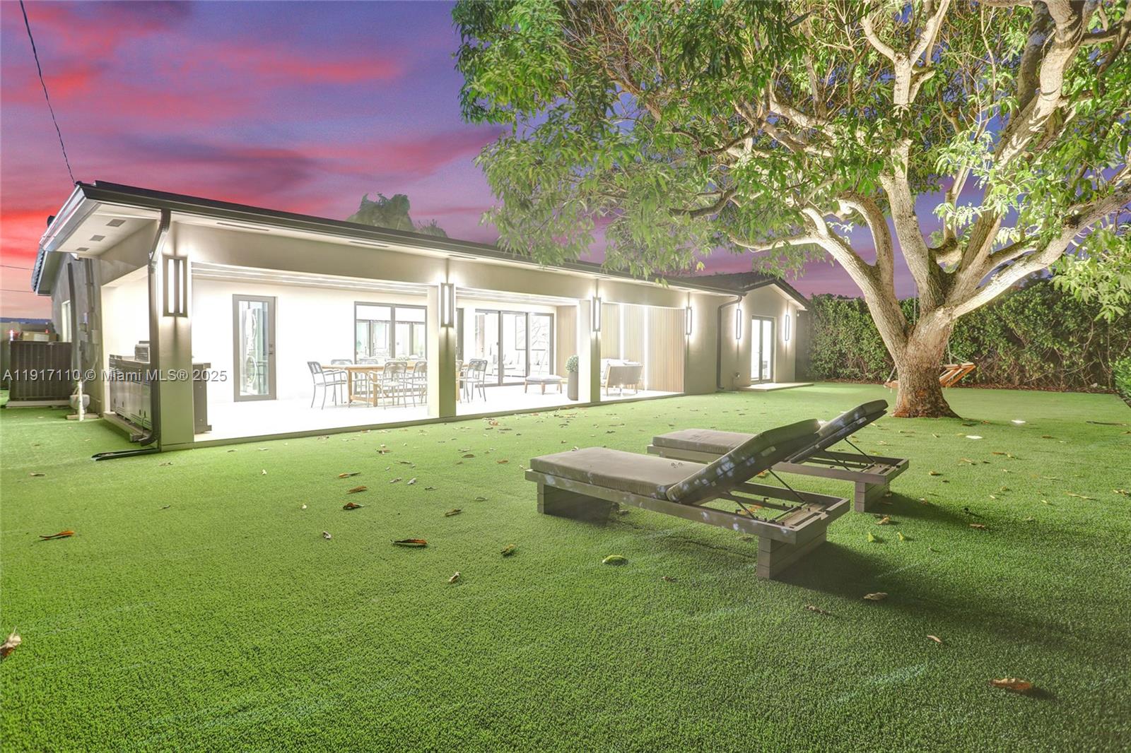 Stunning, fully remodeled modern home featuring clean architectural lines, warm natural tones, and top-quality finishes throughout. The open-concept layout highlights a sleek Italian-style kitchen with custom wood cabinetry, quartz countertops, and top-of-the-line appliances, including stainless steel appliances. This elegant residence features impact-resistant windows and doors, Italian-built-in closets, large porcelain floors, high ceilings, and designer LED lighting. The spacious living and dining areas are surrounded by glass sliders that fill the home with natural light and create a perfect indoor-outdoor flow. The outdoor space is designed for entertaining, featuring a built-in BBQ, artificial grass, and beautifully landscaped gardens. Every detail combines luxury and functionality