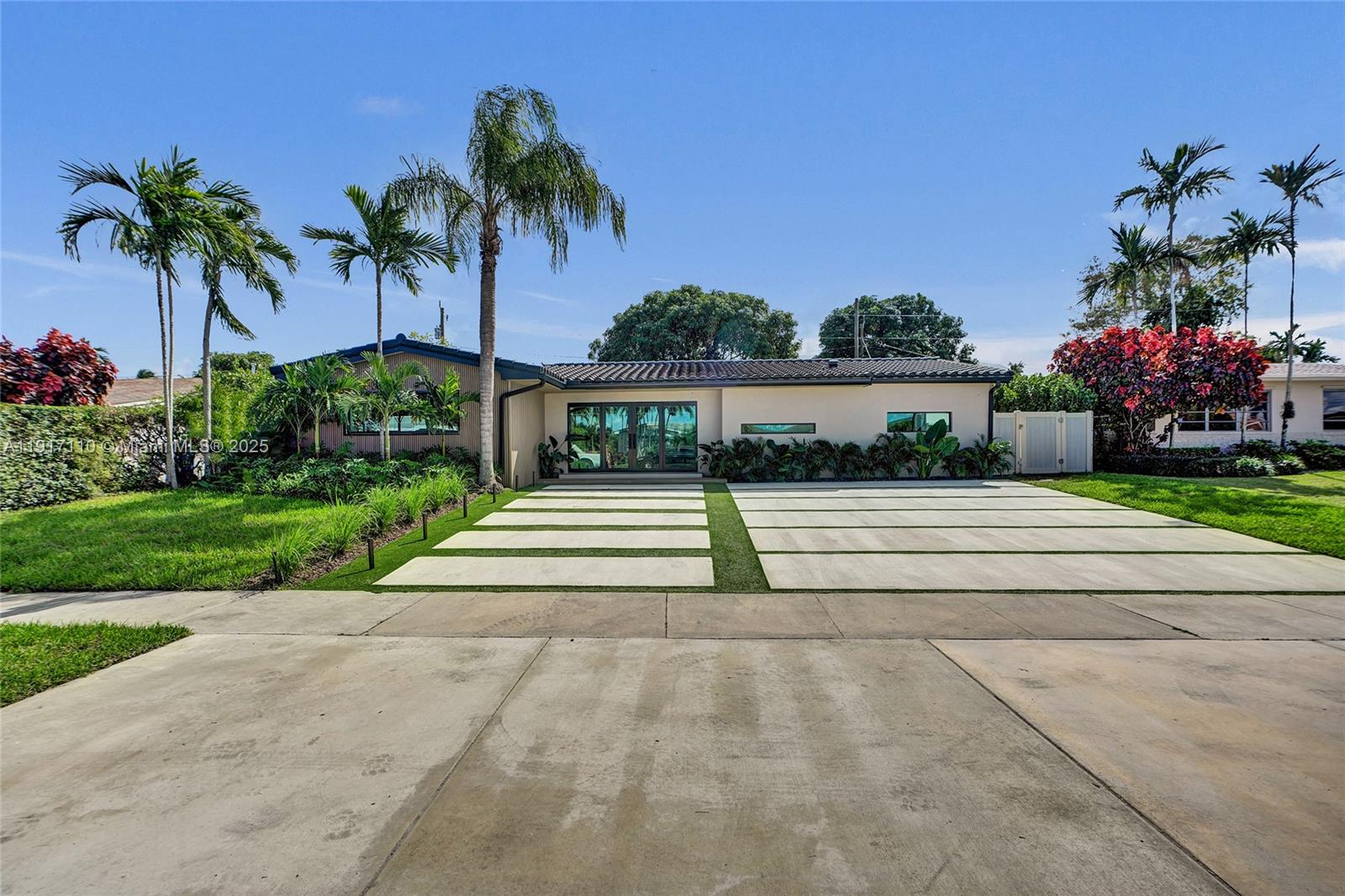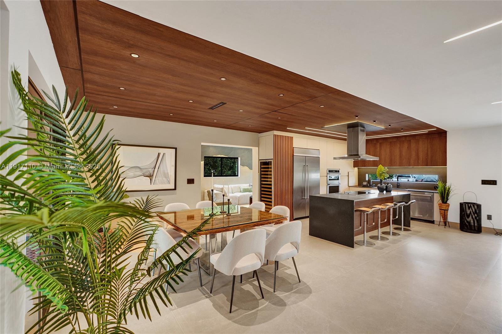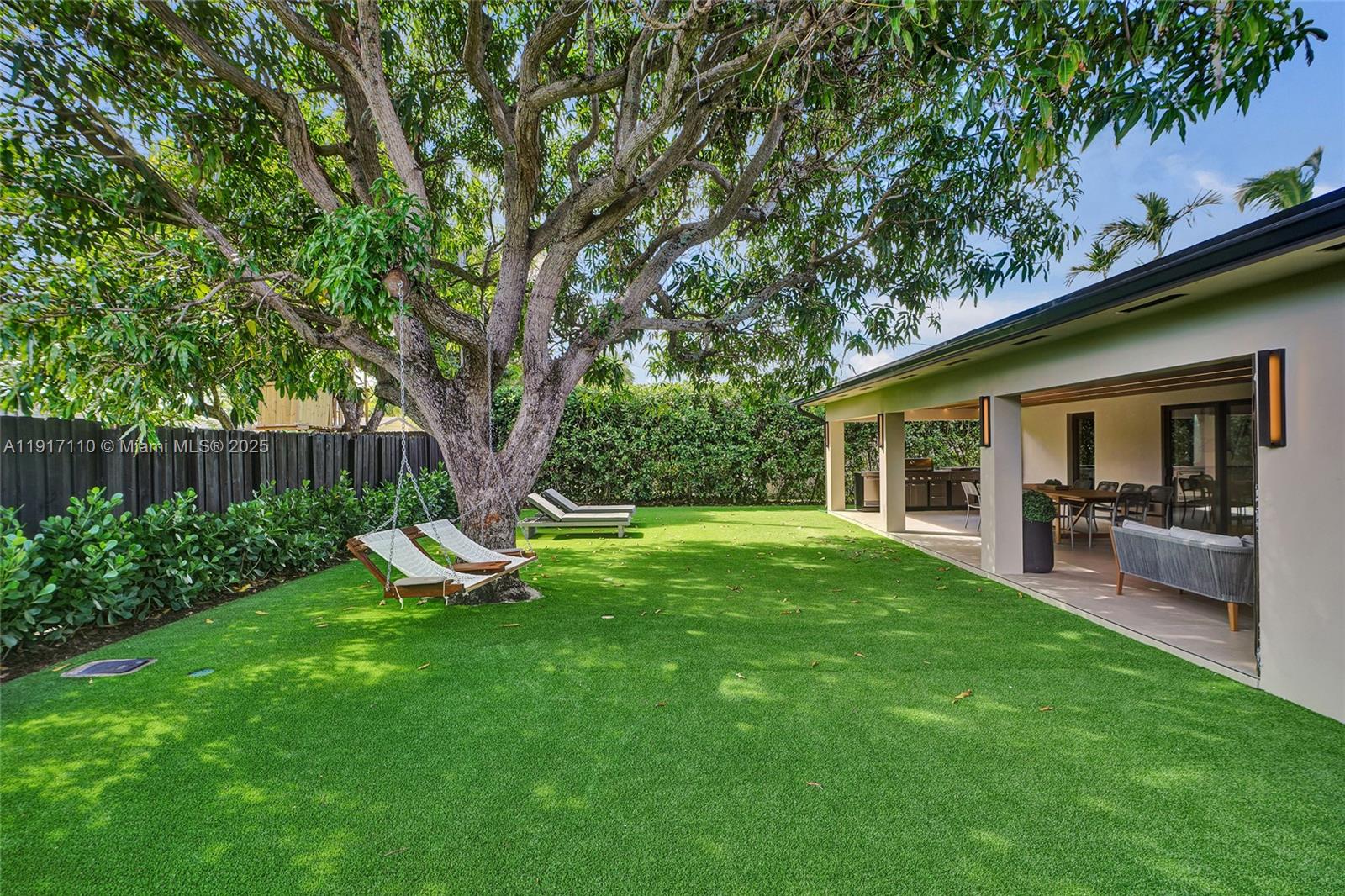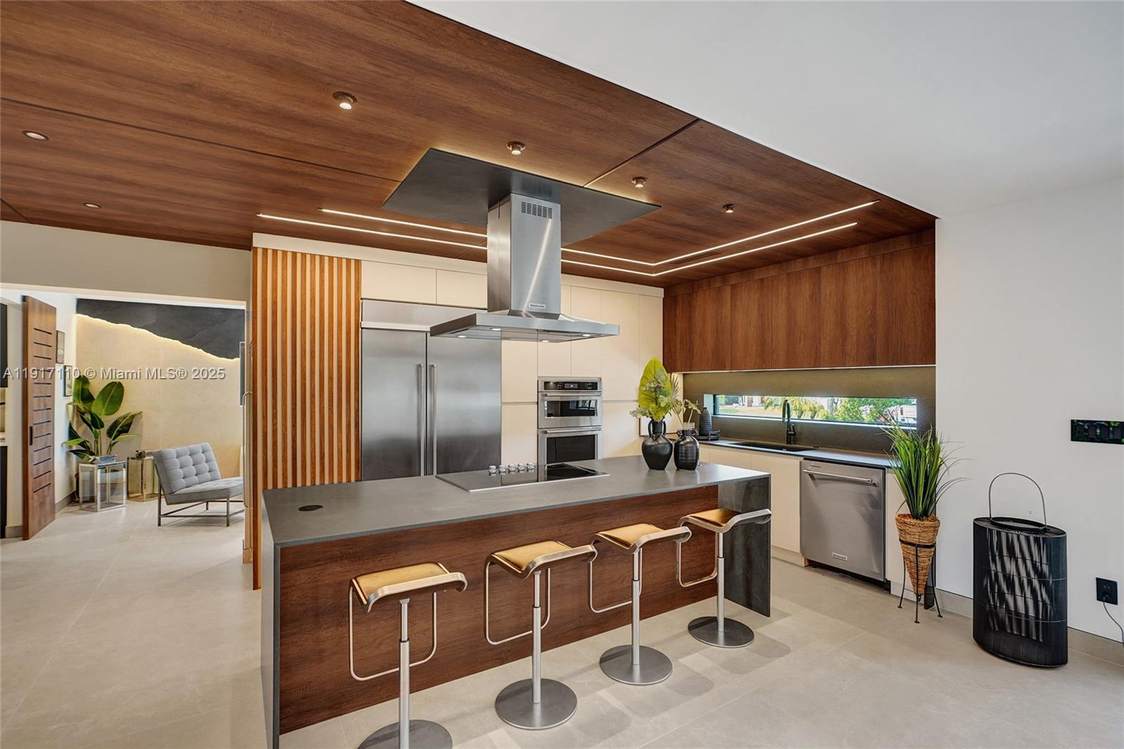 Stunning, fully remodeled modern home featuring clean architectural lines, warm natural tones, and top-quality finishes throughout. The open-concept layout highlights a sleek Italian-style kitchen with custom wood cabinetry, quartz countertops, and top-of-the-line appliances, including stainless steel appliances. This elegant residence features impact-resistant windows and doors, Italian-built-in closets, large porcelain floors, high ceilings, and designer LED lighting. The spacious living and dining areas are surrounded by glass sliders that fill the home with natural light and create a perfect indoor-outdoor flow. The outdoor space is designed for entertaining, featuring a built-in BBQ, artificial grass, and beautifully landscaped gardens. Every detail combines luxury and functionality