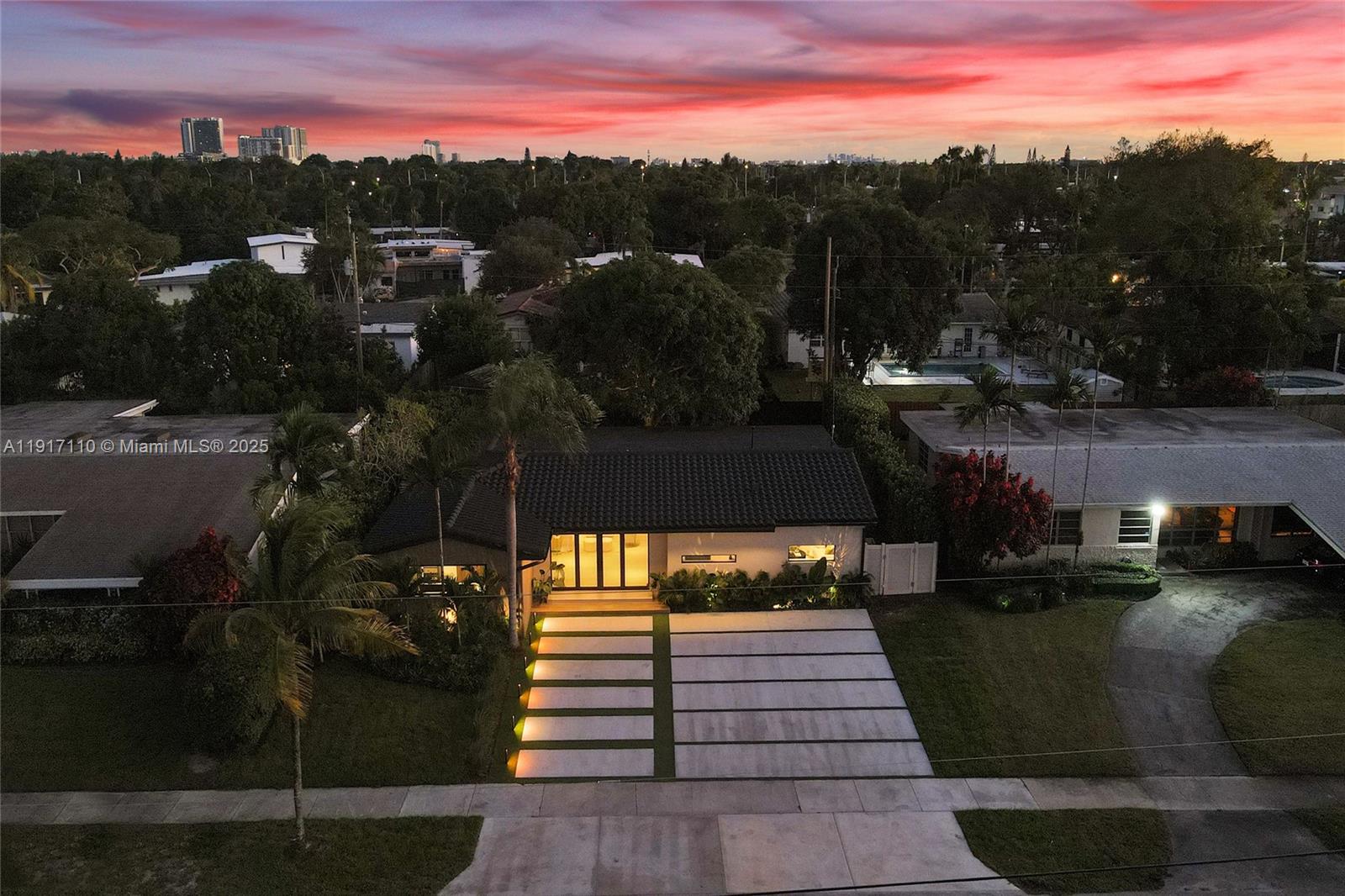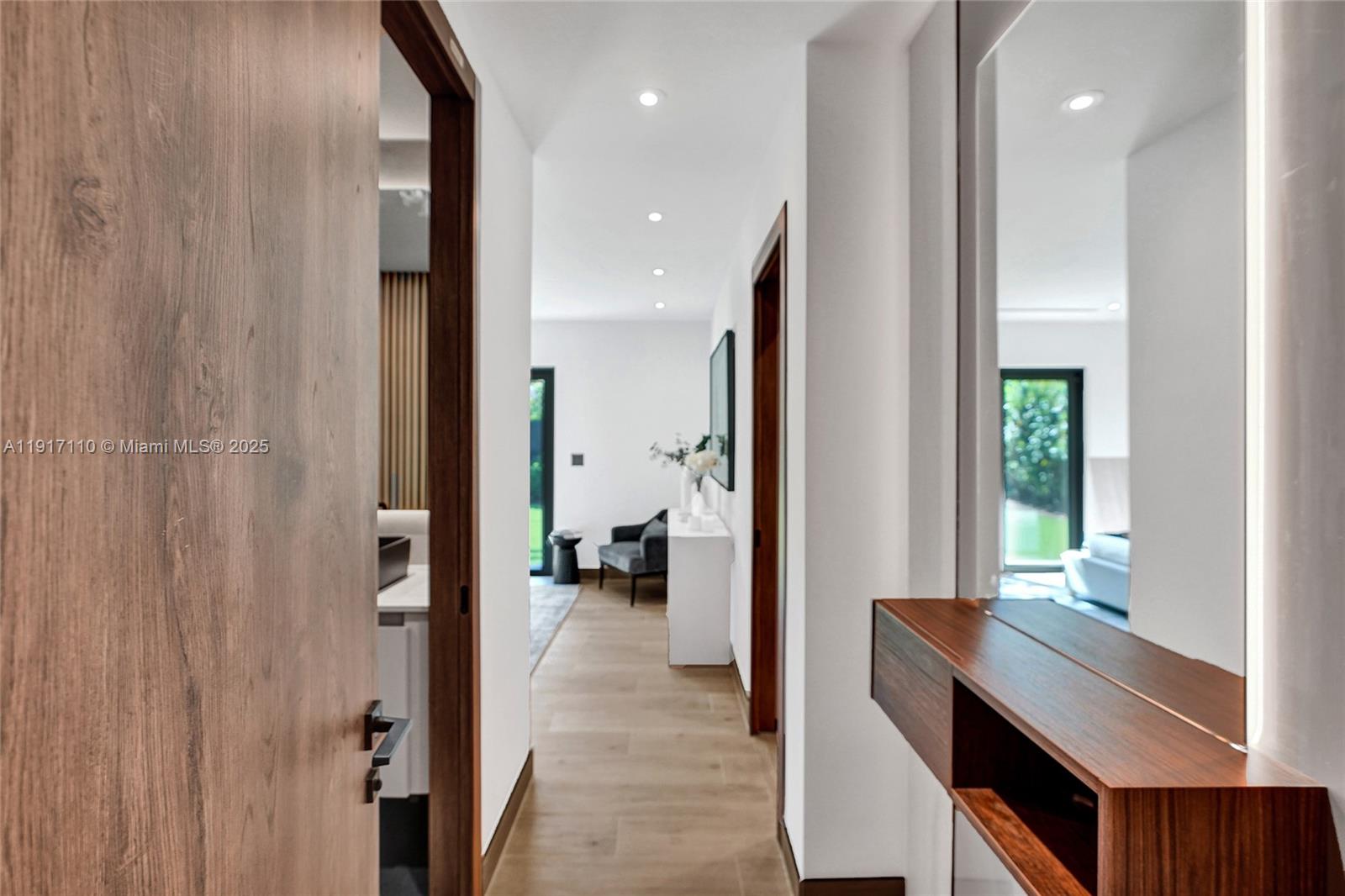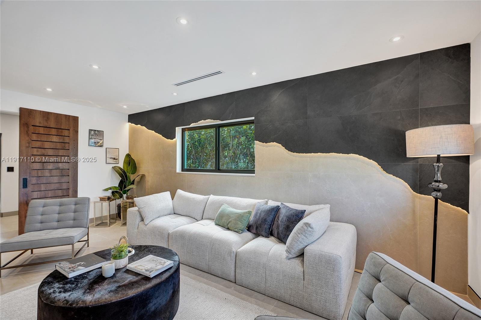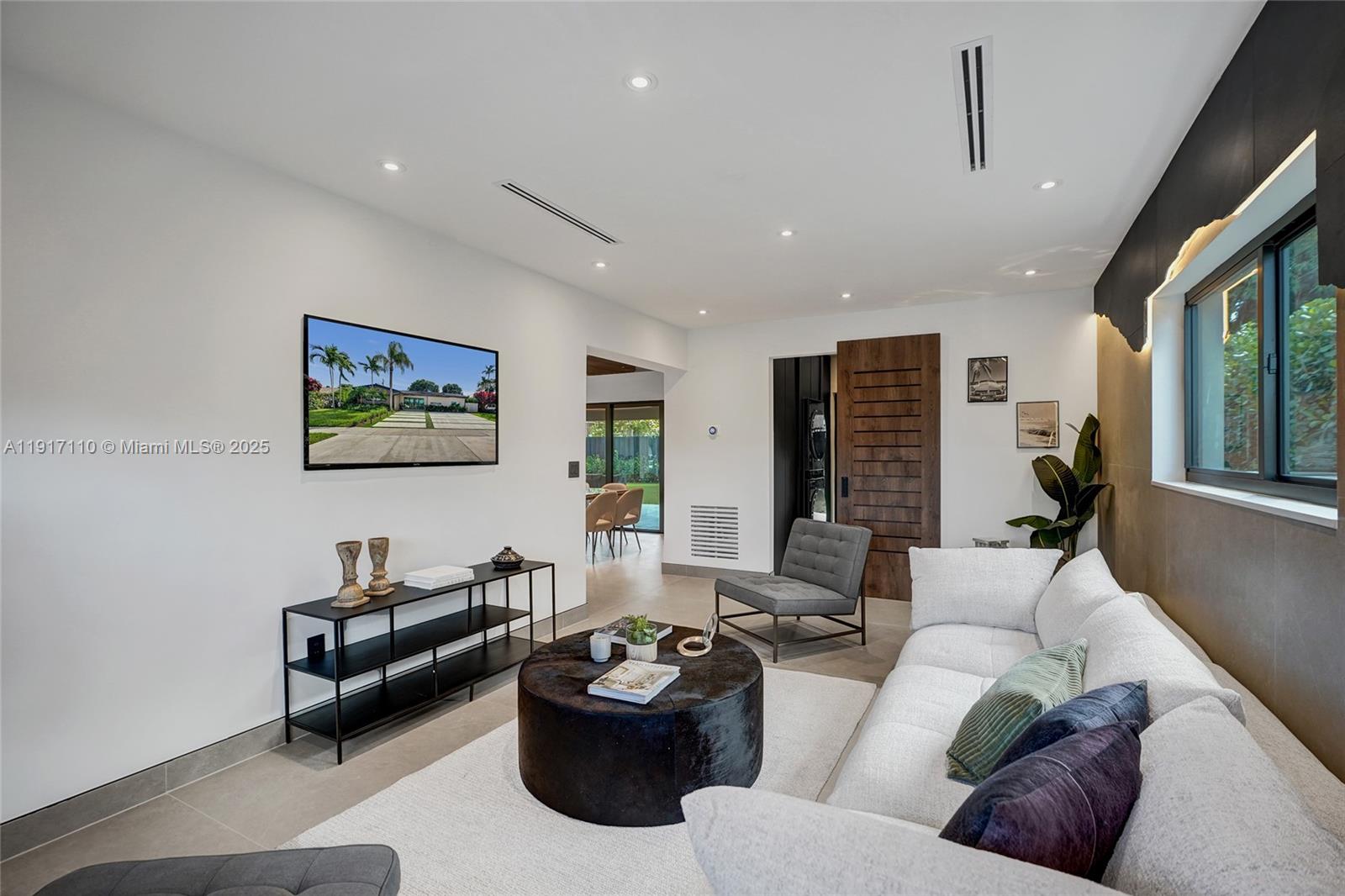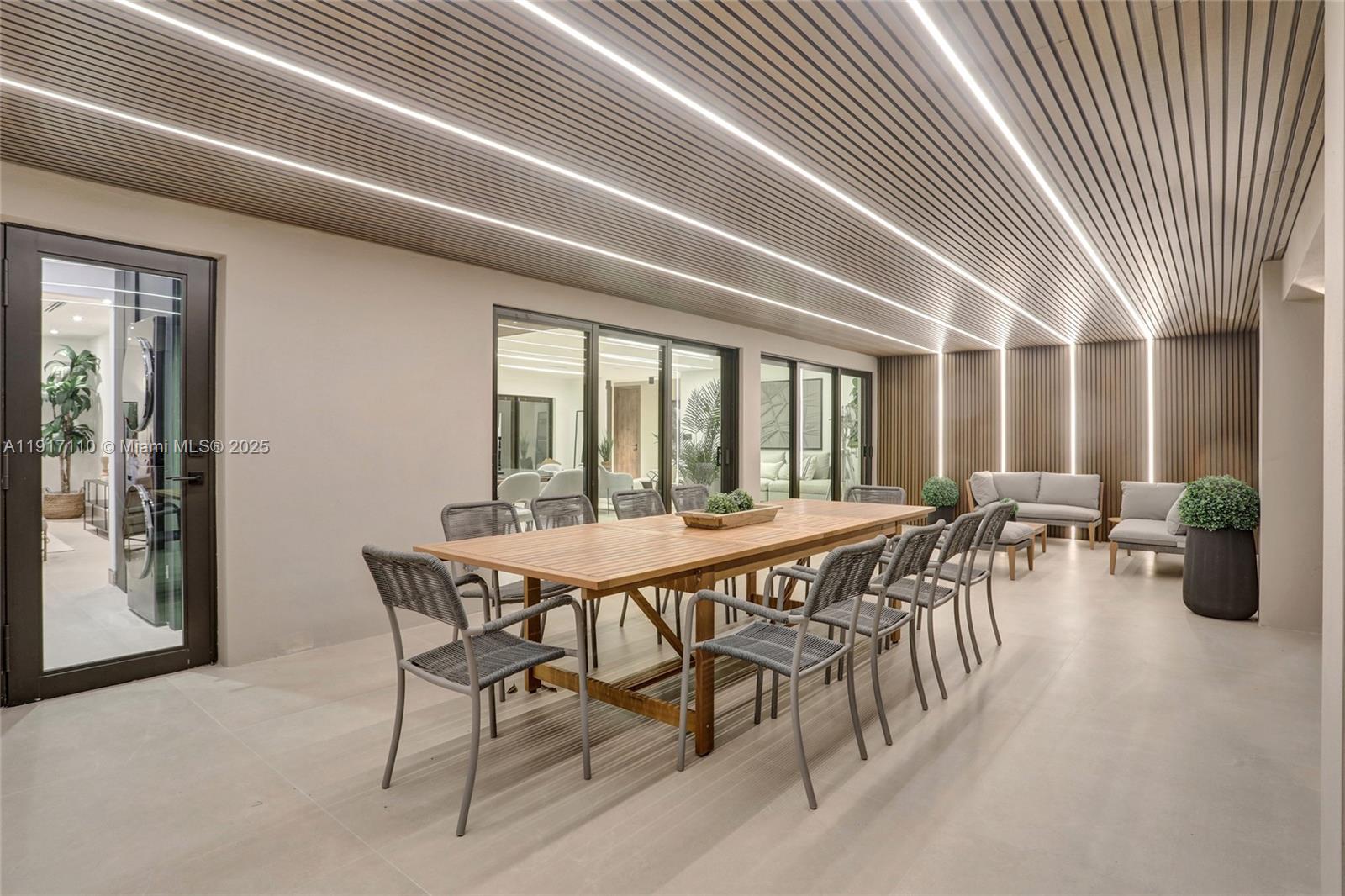 Stunning, fully remodeled modern home featuring clean architectural lines, warm natural tones, and top-quality finishes throughout. The open-concept layout highlights a sleek Italian-style kitchen with custom wood cabinetry, quartz countertops, and top-of-the-line appliances, including stainless steel appliances. This elegant residence features impact-resistant windows and doors, Italian-built-in closets, large porcelain floors, high ceilings, and designer LED lighting. The spacious living and dining areas are surrounded by glass sliders that fill the home with natural light and create a perfect indoor-outdoor flow. The outdoor space is designed for entertaining, featuring a built-in BBQ, artificial grass, and beautifully landscaped gardens. Every detail combines luxury and functionality