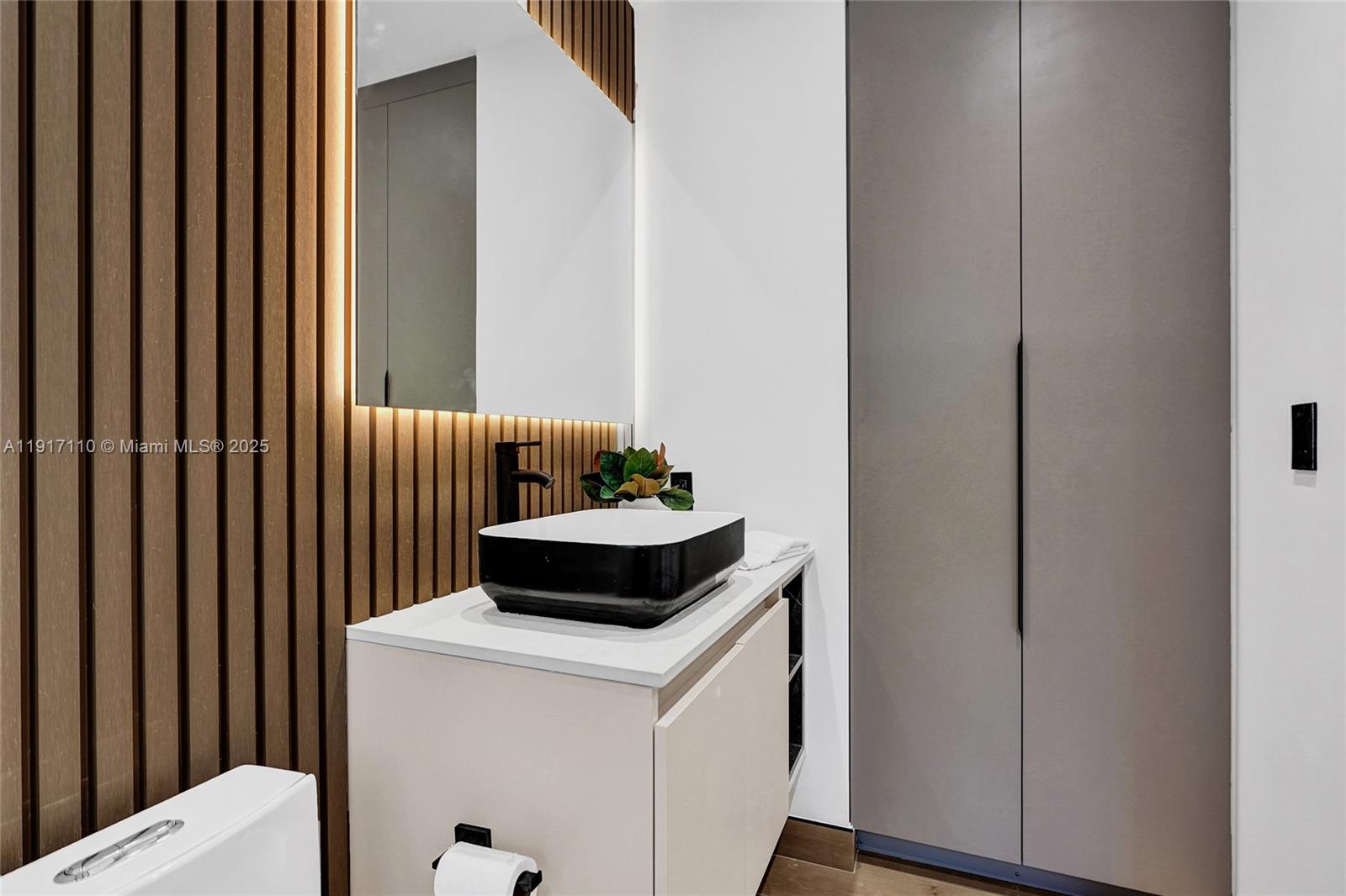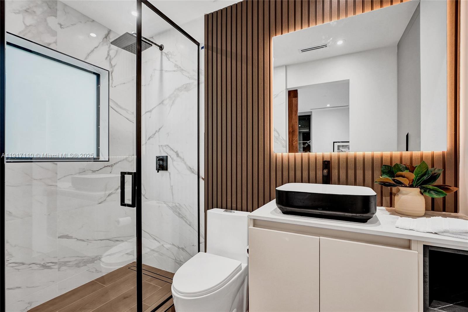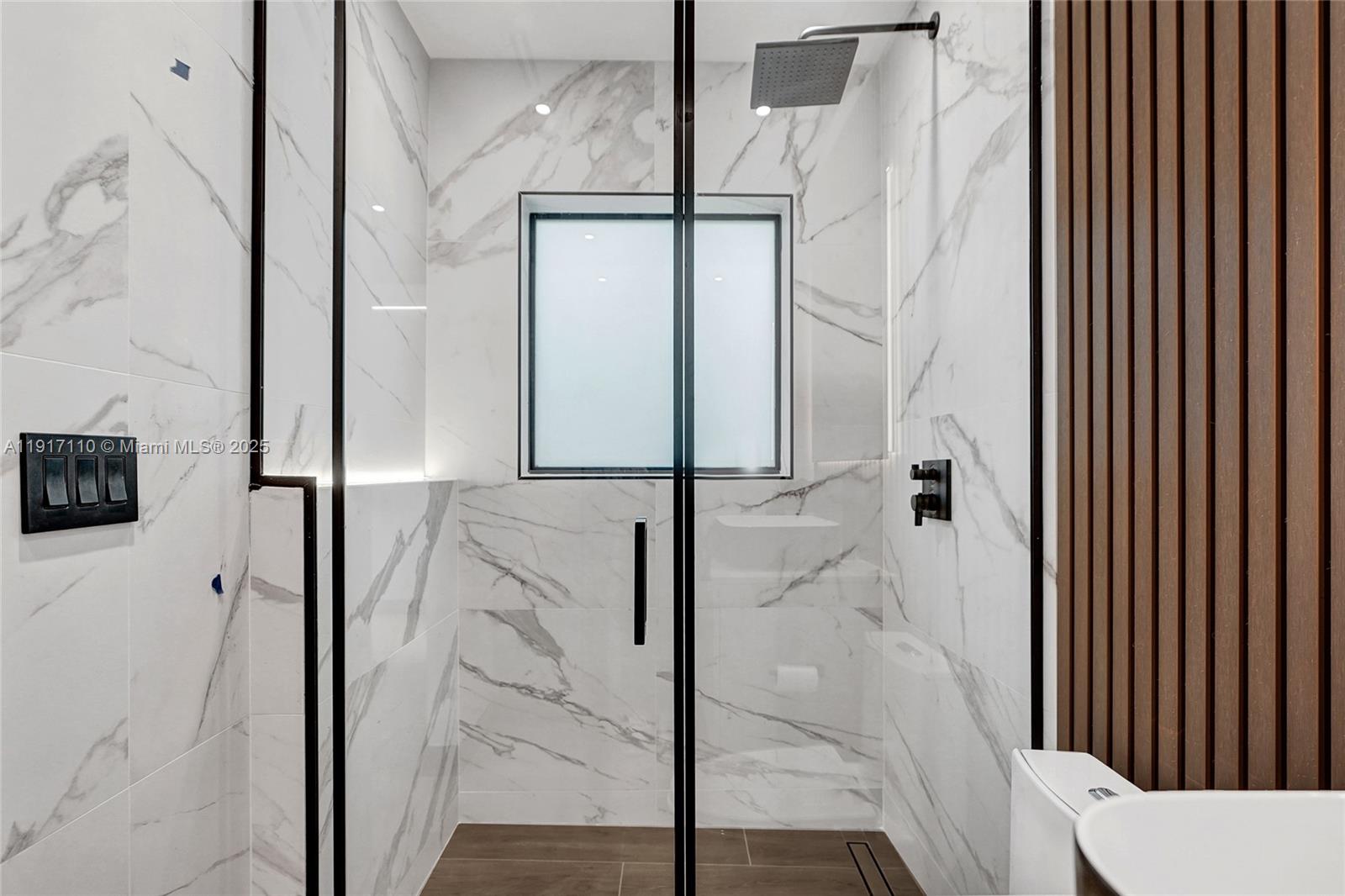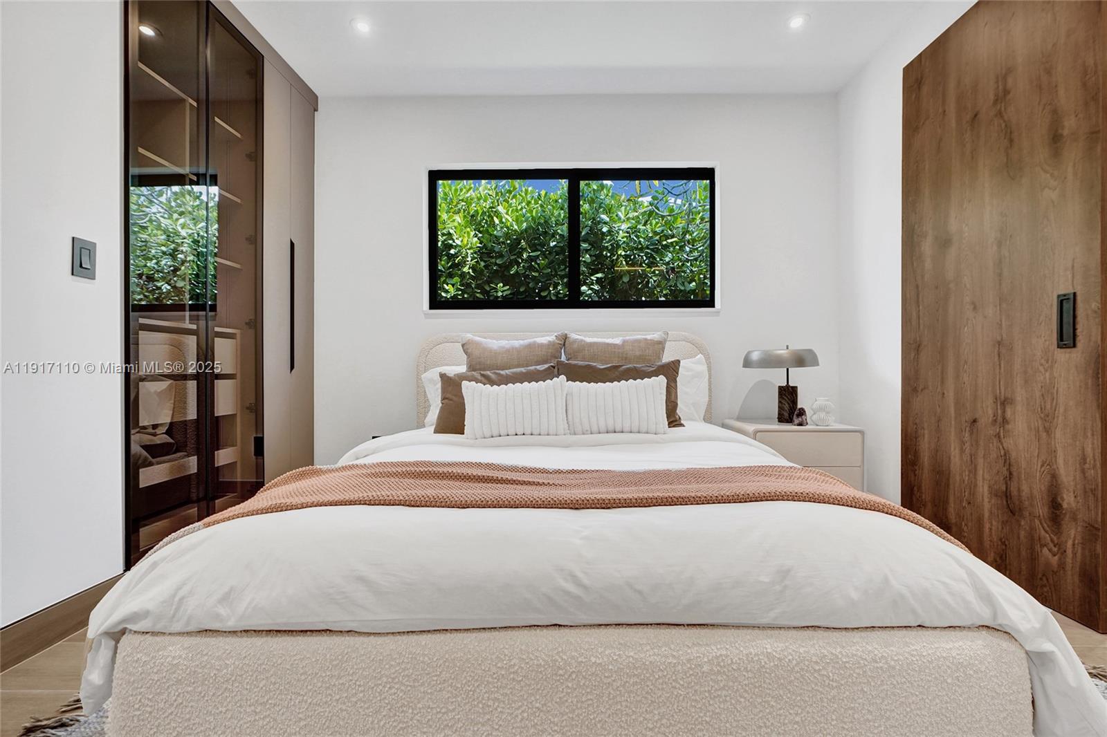 Stunning, fully remodeled modern home featuring clean architectural lines, warm natural tones, and top-quality finishes throughout. The open-concept layout highlights a sleek Italian-style kitchen with custom wood cabinetry, quartz countertops, and top-of-the-line appliances, including stainless steel appliances. This elegant residence features impact-resistant windows and doors, Italian-built-in closets, large porcelain floors, high ceilings, and designer LED lighting. The spacious living and dining areas are surrounded by glass sliders that fill the home with natural light and create a perfect indoor-outdoor flow. The outdoor space is designed for entertaining, featuring a built-in BBQ, artificial grass, and beautifully landscaped gardens. Every detail combines luxury and functionality