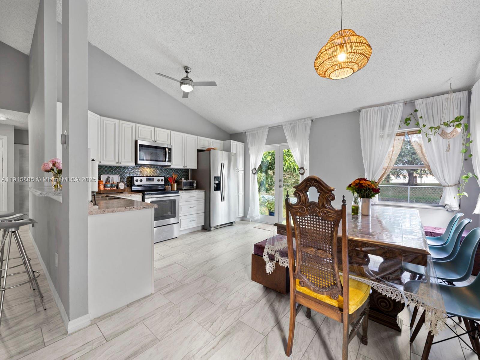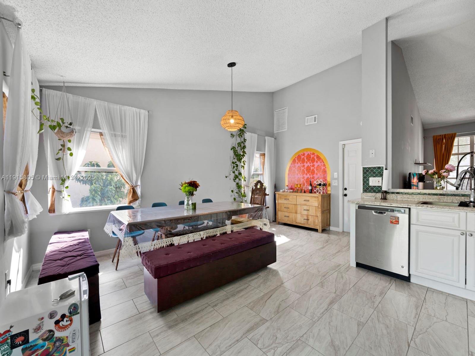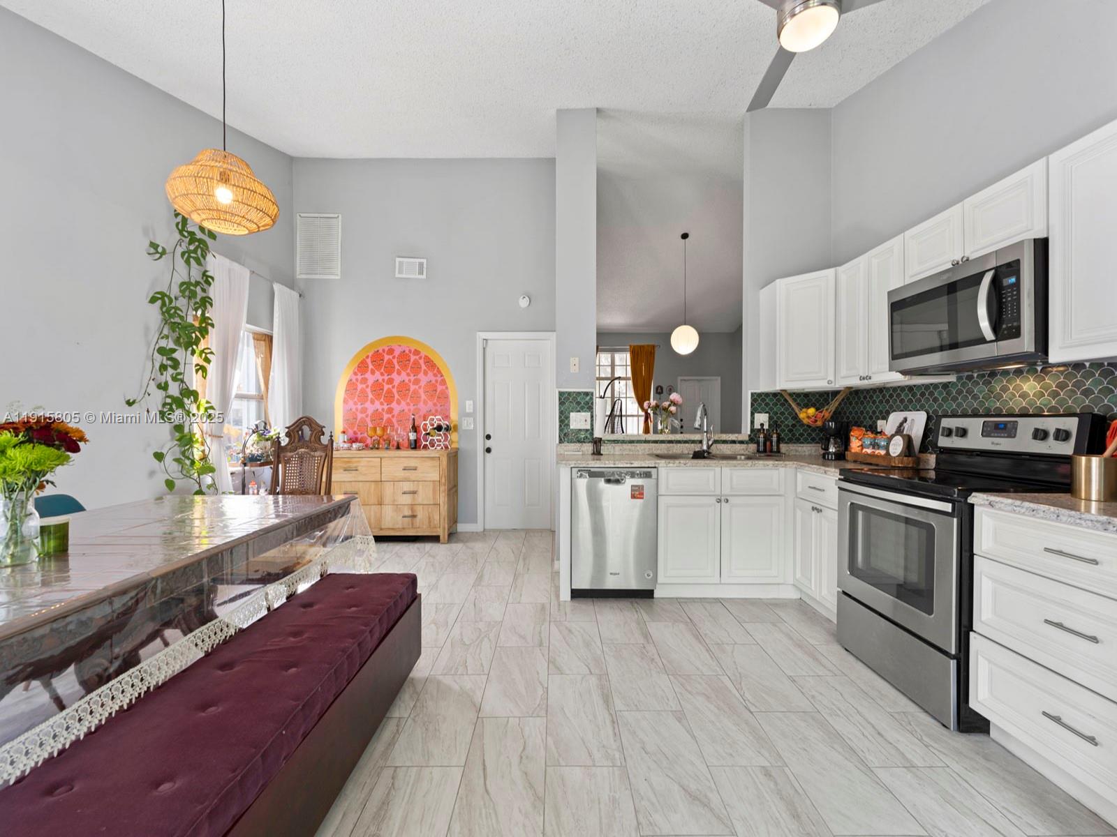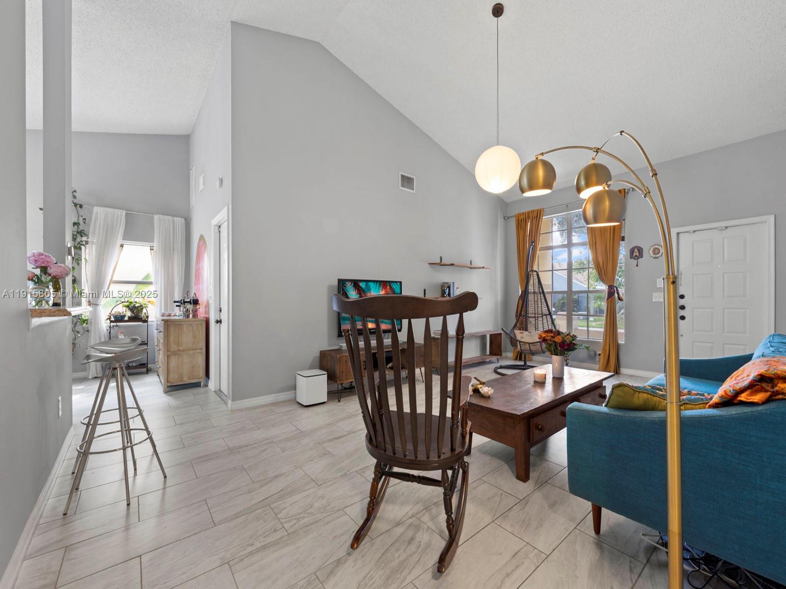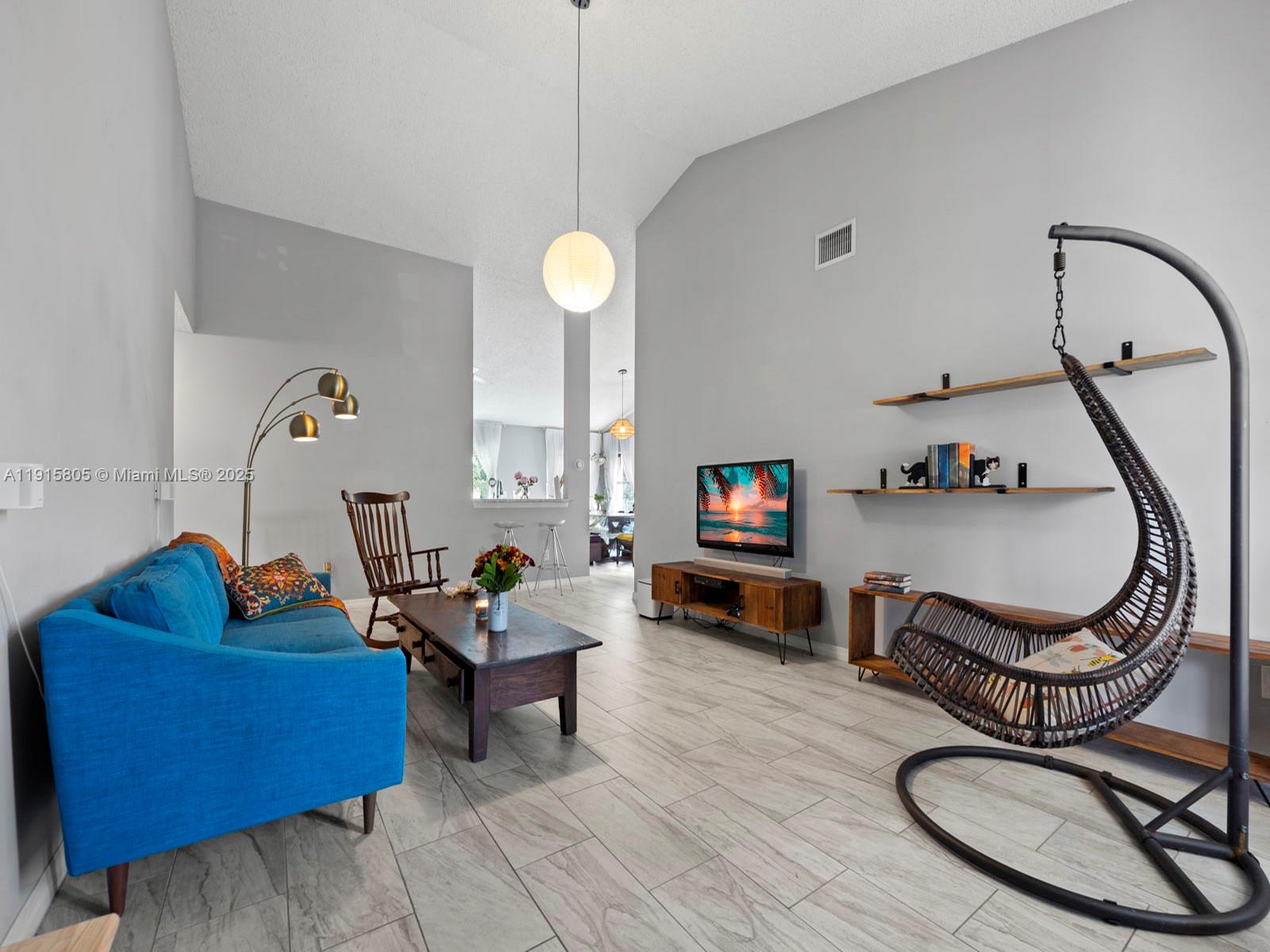Welcome to this tranquil, family-friendly community in Pembroke Pines. This charming home features 3 bedrooms, 2 bathrooms, and a 1-car garage, offering a layout full of potential. Enjoy added peace of mind with storm shutters, plus a private backyard lined with fruit trees and a calming waterway view. The high vaulted ceilings in the living area create an inviting sense of openness, while the flowing floor plan makes entertaining effortless. The low HOA of $151 per month includes access to a community pool, tennis courts, a playground, and more. Conveniently located near top-rated schools, shopping, and major highways