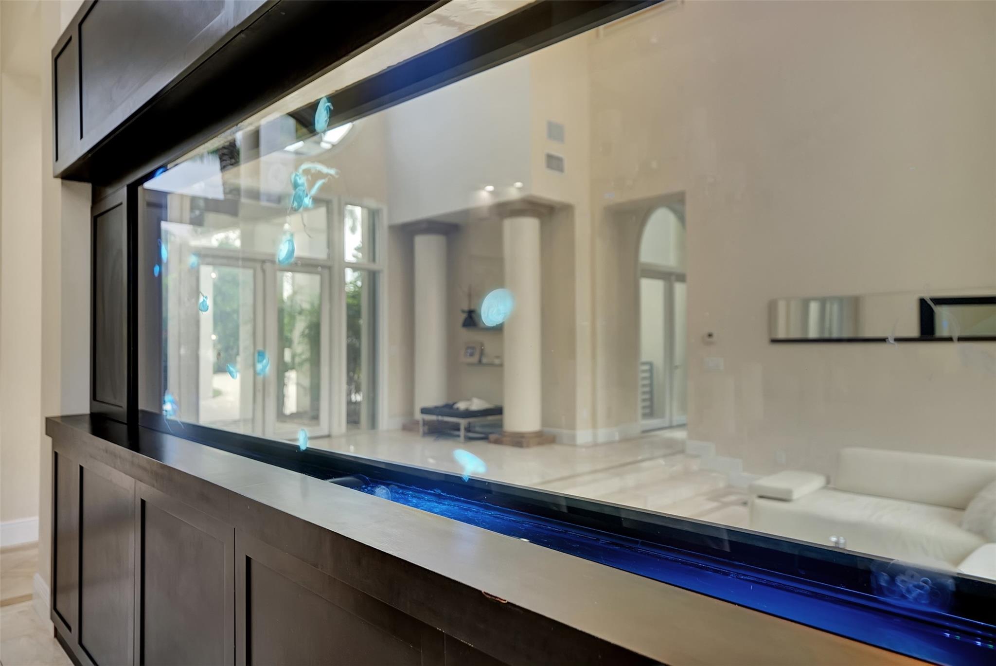 Magnificent mixture of mid-century modern and contemporary architectural masterpiece, 11,794 total square feet on 2.2 acres of private gated compound. Walk in the foyer to dramatic 30 foot ceilings and a 600 gallon jellyfish tank. Hi-end stainless steel appliances, gourmet kitchen, granite countertops, hardwood & marble floors throughout the living area! Large den, office & recreation room. Very nice in-law quarters completely separate from the main house with a full kitchen. The main attraction is the 140,000 gallon swimming pool, jacuzzi with waterfalls with a fire feature, & a swim-up bar. Large windows everywhere, sun filled in every room. Private patios w/ views of pool, land, basketball court, and much more. If you love to entertain this is the home for it, it is your own resort!