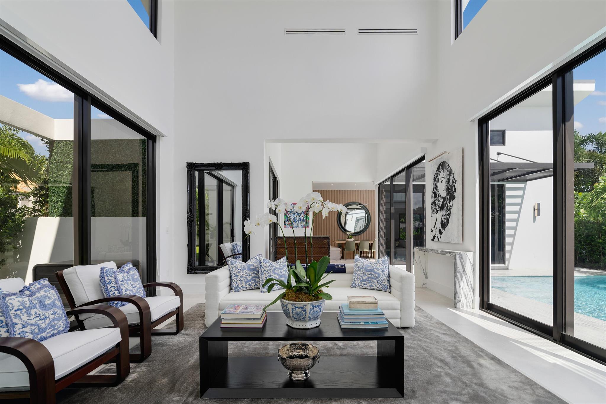 Set on a 9,345+/- square-foot lot, this SoSo residence combines privacy, thoughtful design, and a prime location near the Intracoastal bike path and Palm Beach Island. This contemporary residence offers 4,690+/- total square feet with 4 bedrooms, 3 full bathrooms, and two half bathrooms. Recent updates, including a new pool, all-new landscaping, a gated entry, and a perimeter wall, enhance privacy and curb appeal while maintaining a streamlined modern aesthetic.The main living areas are oriented around the pool, creating a natural connection between indoor and outdoor living. The living room features soaring ceilings and expansive sliding glass doors that open east to the pool and west to a terrace and lawn surrounded by mature trees and lush greenery.