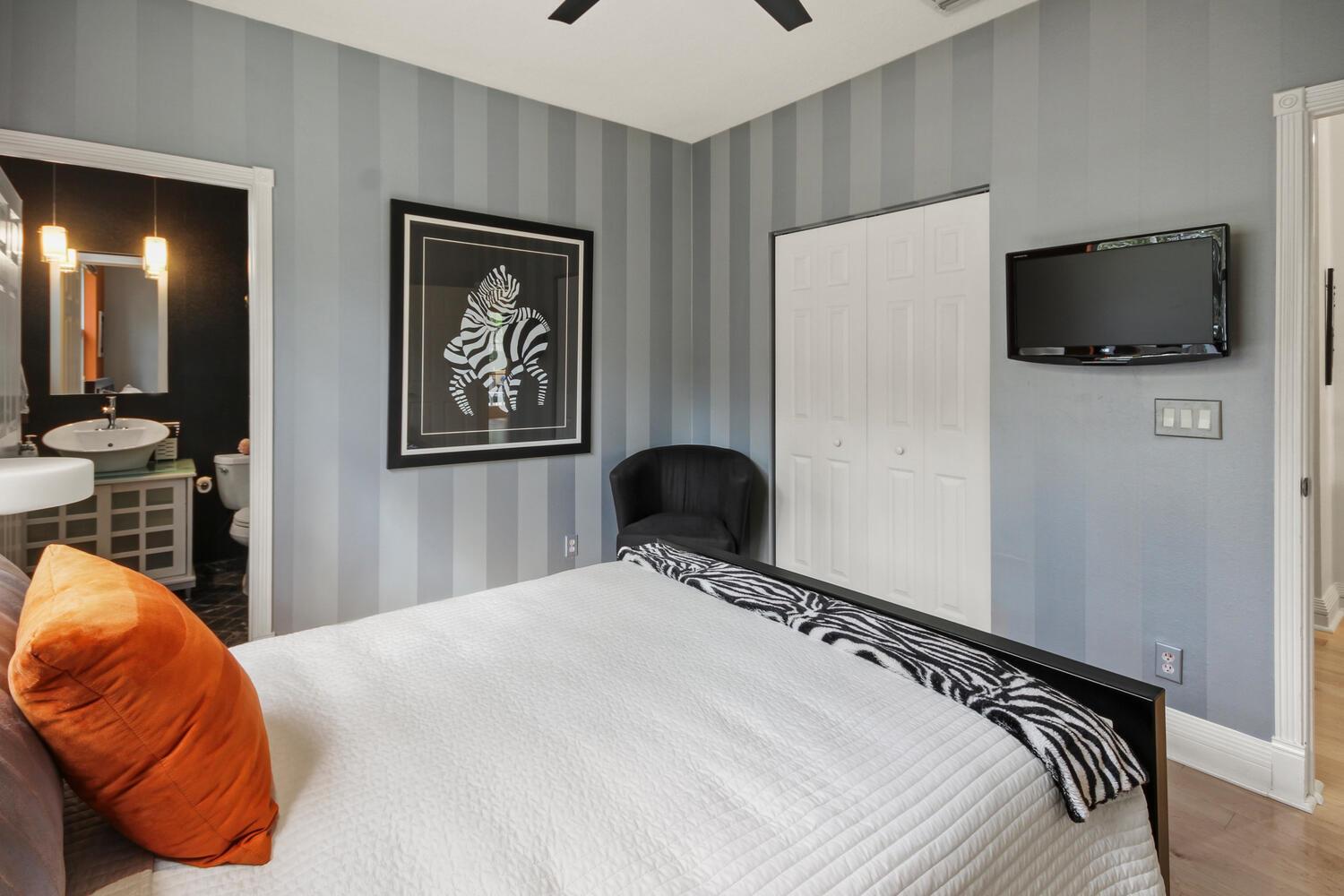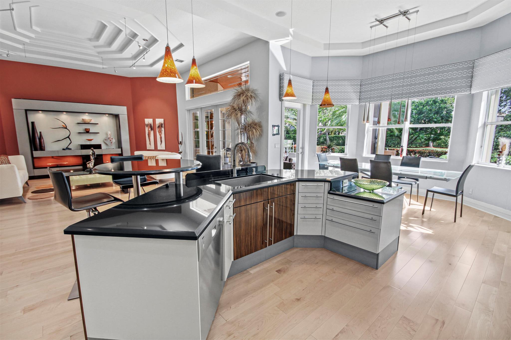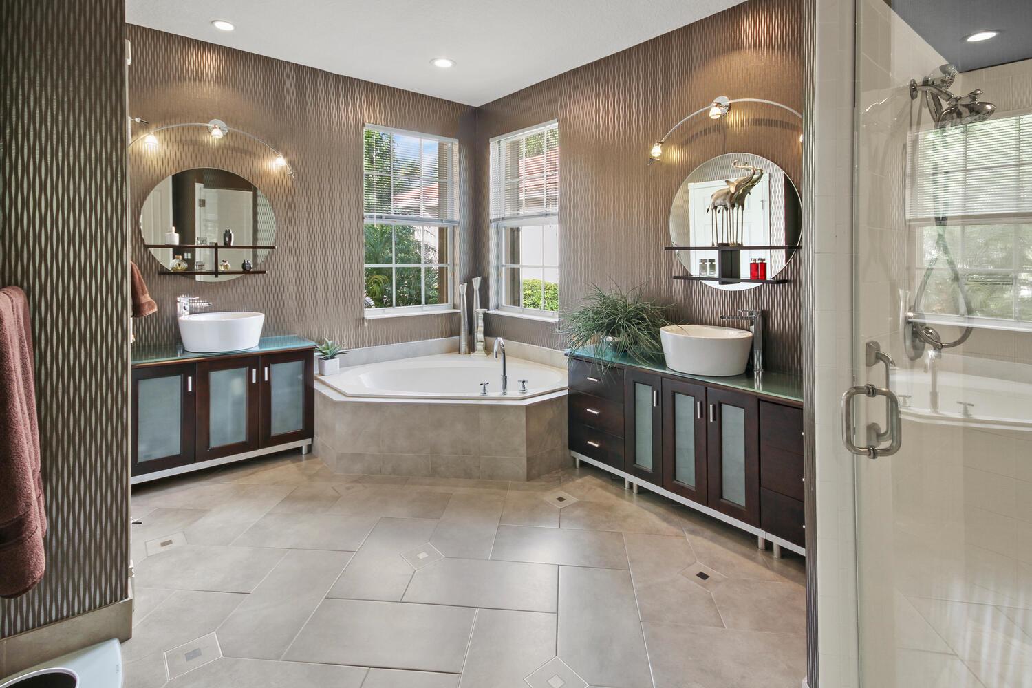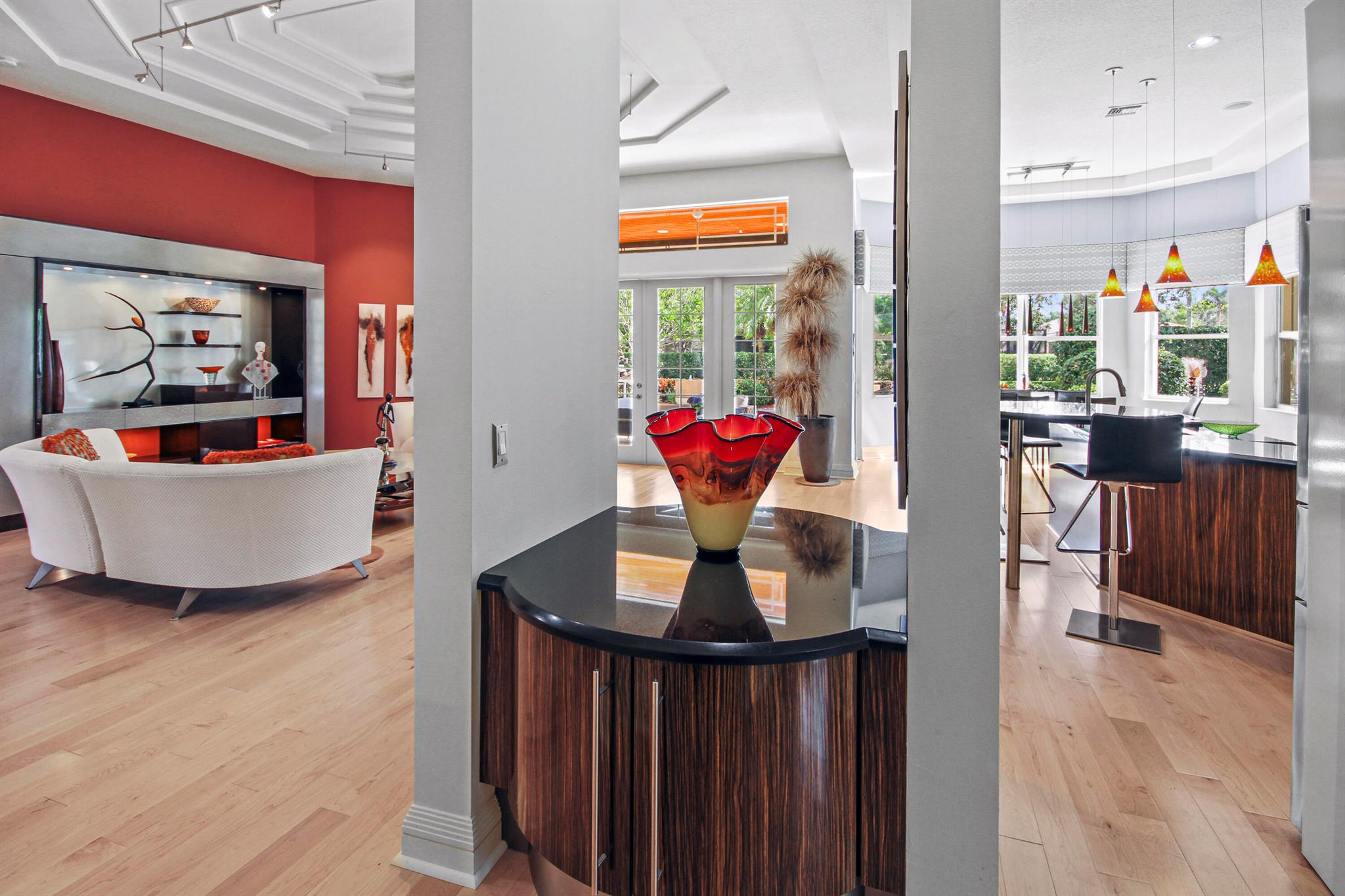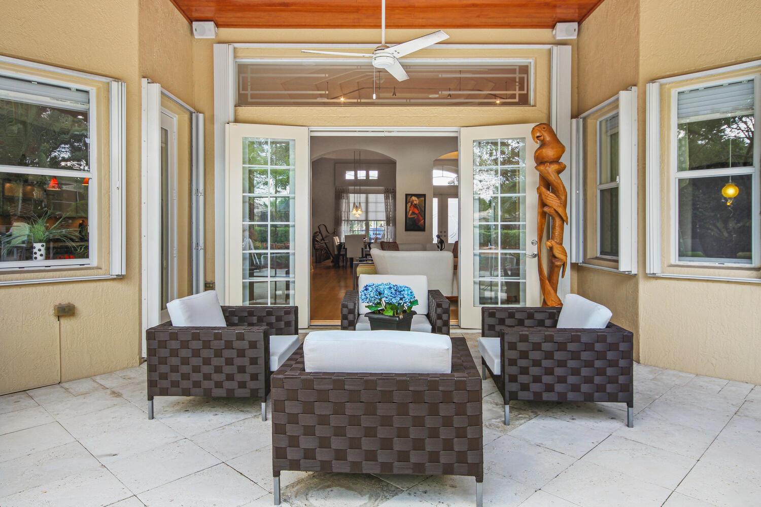 This Riviera model is a 3 bedroom, 2 1/2 bath home, which has been designed and decorated with the most elegant contemporary upgrades. It showcases like any current new community model home at a fraction of the cost. Upon visiting this home, you will see the expansive great room and kitchen open floor plan design, creating elegance and functionality. The new and rich looking hardwood flooring is located throughout most of the home. The primary suite and third bedroom features new plush carpeting. Beautiful wall decor, lighting and window treatments add to the elegance and feel of the home. The exterior patio area has been upgraded with wood ceilings, spacious stone flooring, phantom screening, contemporary fountains and upgraded landscaping with two beautiful canary palm