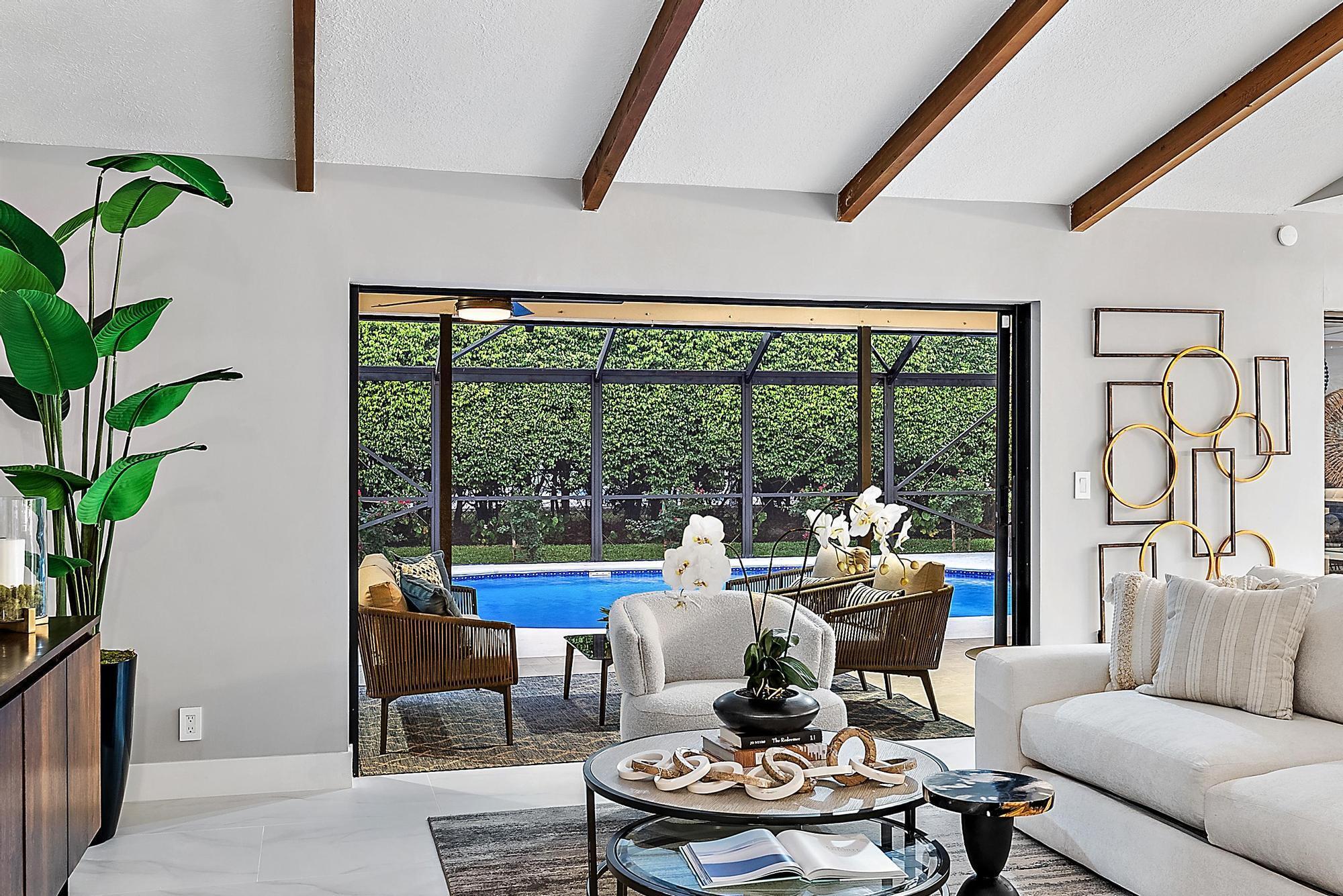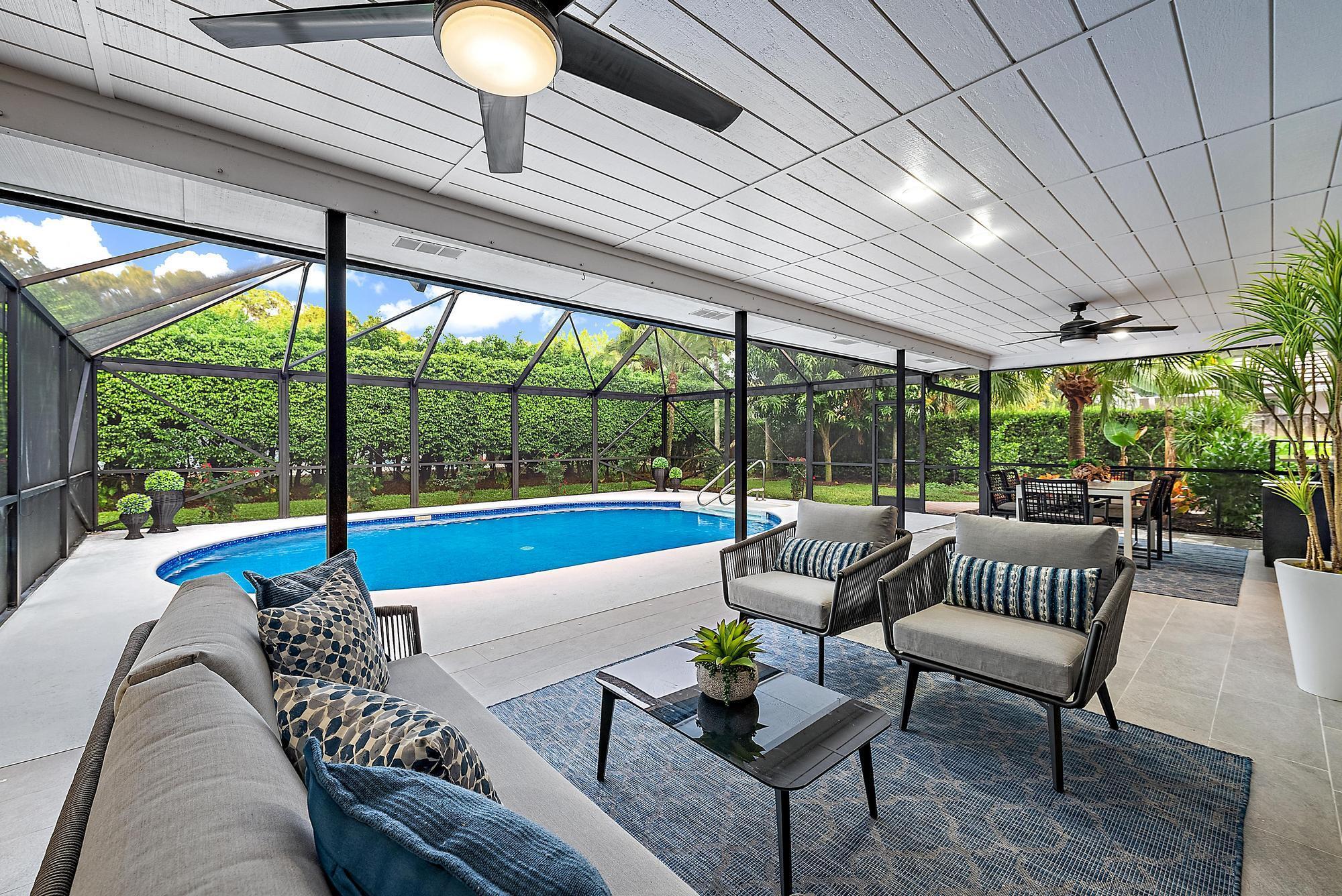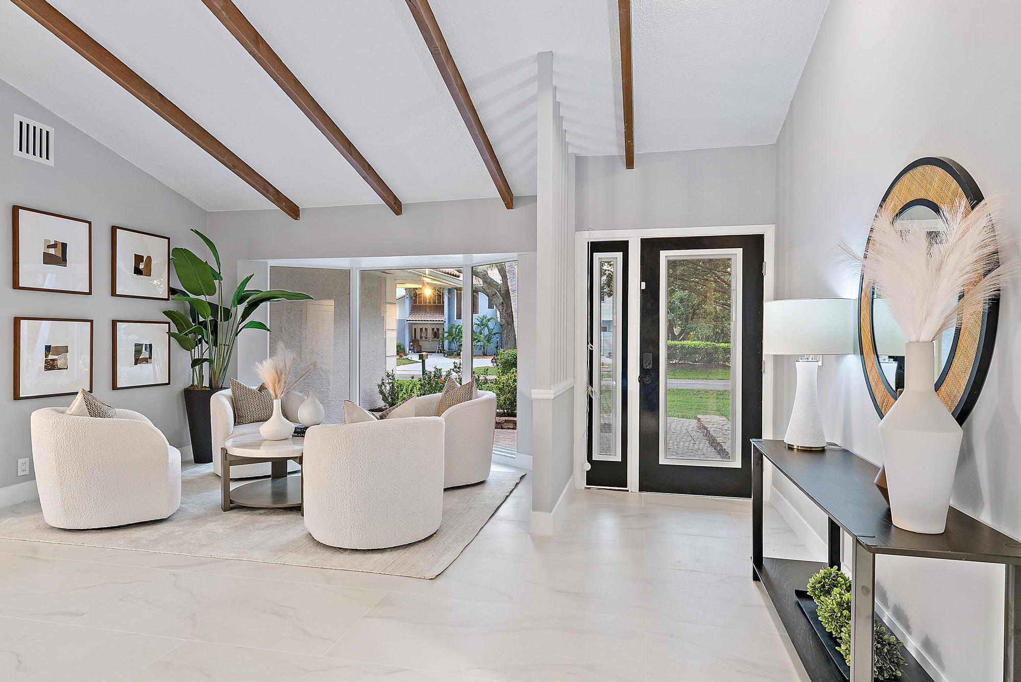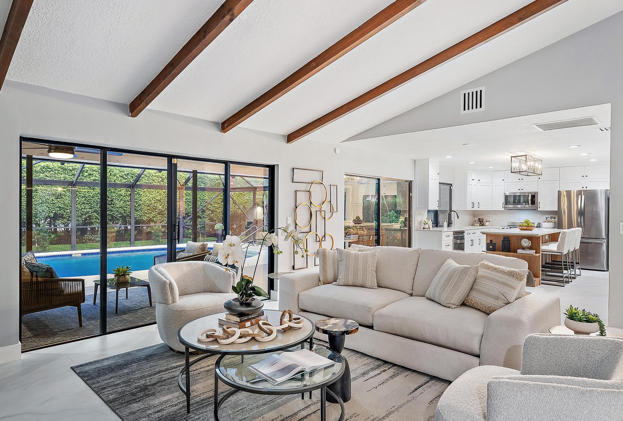 SHOWINGS BEGIN ON DECEMBER 1ST. Own this stunning, fully renovated home in time for the 2025/2026 season. Located in the highly sought-after PGA National, this spacious 3-bedroom, 2-bathroom residence sits on a rarely available .30-acre lot and offers over 2,100 sq. ft. of beautifully upgraded living space. Complete with brand-new 2025 impact windows, this home blends modern luxury with true South Florida indoor/outdoor living.Step inside to vaulted ceilings, exposed beams, and new 24'' x 48'' Andover White porcelain tile flooring with a matte finish throughout the main living areas. Multiple sliders open fully to a large screened lanai, creating a seamless flow between the indoor and outdoor spaces.