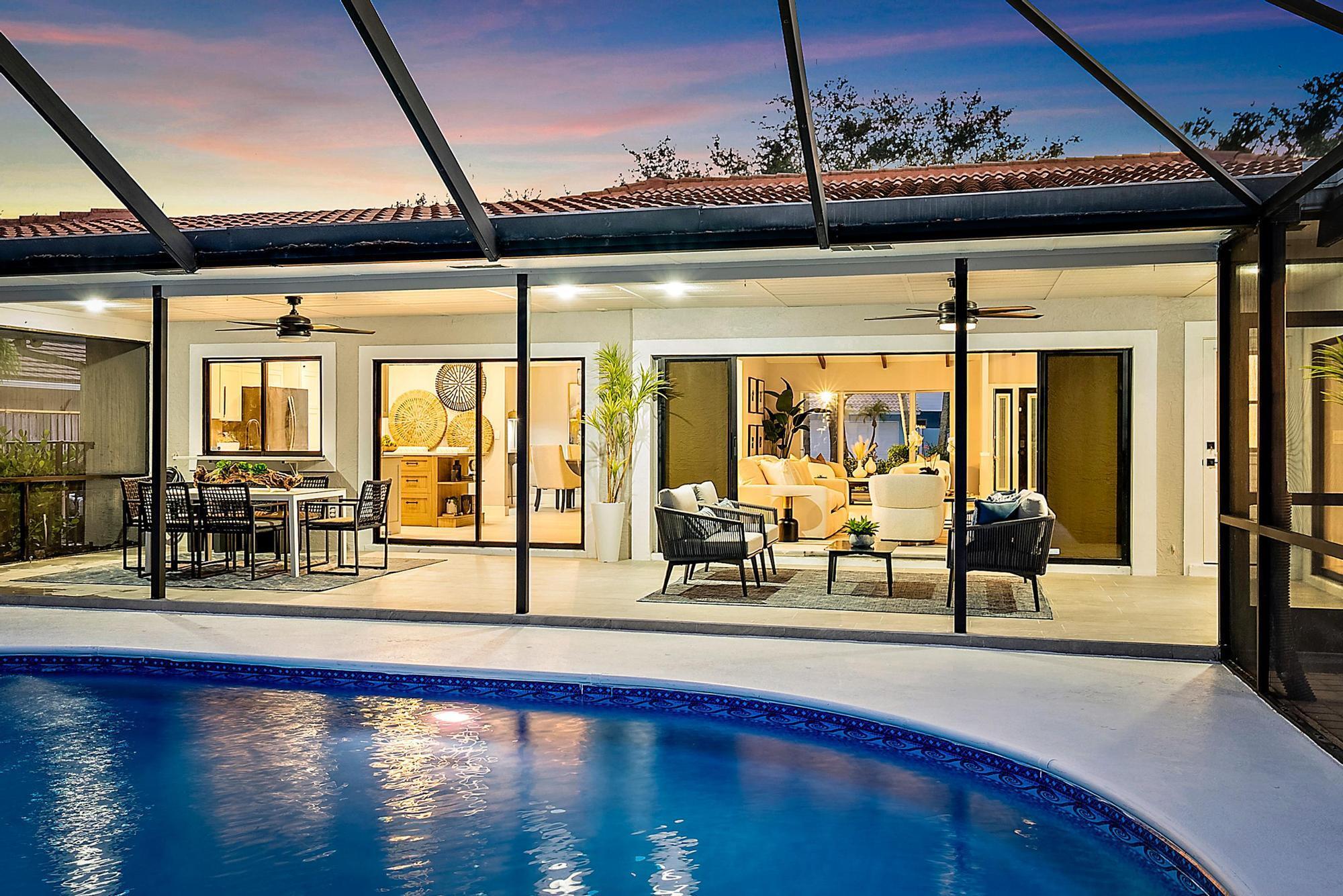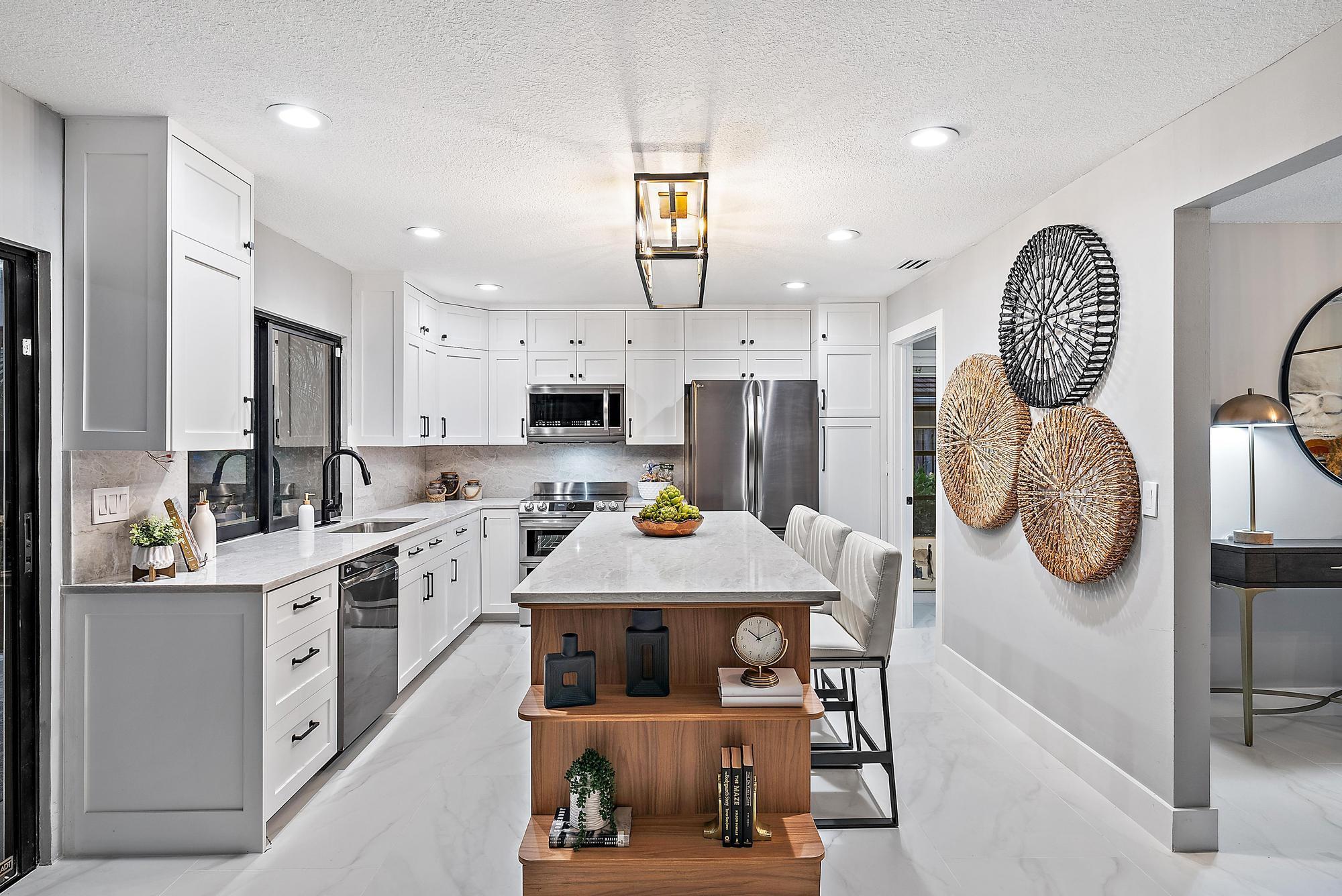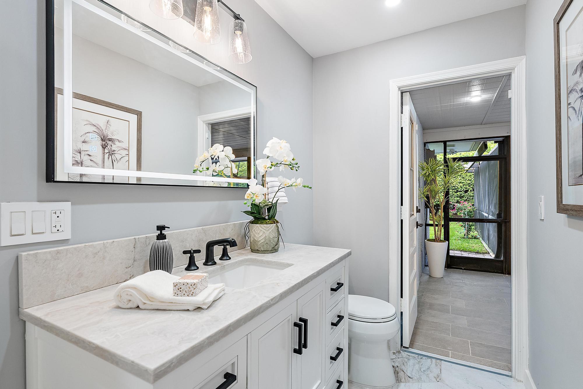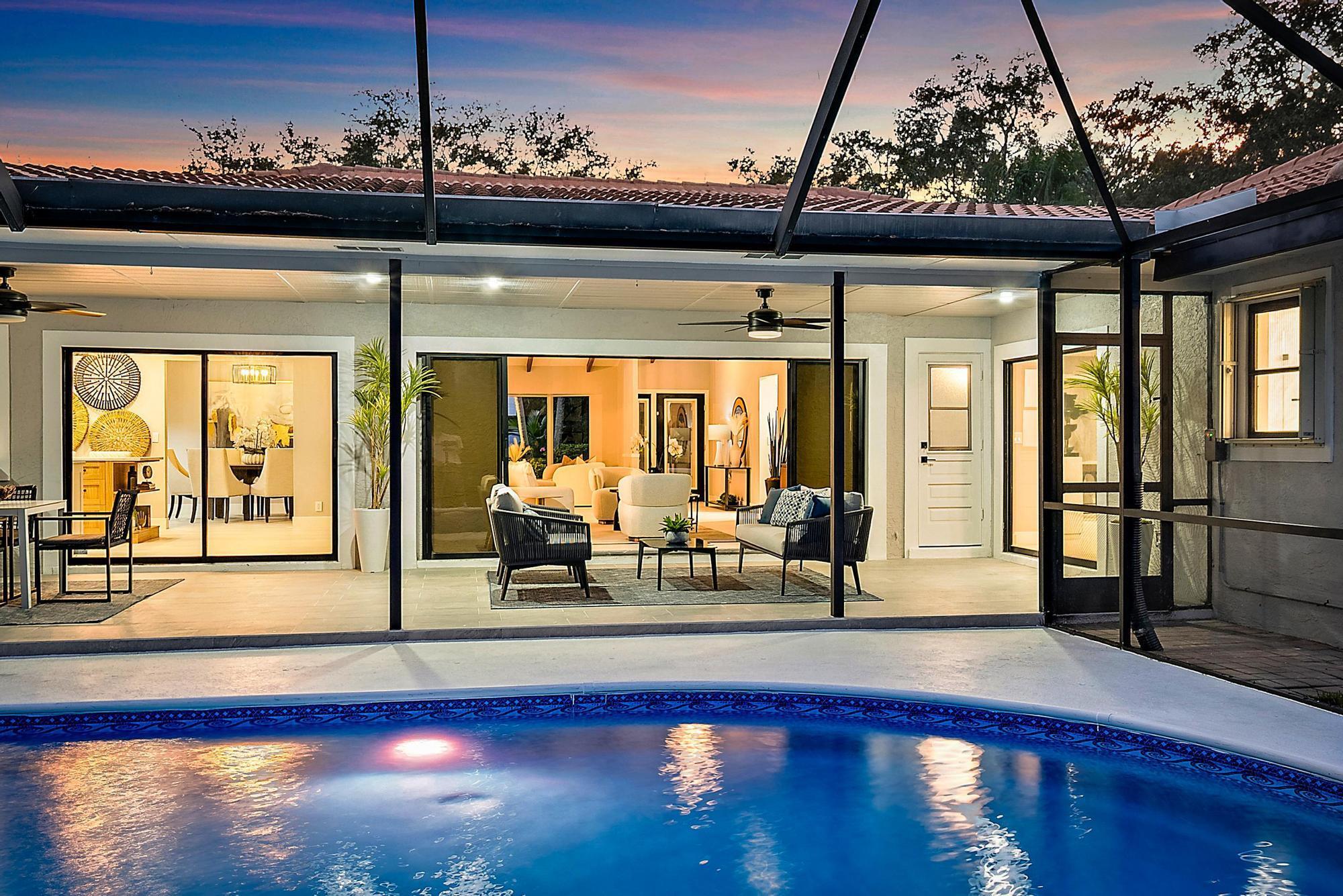 SHOWINGS BEGIN ON DECEMBER 1ST. Own this stunning, fully renovated home in time for the 2025/2026 season. Located in the highly sought-after PGA National, this spacious 3-bedroom, 2-bathroom residence sits on a rarely available .30-acre lot and offers over 2,100 sq. ft. of beautifully upgraded living space. Complete with brand-new 2025 impact windows, this home blends modern luxury with true South Florida indoor/outdoor living.Step inside to vaulted ceilings, exposed beams, and new 24'' x 48'' Andover White porcelain tile flooring with a matte finish throughout the main living areas. Multiple sliders open fully to a large screened lanai, creating a seamless flow between the indoor and outdoor spaces.