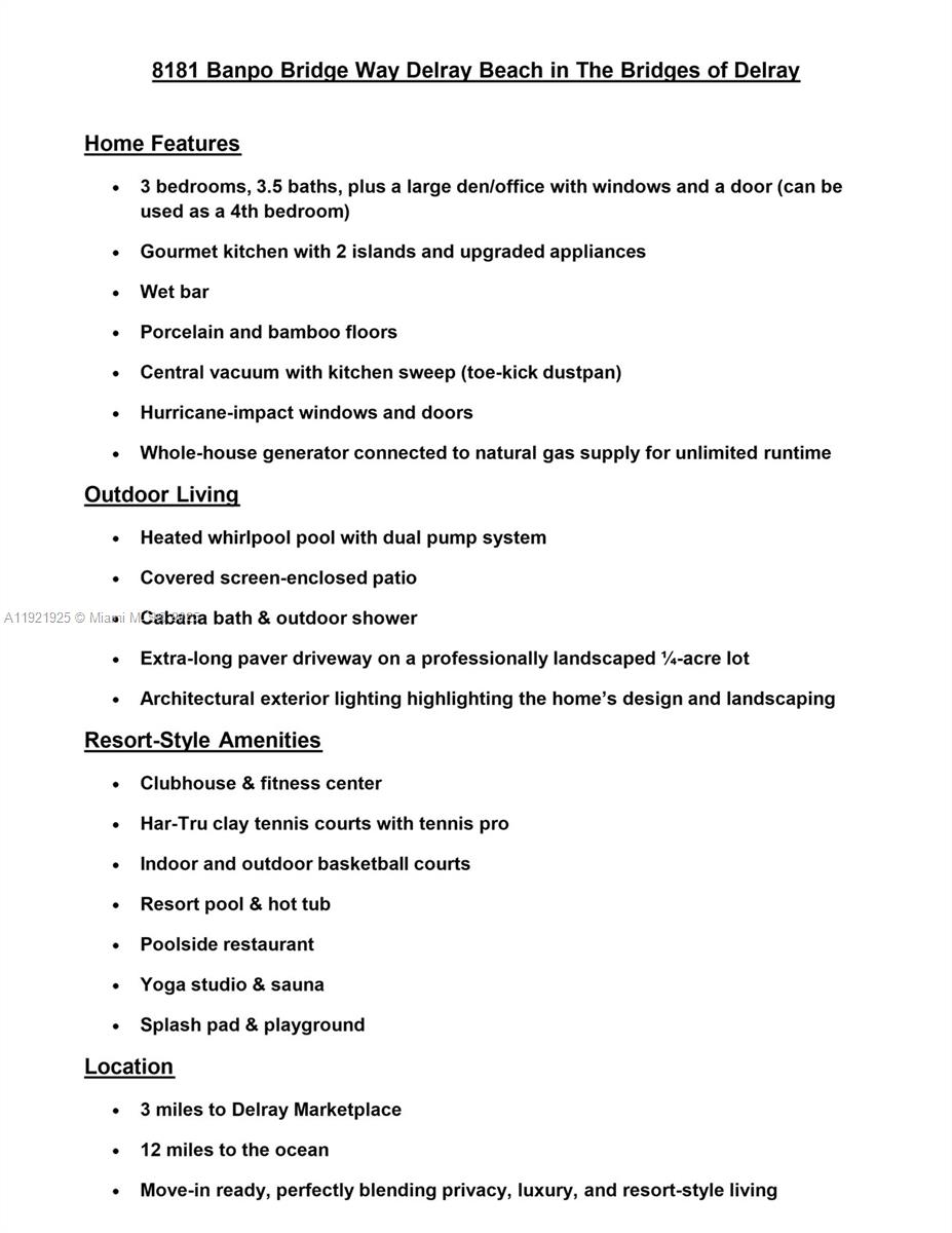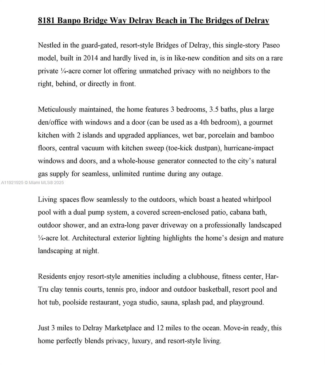 Nestled in the guard-gated, resort-style Bridges of Delray, this single-story Paseo model, built in 2014 and hardly lived in, is in like-new condition and sits on a rare private ¼-acre corner lot offering unmatched privacy with no neighbors to the right, behind, or directly in front. Meticulously maintained, the home features 3 bedrooms, 3.5 baths, plus a large den/office with windows and a door (can be used as a 4th bedroom), a gourmet kitchen with 2 islands and upgraded appliances, wet bar, porcelain and bamboo floors, central vacuum with kitchen sweep (toe-kick dustpan), hurricane-impact windows and doors, and a whole-house generator connected to the city’s natural gas supply for seamless, unlimited runtime during any outage. Living spaces flow seamlessly to the outdoors, which boast a heated whirlpool pool with a dual pump system, a covered screen-enclosed patio, cabana bath, outdoor shower, and an extra-long paver driveway on a professionally landscaped ¼-acre lot. Architectural exterior lighting highlights the home’s design and mature landscaping at night. Residents enjoy resort-style amenities including a clubhouse, fitness center, Har-Tru clay tennis courts with tennis pro, indoor and outdoor basketball, resort pool and hot tub, poolside restaurant, yoga studio, sauna, splash pad, and playground. Just 3 miles to Delray Marketplace and 12 miles to the ocean. Move-in ready, this home perfectly blends privacy, luxury, and resort-style living.