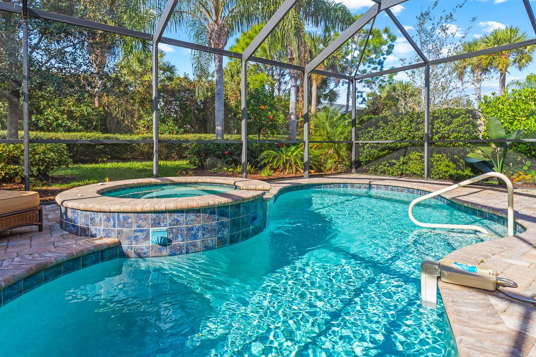 Exceptional Move-In-Ready Home with Saltwater Heated Pool & Spa Oasis! 3-bed, 3-bath, den/office, sunroom and spacious upstairs loft perfect for flexible living or entertainment. Immaculately maintained and beautifully upgraded, this residence offers both style and comfort. At the heart of the home, you'll find quartz countertops, SS app, glide out drawers and gathering island accented by elegant pendant lights. From the eye-catching glass front door, crown molding, 8' doors, plantation shutters and shiplap ceiling, this home impresses inside and out. Step outside into your private screened-in slice of paradise pool and spa, perfect for relaxing evenings or weekend get-togethers plus retractable awning for more shade. Bonus water filteration system. Designed for effortless Florida living!