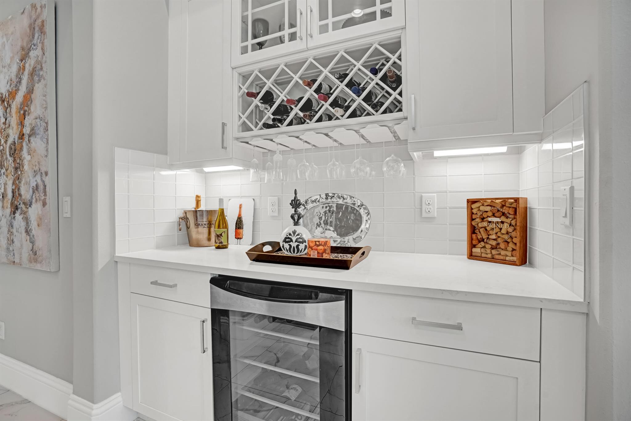 Stunning Tradewinds model. Open floor plan with soaring ceilings, spacious layout features split bedrooms, a large walk-in pantry, and a cabana bath with direct access to the pool area. Primary suite includes patio door leading to the beautifully designed outdoor space. Enjoy the saltwater pool with waterfall feature, pool heater, screened enclosure, and travertine pavers extending across the patio and pool deck. Highlights include a bar with a beverage refrigerator, porcelain tile flooring, quartz countertops, and a 36-inch gas cooktop, whole-home generator, fenced yard, and so much more!