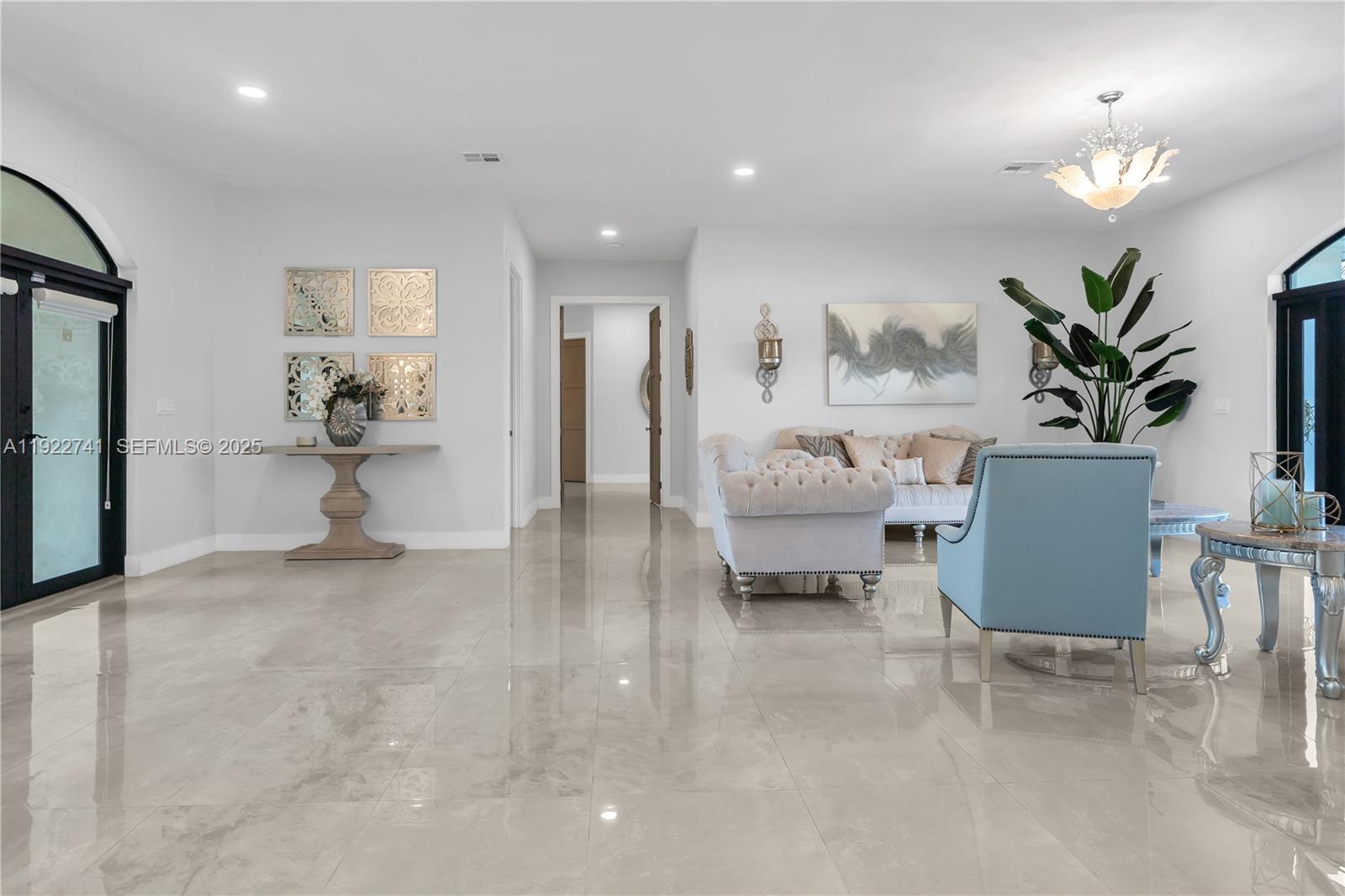 Discover luxury, privacy, and lifestyle at this exceptional residence on a lush corner acre in Redland–Homestead, designed for comfort and outdoor living. This custom single-level home offers 4 spacious bedrooms and 3.5 bathrooms, including a large primary suite with dual walk-in closets and a spa-inspired bath with his-and-hers vanities and a walk-through shower. A thoughtful split-bedroom layout, soaring ceilings, and 24x48 porcelain tile flooring elevate the interior. The open-concept family room features a modern electric fireplace and flows directly to the covered terrace. The chef’s kitchen includes a large island, extended counter seating, and seamless connection to the main living areas. Outdoors, enjoy a full summer kitchen, built-in bar, mounted TV, and pergola lounge. The heated resort-style pool offers a swim-up bar and cascading water feature. The acre is fully landscaped and irrigated by three wells, showcasing 40+ mature fruit trees including mango, avocado, mamey, and citrus. Additional features include a finished garage with car lift, full irrigation system, gated and fenced perimeter, and high-end finishes throughout. Located in Homestead’s desirable Redland agricultural zone, the property offers space and privacy while remaining close to shopping, dining, Fruit & Spice Park, Schnebly’s Winery, and major roadways. Zoned EU-1, allowing ownership of horses, chickens, beekeeping, and more.