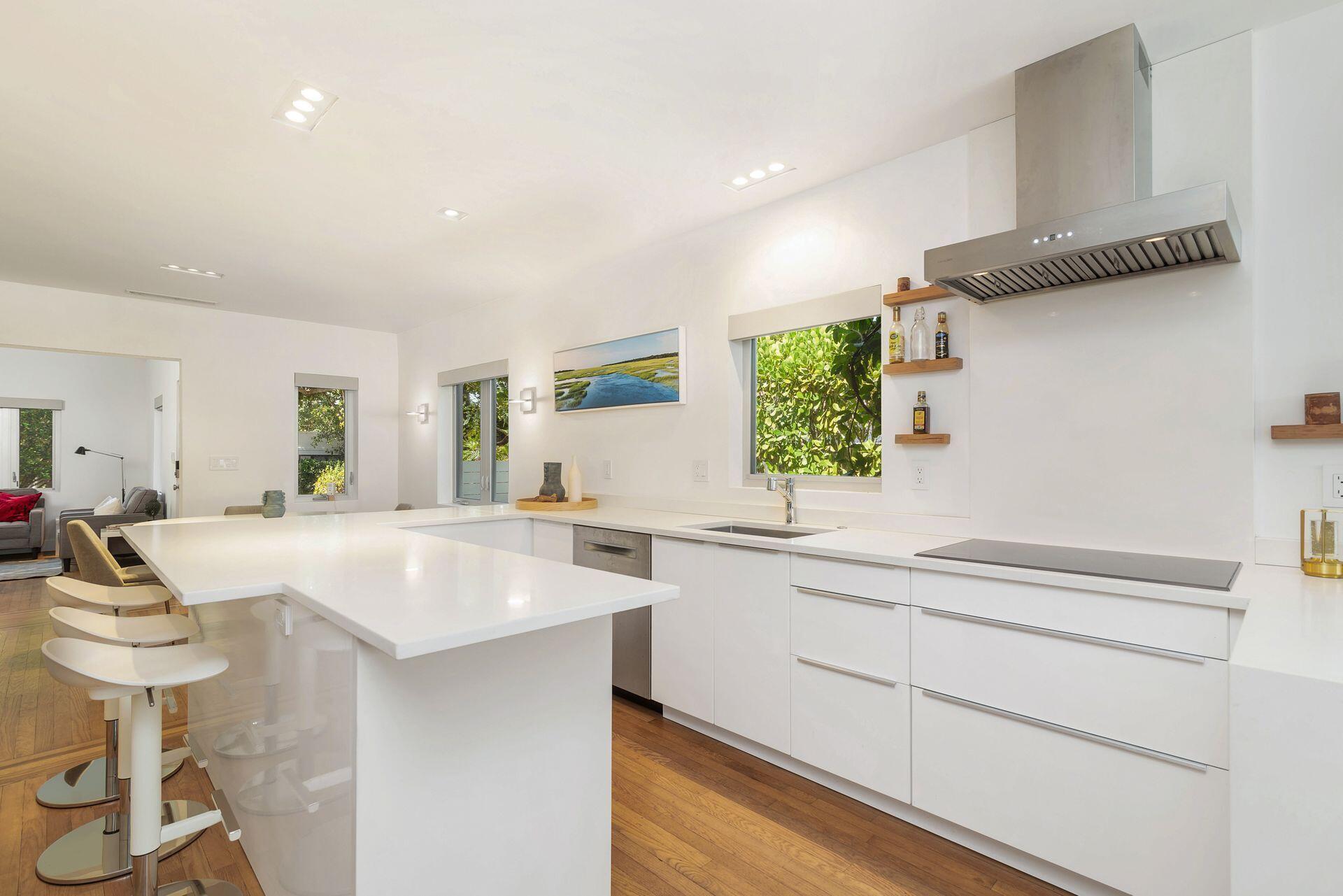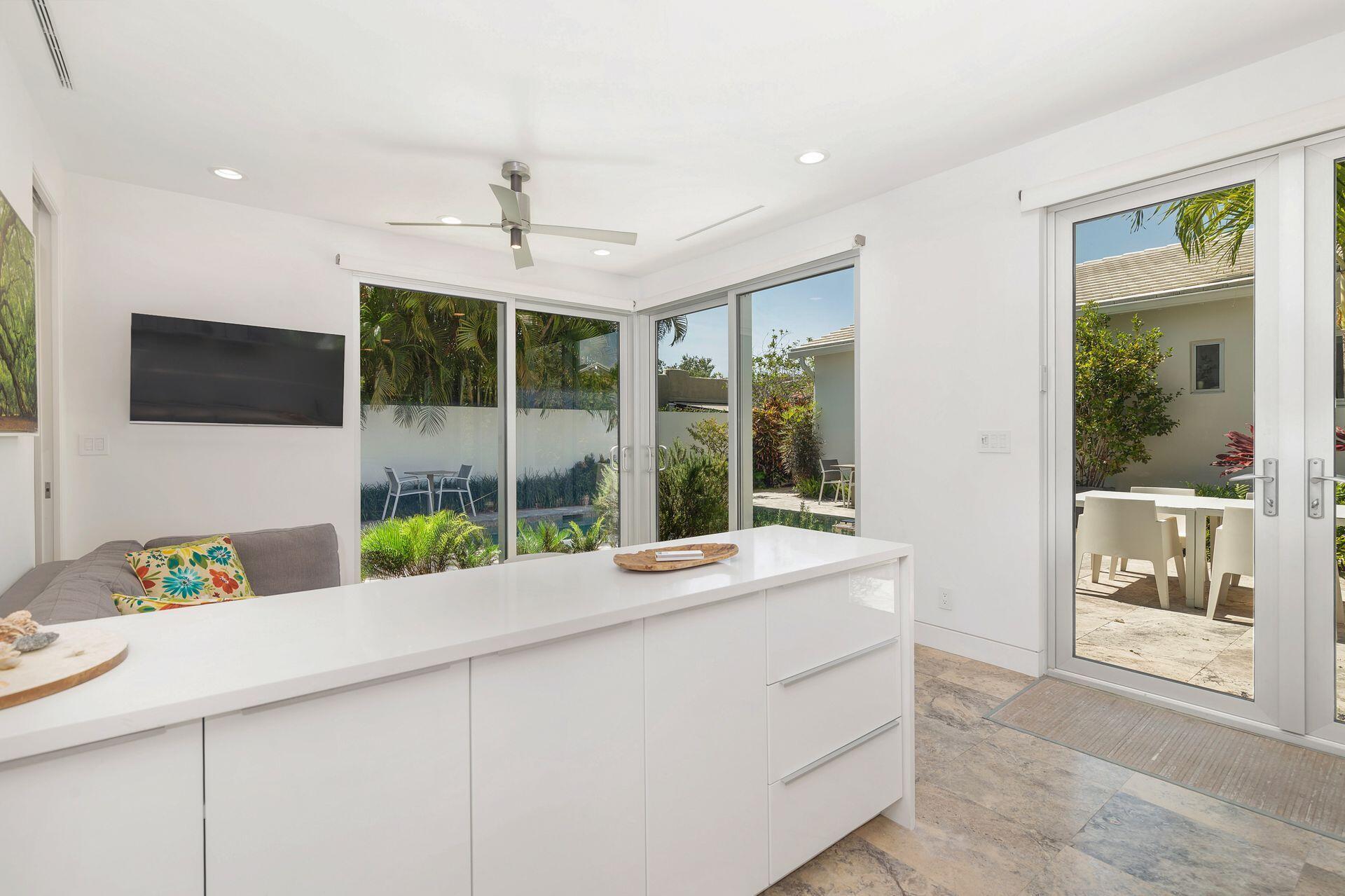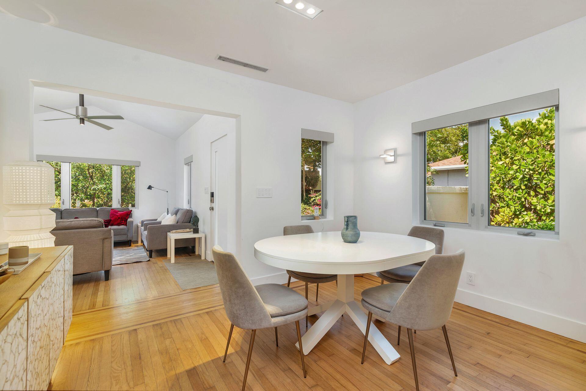 1930's Art Deco cottage style home with stunning European influenced renovations in Flamingo Park. This 2BR/2.5BTH + 1/1 cottage compound has almost 2,100 sq ft under air and is unique inside & out! Original details retained including curved wall, round window, restored mitered wood floors, fireplace mantel & grates, perfectly protected by aluminum impact windows. Bright & airy interiors, custom lighting, vaulted living room ceiling, sunroom, spacious dining room open to gorgeous kitchen with tremendous storage & dining nook. Bedrooms feature ensuite baths, floating vanities & wall mounted toilets. Stunning guest cottage features open floor plan, full kitchen with island, floor to ceiling sliding doors, spa like bath & laundry. Private xeriscape yard. intimate patios, heated pool & spa!