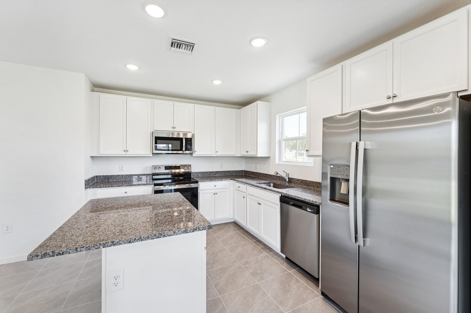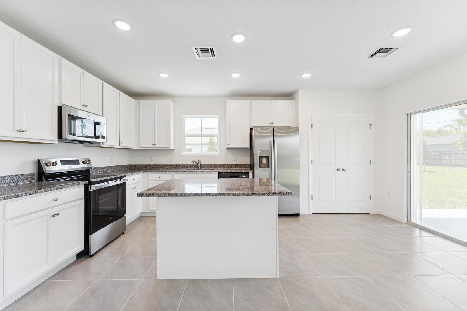 Enjoy no HOA fees at this beautifully appointed Azalea II, located at 3372 SW Port St. Lucie Blvd. Ideally situated near shopping and Treasure Coast High School, this home offers everyday convenience in a centrally located and highly accessible area. Whole-house impact glass provides peace of mind, and the turn-around U-shaped driveway enhances both curb appeal and ease of access.Inside, the home features an open layout with a seamless flow between the great room, dining area, and kitchen. The kitchen showcases a Caledonia granite central island, white cabinets, and all appliances included. A handy pantry in the dining area keeps hosting essentials close and organized.The private primary suite offers a calm, well-designed retreat, complemented by a primary bath with dual sinks and