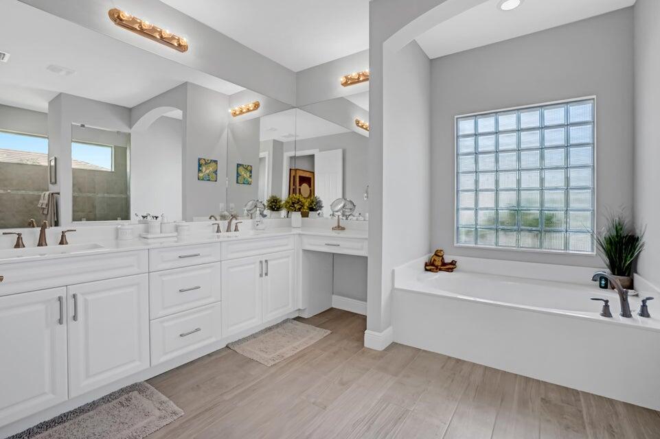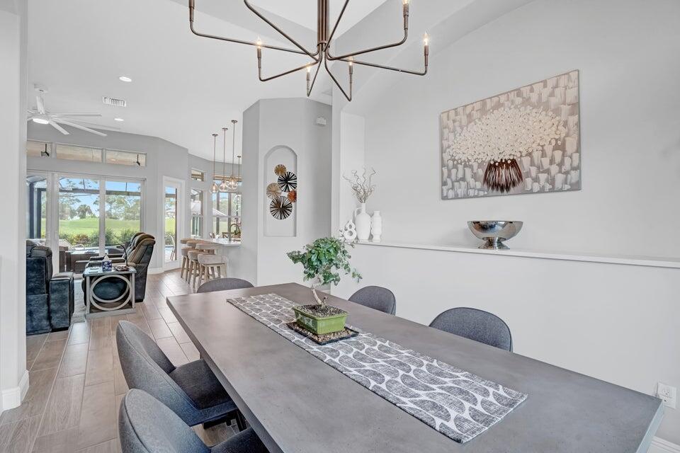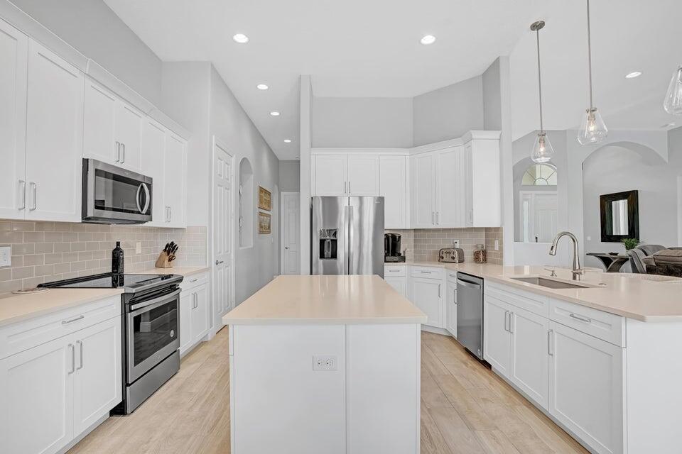 Stunning 3 bedroom, 3 bathroom GHO built pool home in the desirable Meadowood community. Designer style screened-in saltwater and heated pool with bench seating and jets. The home features an open main living area and split bedroom floor plan. Kitchen features quartz counter tops, subway tile backsplash, crown molding on the cabinets, a center island and breakfast nook overlooking the pool. Separate dining room with volume ceilings and archway details. The guest bedrooms feature crown molding and plantation shutters. Primary bedroom retreat is located on its own side of the home. The large bedroom features a tray ceiling, plantation shutters and a door to the back patio and pool area.