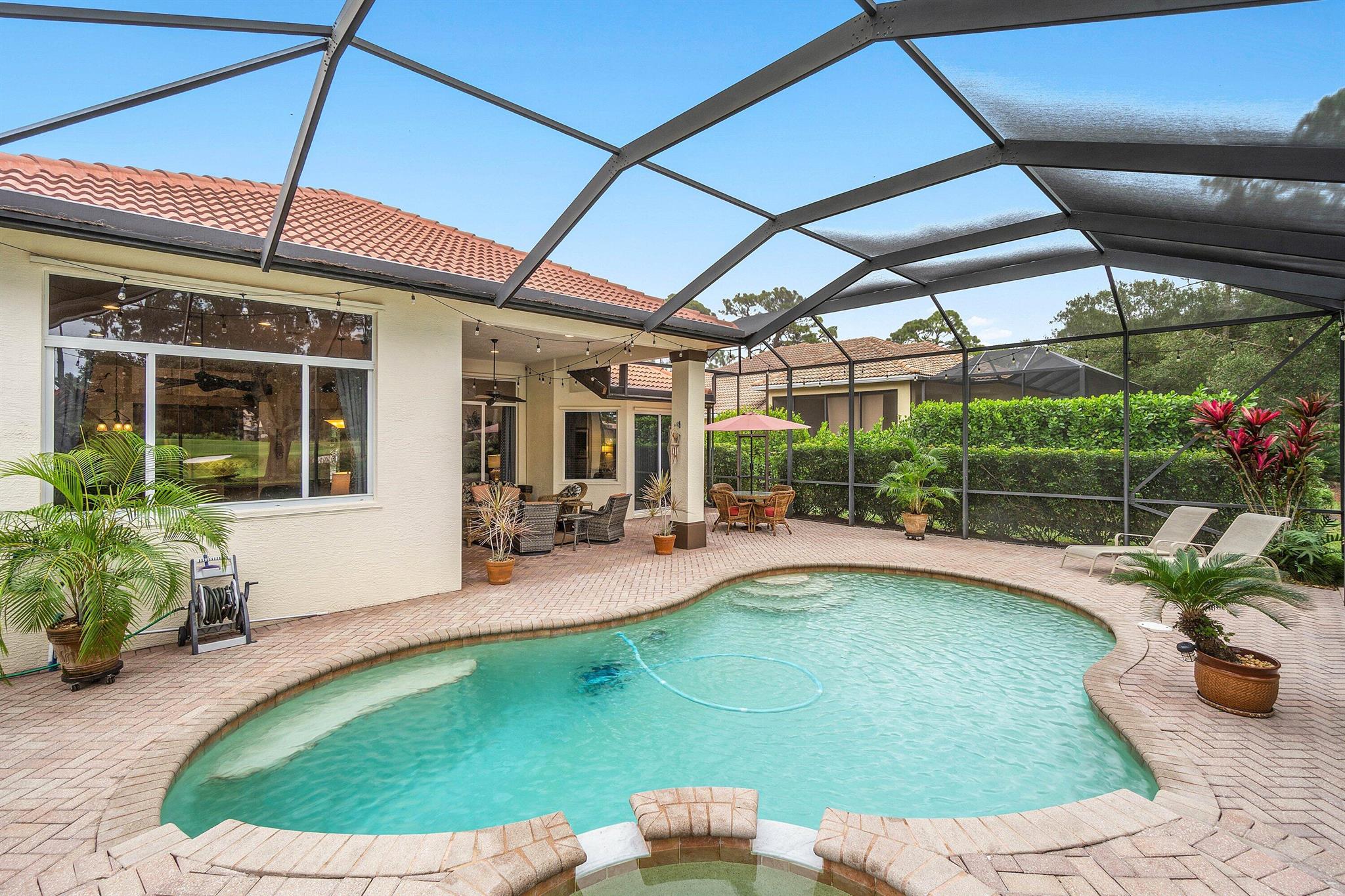 Located in the vibrant golf community of PGA Village, this newly listed three-bedroom, two-bathroom home offers a blend of elegant design and functional features. From the moment you enter through the dual-glazed 8-foot entry doors, you'll notice soaring 12-foot ceilings, crown molding, and an abundance of natural light that creates a welcoming atmosphere throughout.The open-concept kitchen is thoughtfully designed for both entertaining and everyday living, featuring granite countertops, 42-inch upper cabinets, stainless steel appliances, hi-hat lighting, an eat-in bar top, and a cozy dinette area. A formal dining room with a built-in mini bar makes hosting guests a seamless experience.The primary bedroom offers a pair of spacious walk-in closets and a luxurious ensuite bath