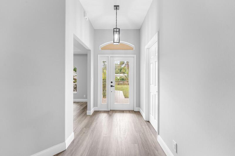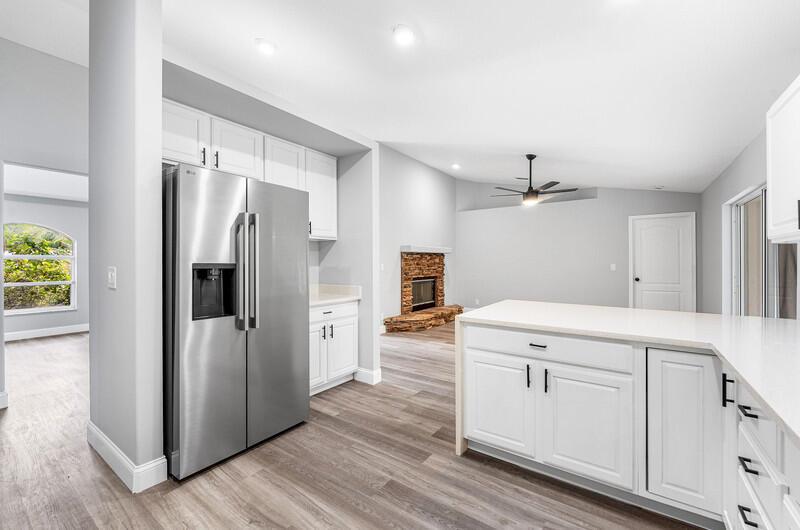 This amazing completely remodeled single family home is a must see! This beauty has a brand new roof with a new kitchen that has upgraded quartz countertops and new stainless-steel appliances. There is also new vinal flooring throughout! Also there is new plumbing and electrical fixtures! Solid CBS home in The Acreage with 3 BR, 2 BA, with a flexible office/den that can serve as a 4th BR. 1,871 sq ft u/a with a 2 CG that sits on 1.33 fully fenced acres ON A PAVED ROAD at the end of the street next to the canal which gives you lots of privacy. The welcoming living room w/ a wood-burning fireplace, 2023 A/C, screened-in patio overlooking the expansive backyard.