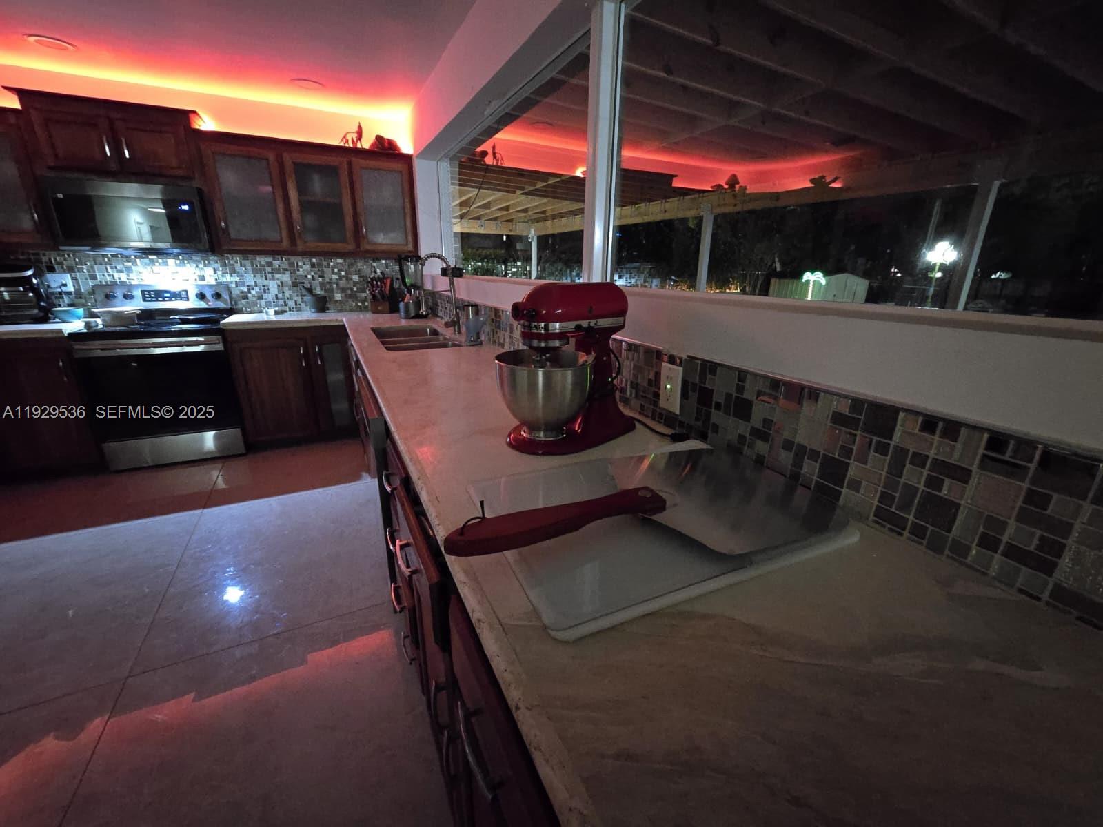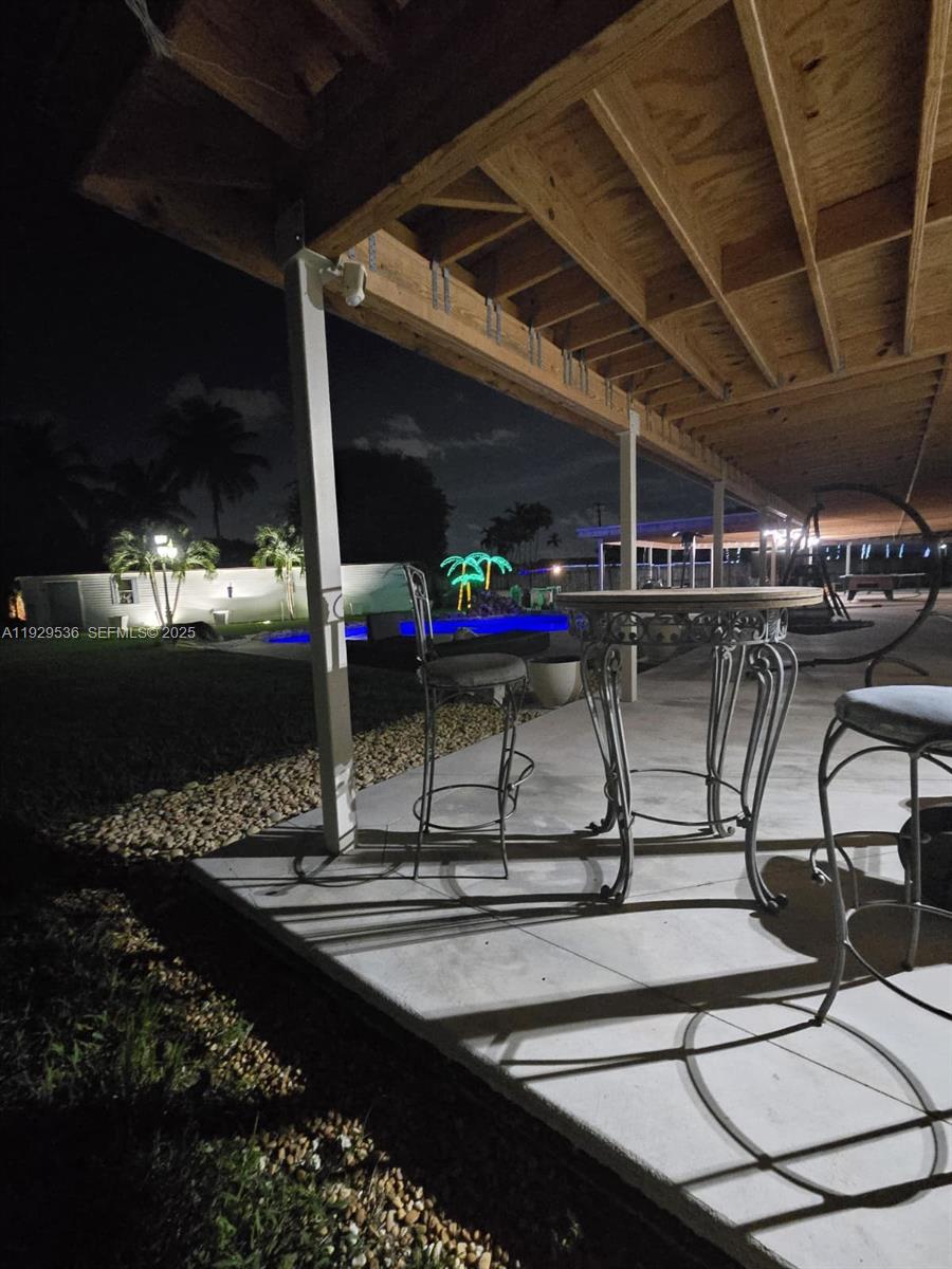 Fully permitted multigenerational property offering approximately 6,000 sq ft of improved living and covered space. The main residence includes 4 bedrooms, 3 bathrooms, one office, and a 400 sq ft private-entry suite with its own bathroom and laundry area. Flooring consists of 4×4 porcelain tile throughout, with 2×2 genuine marble tile in the primary suite, an additional bedroom, and all bathrooms. Bathrooms were renovated in 2024. The kitchen was renovated in 2024 and features a 35-foot marble preparation counter, skylight, wood cabinetry with glass accents, and a 192×54 hurricane-impact panoramic window overlooking the pool and patio. A detached approximately 700 sq ft guest house includes 2 bedrooms, 1 bathroom, full kitchen, small living room, laundry area, central AC, private street entrance, independent electrical panel, private septic tank, and a tankless water heater. Legal conversion is in progress. Outdoor features include approximately 4,000 sq ft of covered patio with outdoor kitchen hookups, a Diamond Brite resurfaced pool (2025) with LED lighting, jacuzzi, solar-powered outdoor shower, two wells, full sprinkler system, a 12×10 legal storage shed, mature mango, avocado, and banana trees, and parking for 10 vehicles. All structures have new shingle roofs (2025) and hurricane-impact windows and doors (2025). Property is offered fully furnished. The House offers 2,972 SQFT of Living area and about .55 of an Acre Lot.