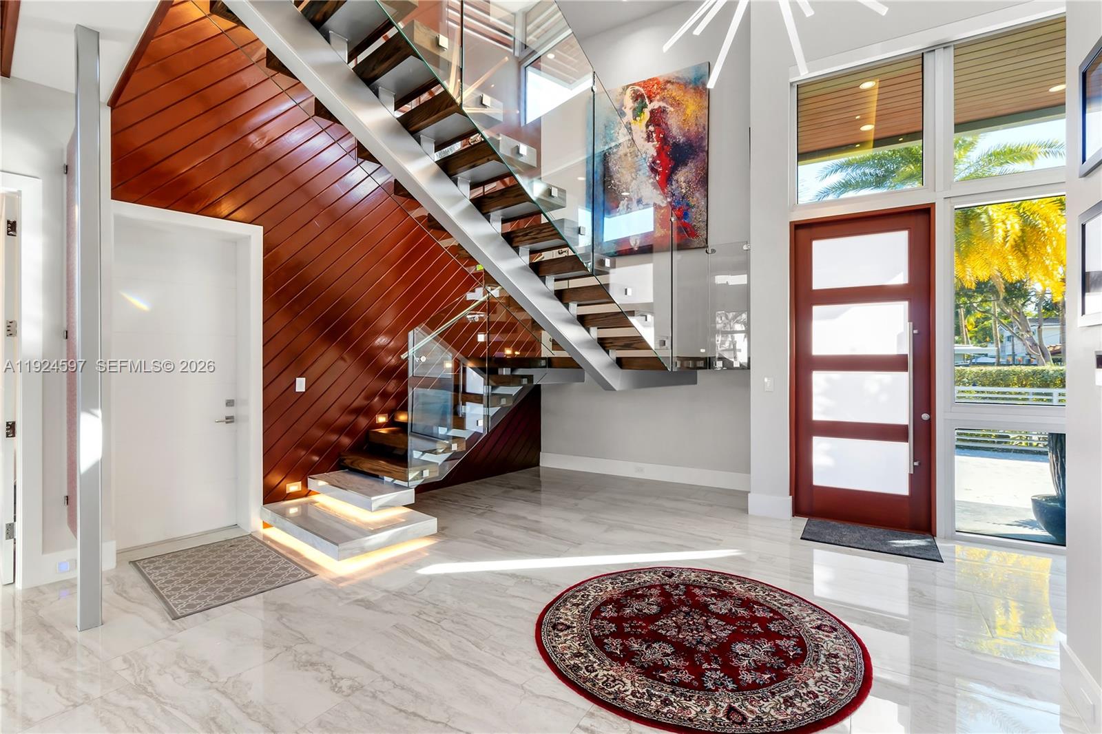A striking modern waterfront estate completed in 2019 by Barron Construction and architect Kevin Akey. Expertly elevated on 54 pilings, this residence seamlessly blends cutting-edge technology with refined design, featuring Control4 smart-home automation, Sonos audio, a whole-house generator, and exceptional custom finishes throughout. Dramatic 23-foot ceilings, a sculptural floating staircase, and a sleek glass walkway create a breathtaking architectural statement. The chef’s kitchen is outfitted with Sub-Zero and JennAir appliances, while the first-floor primary suite delivers a true spa-like retreat. Outdoor living is equally impressive, offering an 80-foot Trex dock with direct ocean access, a resort-style heated pool and spa, manicured turf grounds, and a gated driveway accommodating up to 11 vehicles.