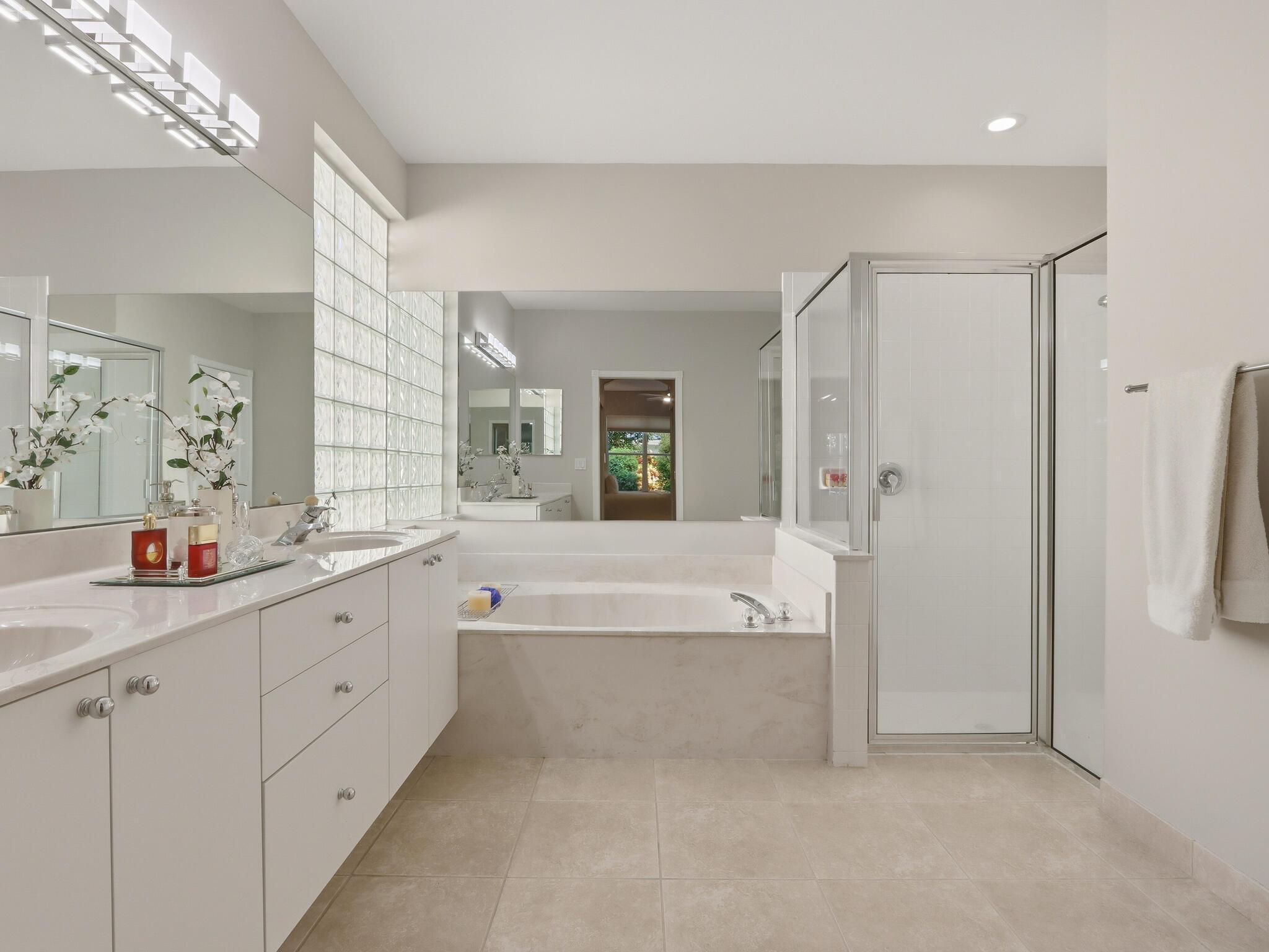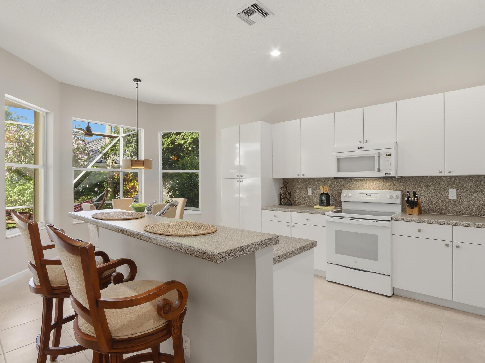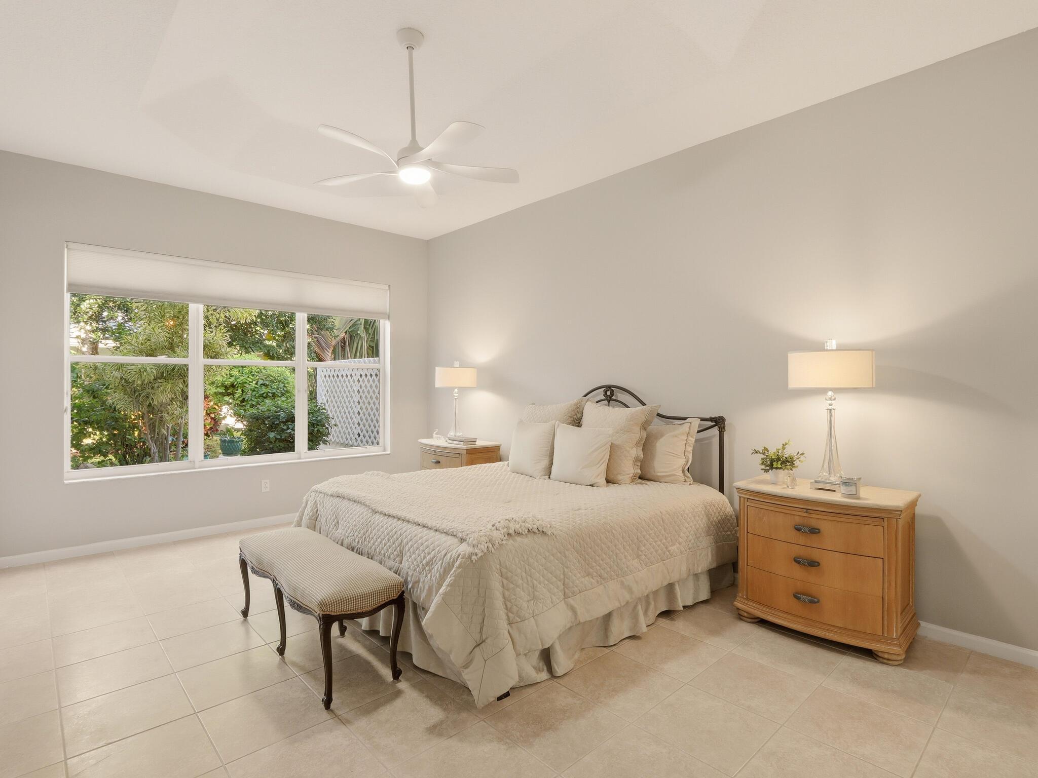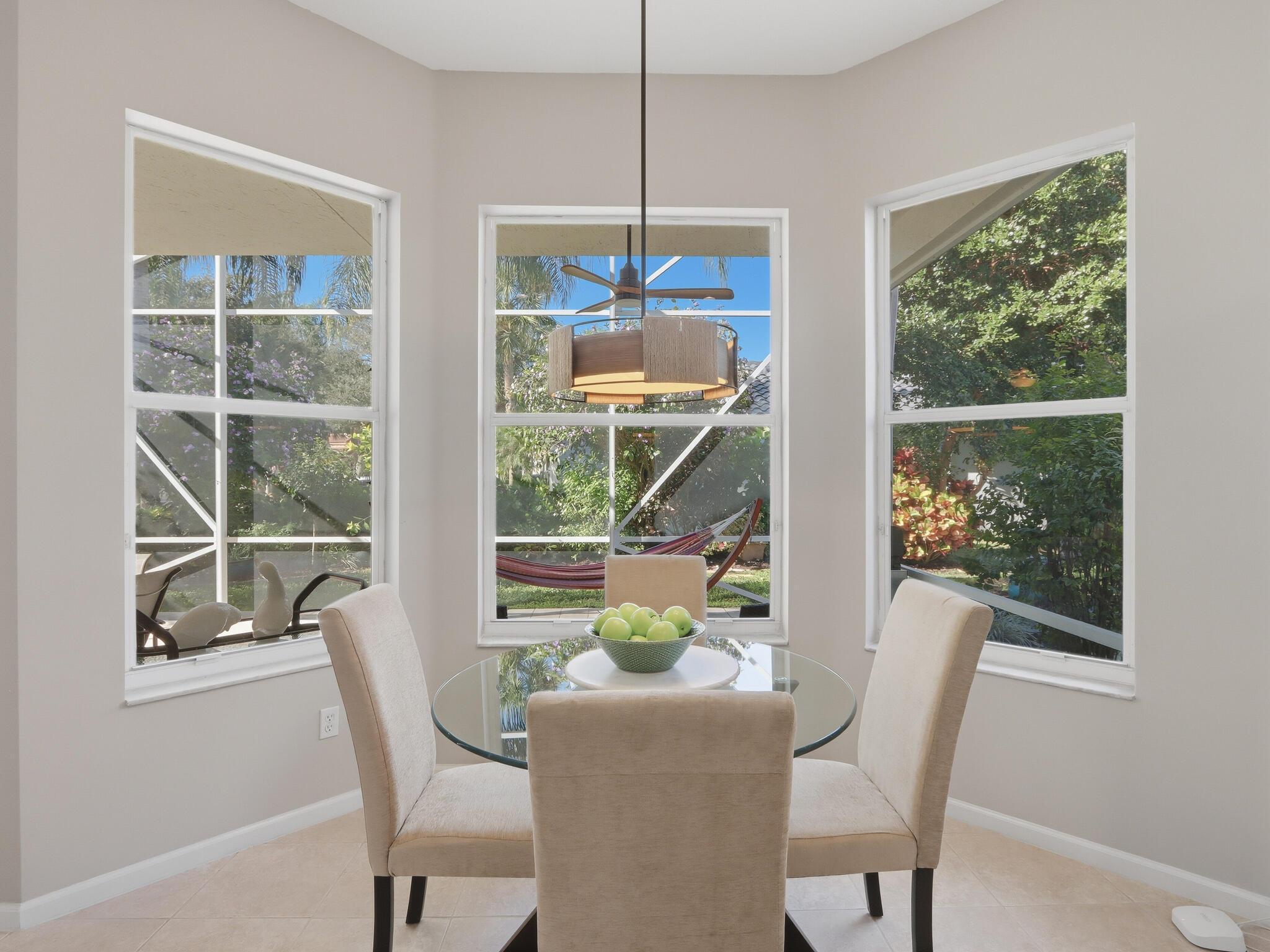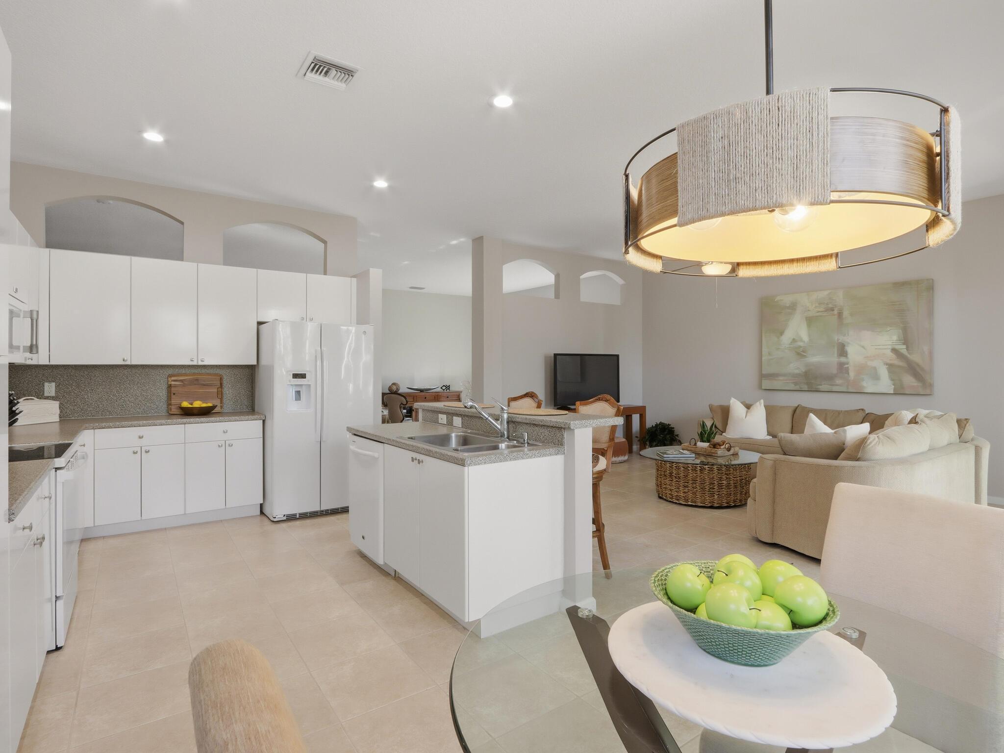 Highly sought after 3 Bedroom/2 Bath Mediterranean Model! NO Carpets! Tile flooring throughout! No side neighbors.. situated on a corner lot with plush custom landscaping. Recently painted a neutral color throughout w/ NEW LED recessed lighting, NEW ceiling fans and lights. 2023 A/C! 2017 Hot Water Heater. Accordion Shutters! Relax or entertain guests on your over-sized lanai featuring 2 fans, colorful landscaping, green space and outside patio. Large sized primary bedroom w/ two closets, garden view and a bathroom w/ dual sinks, separate shower and tub. 3rd bedroom is currently being used as a den/office. Walking distance to the recently renovated clubhouse w/ BISTRO! 4 Additional pickleball courts and 2 Bocce courts coming in 2026.