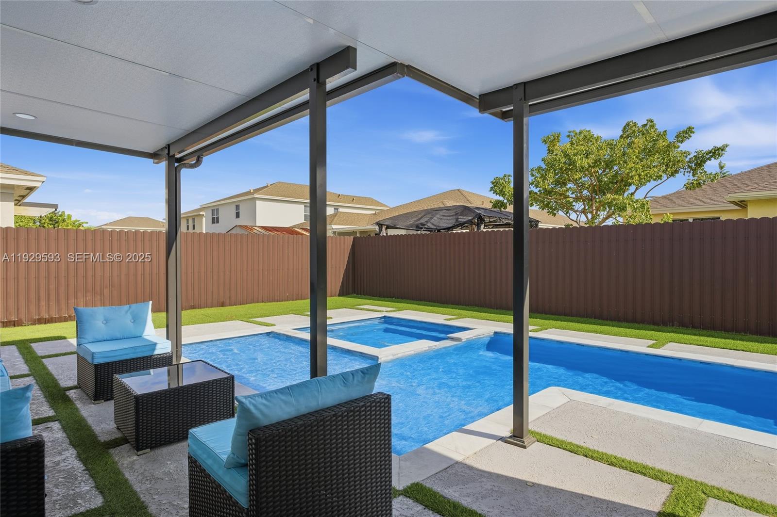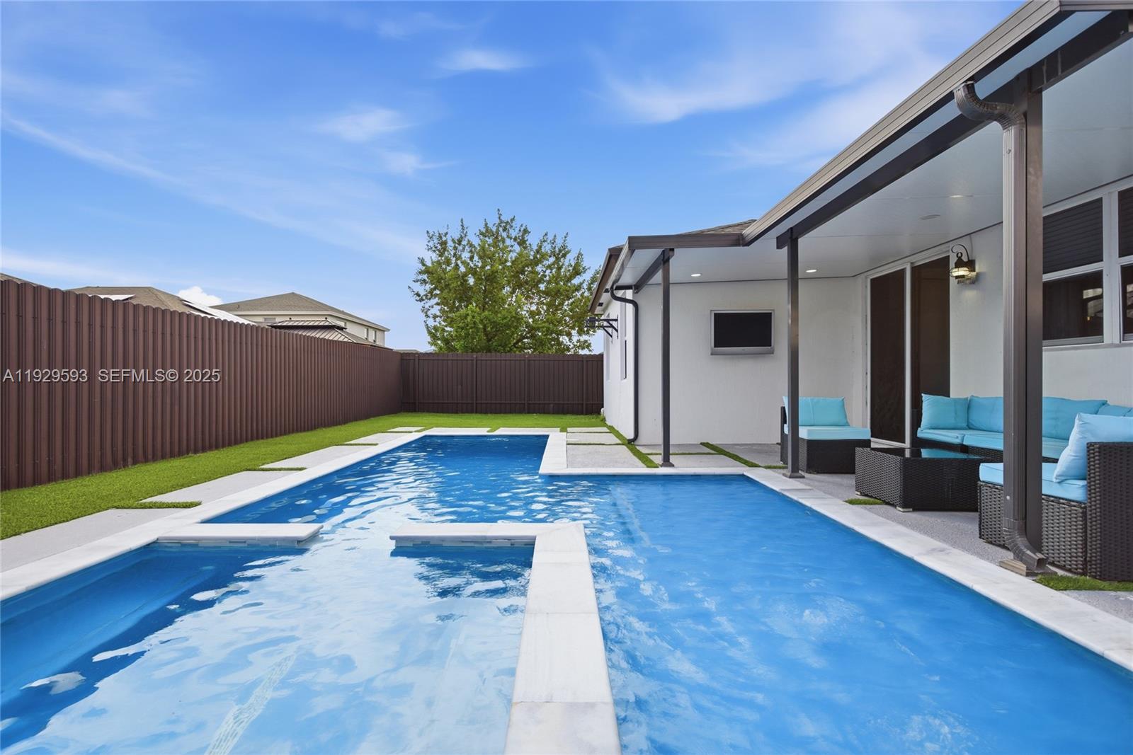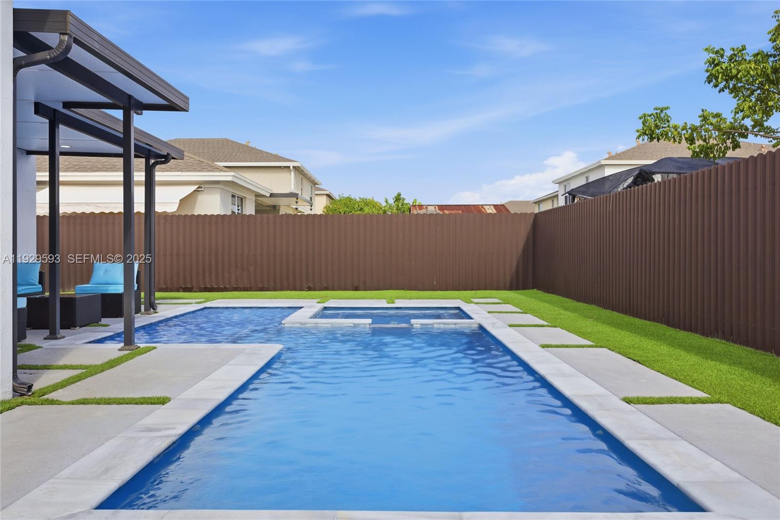Beautiful 2018 one-story modern pool home offers a functional open layout designed for comfortable everyday living and easy entertaining. The open-concept living and dining area is bright and welcoming, creating a natural flow throughout the home.The kitchen features quartz countertops, stainless steel appliances, and a large pantry, and overlooks the main living space, making it ideal for gatherings and daily routines. The home includes 4 bedrooms and 2 full bathrooms, offering flexibility for family, guests, or a home office. The primary suite provides a private retreat with a walk-in closet, dual sinks, a separate soaking tub, and a walk-in shower. Additional bedrooms are well sized and adaptable to various needs.The backyard is designed for low maintenance and year-round enjoyment, featuring a modern pool surrounded by artificial turf and a covered patio ideal for outdoor dining, entertaining, or relaxing. Additional features include a fully paved oversized driveway, side driveway suitable for an RV or boat, a dedicated laundry room, and a 2-car garage. Built in 2018 and located in a no-HOA community, this home is conveniently located near Homestead Air Force Base, the Florida Turnpike, and Dixie Highway, with shops and restaurants nearby.